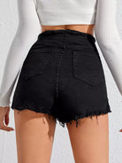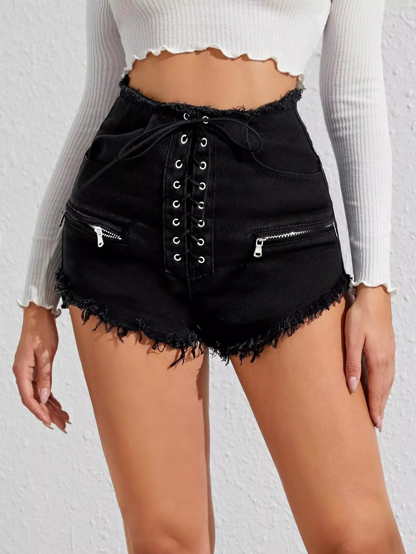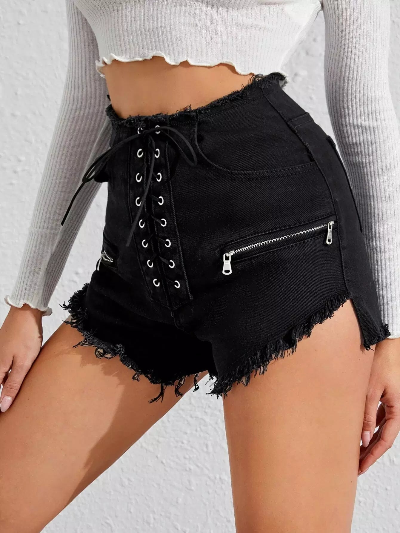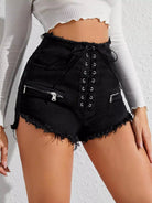 Grommet Lace-up Zip Detail Raw Hem Denim Shorts