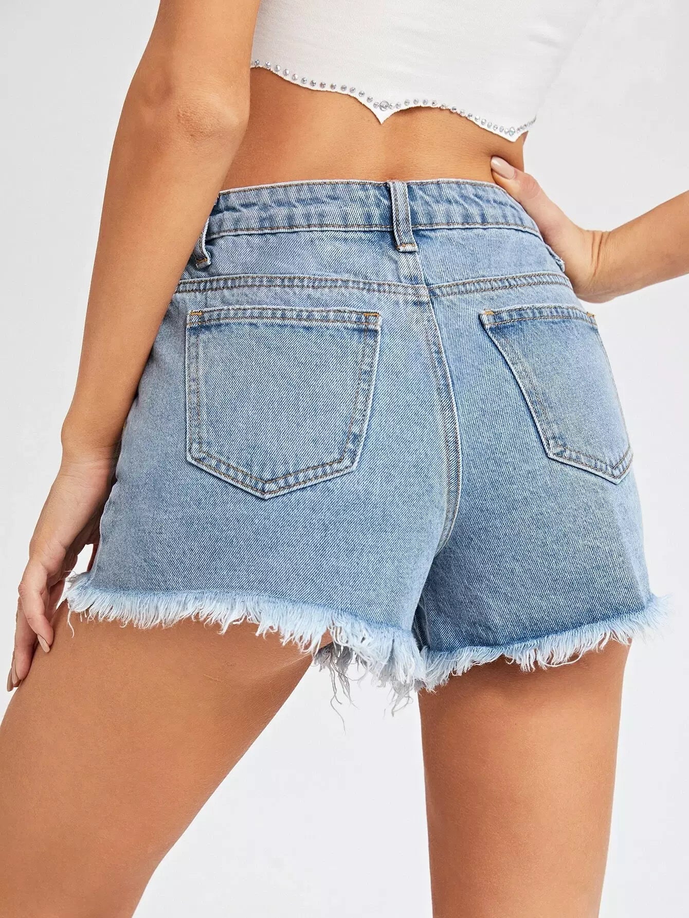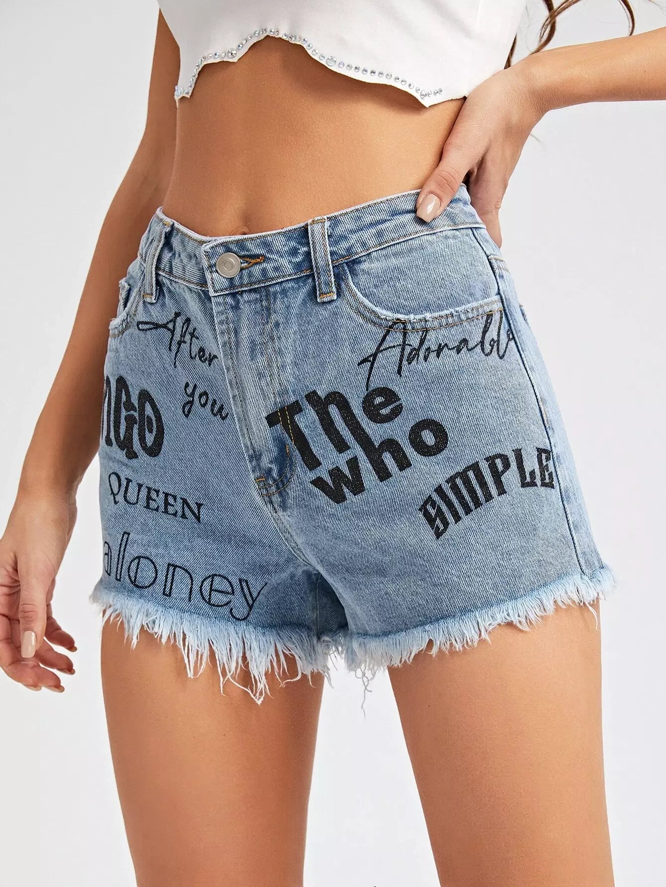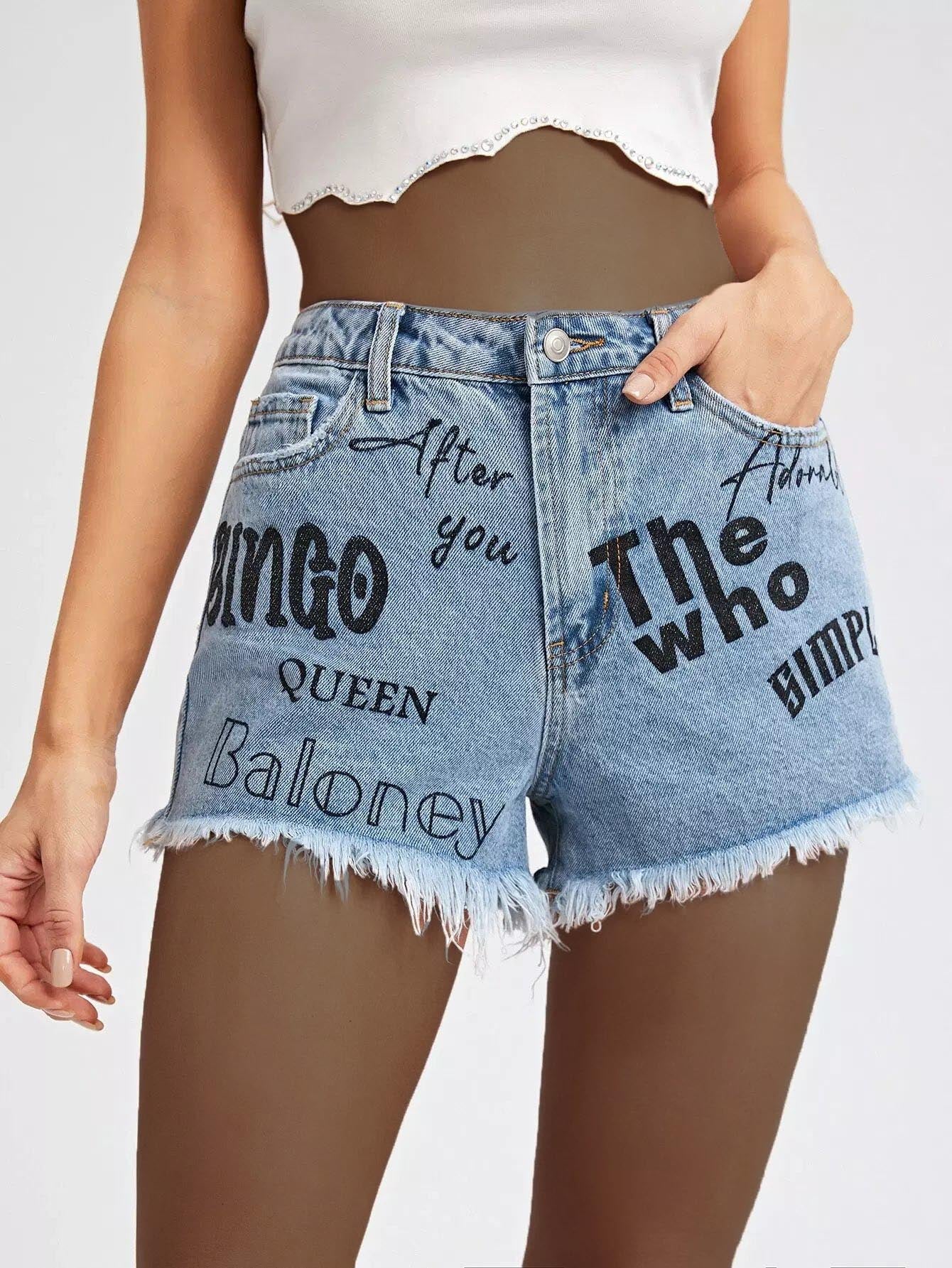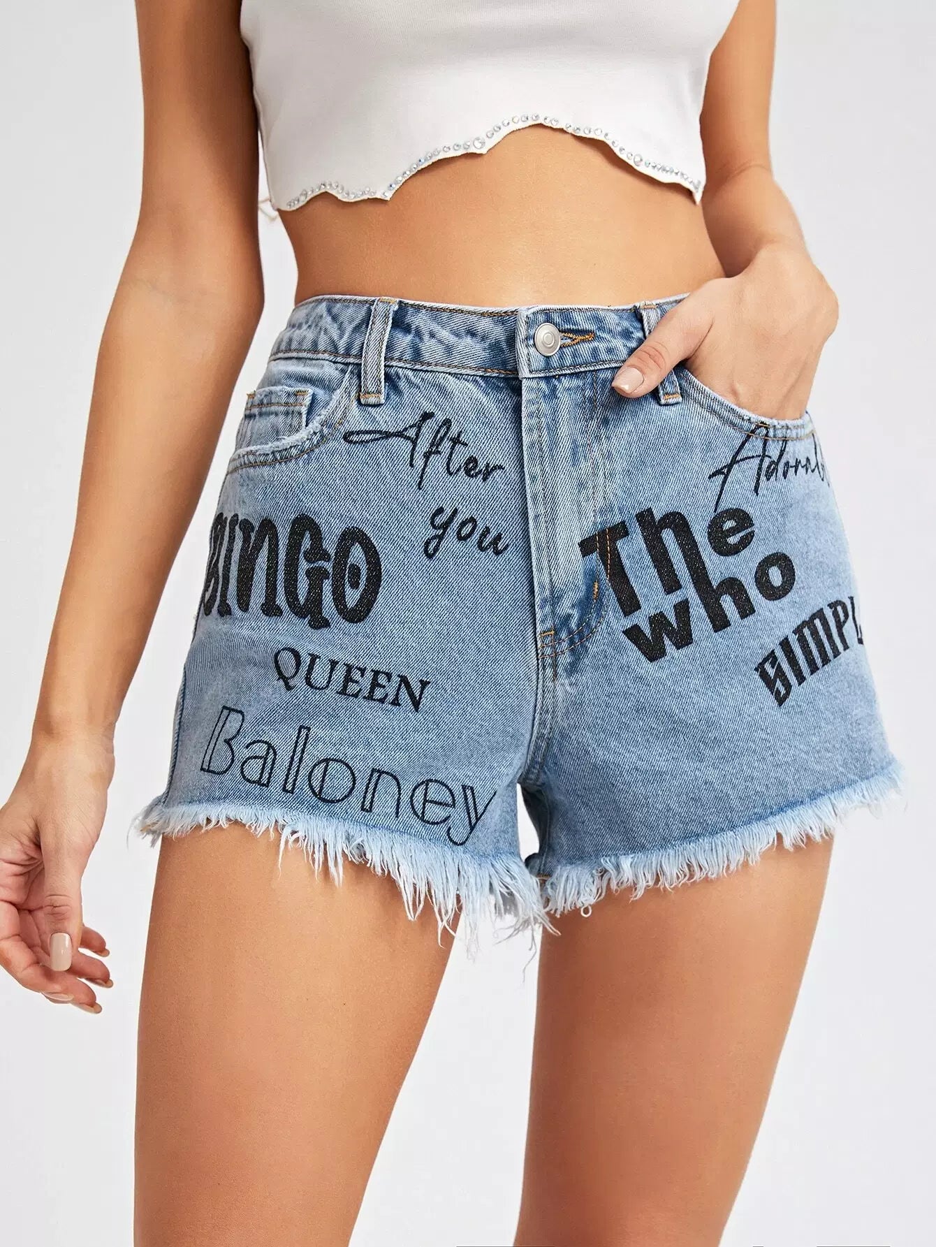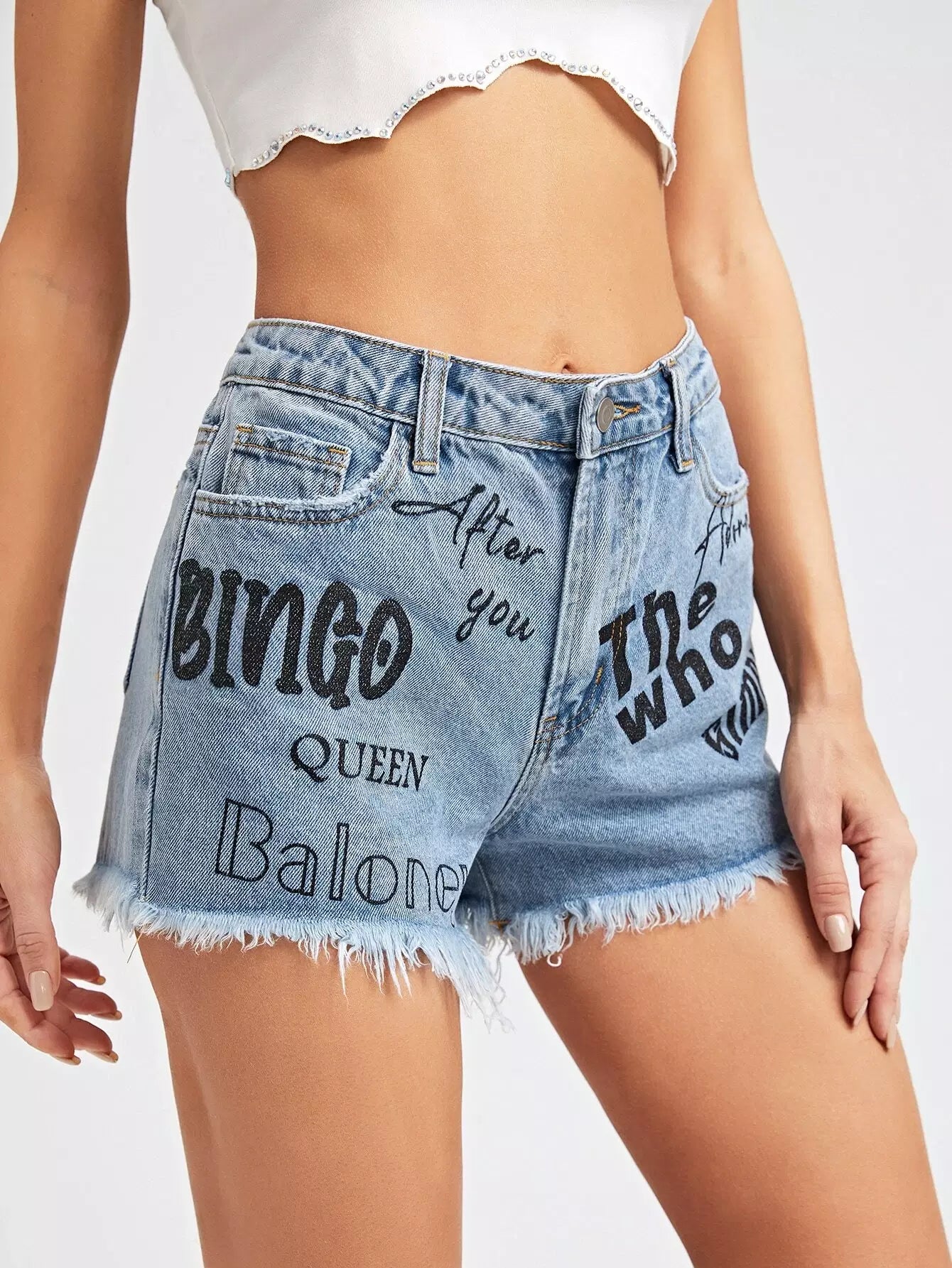 High Waist Letter Graphic Raw Hem Denim Shorts