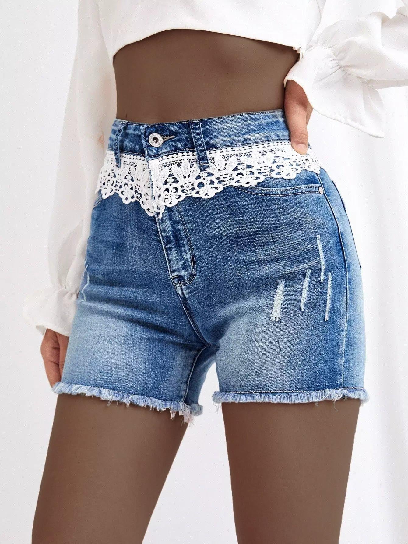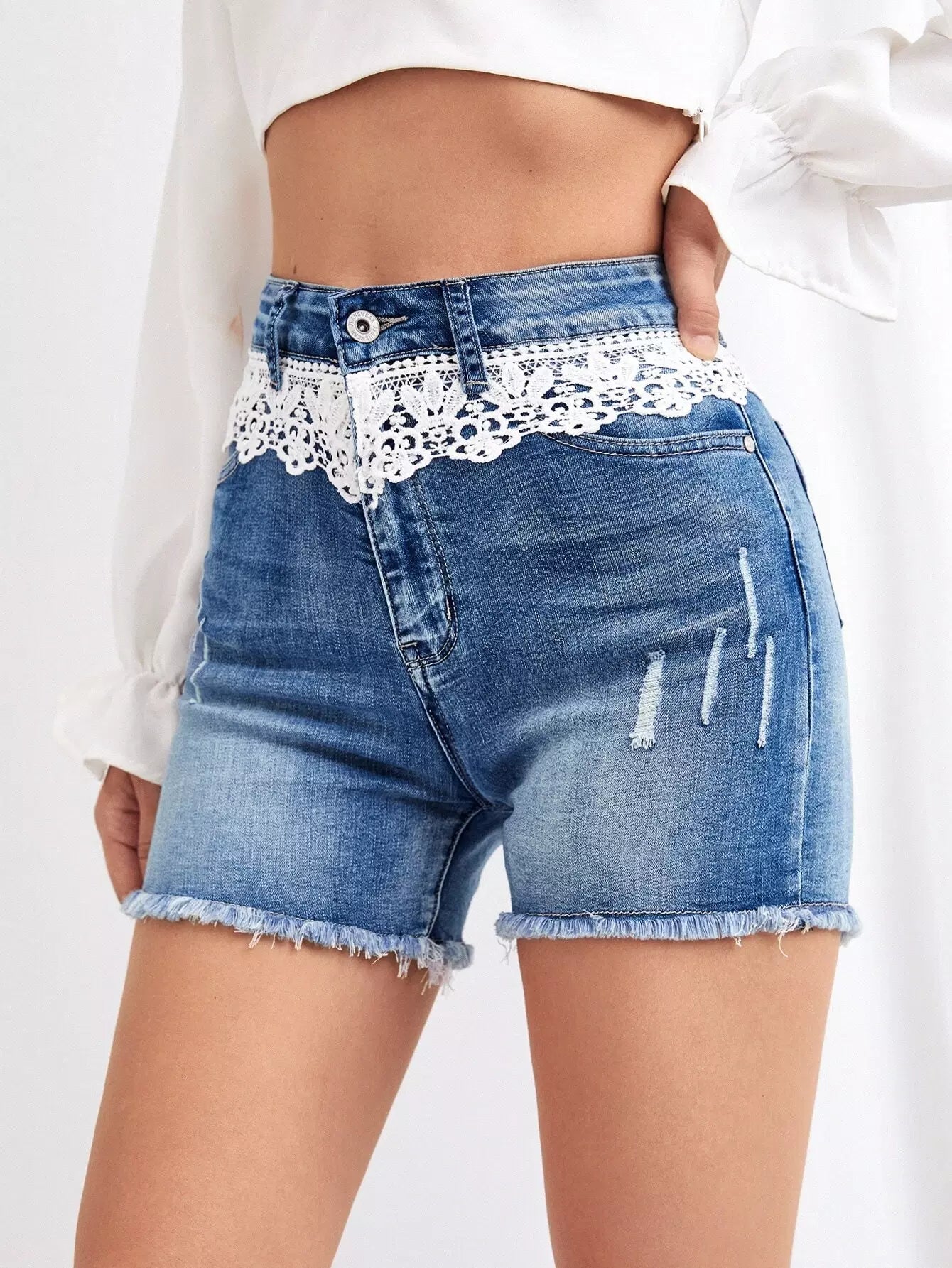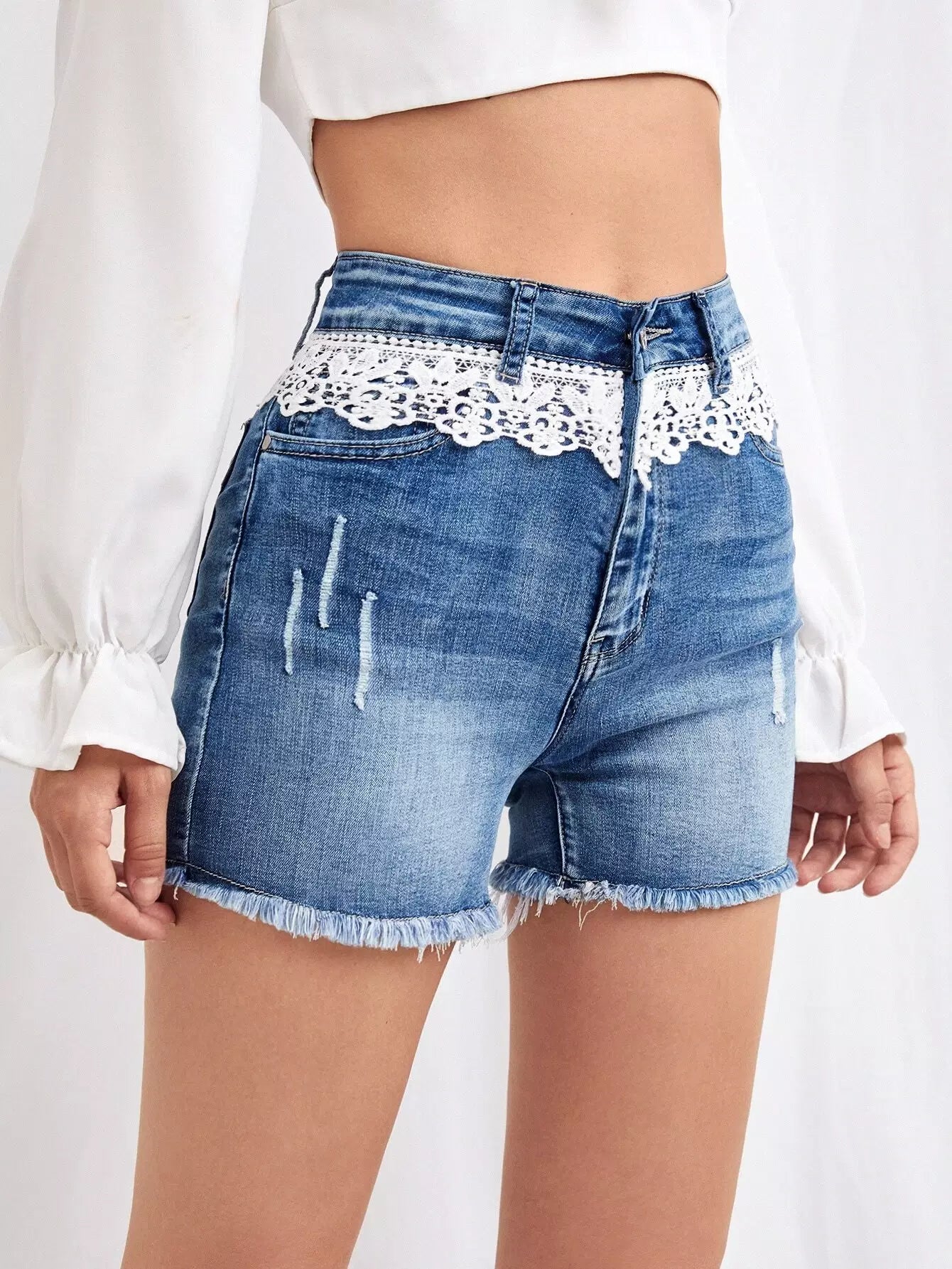 Women - Lace Trim Ripped Raw Hem Denim Shorts