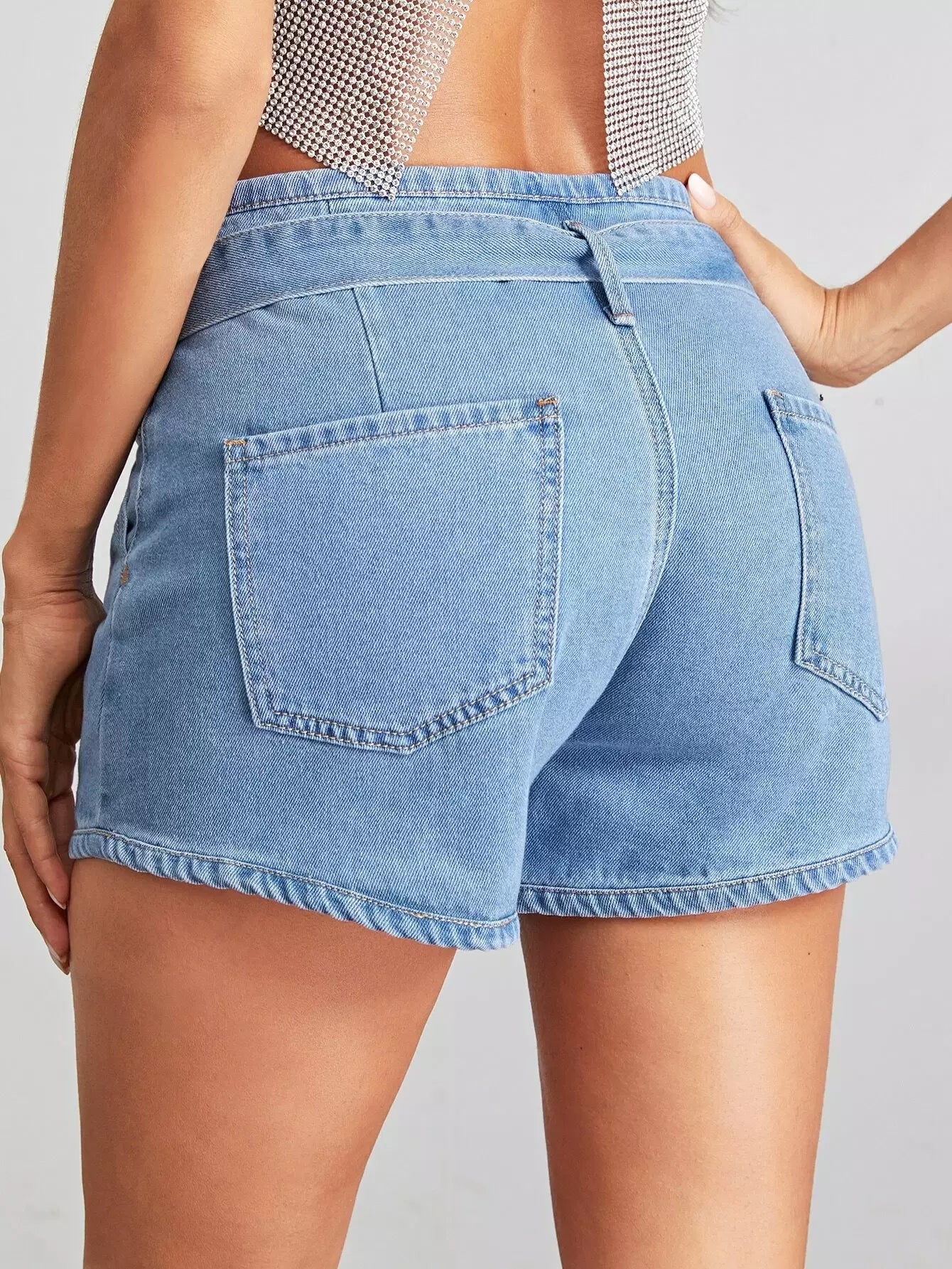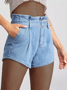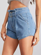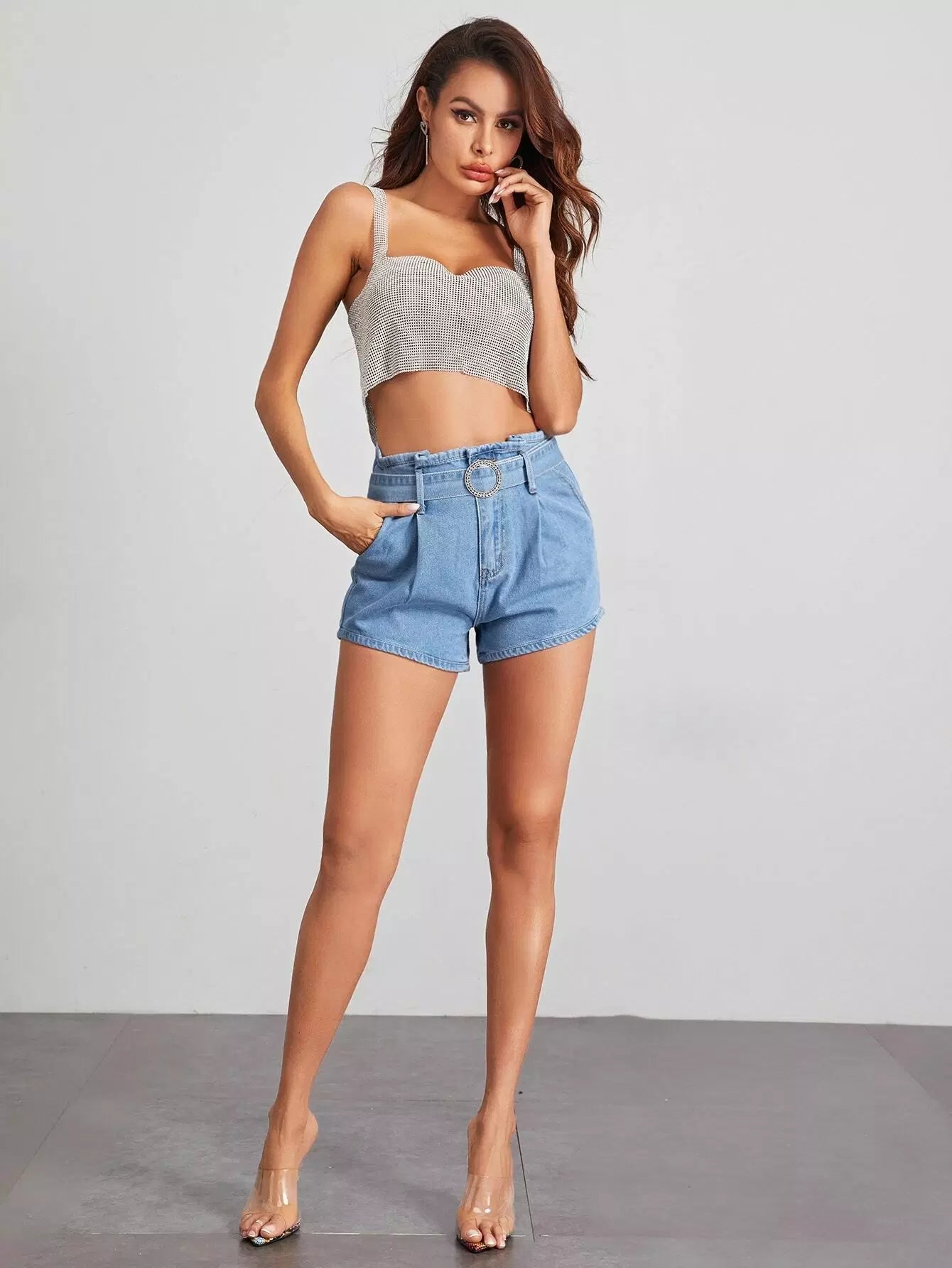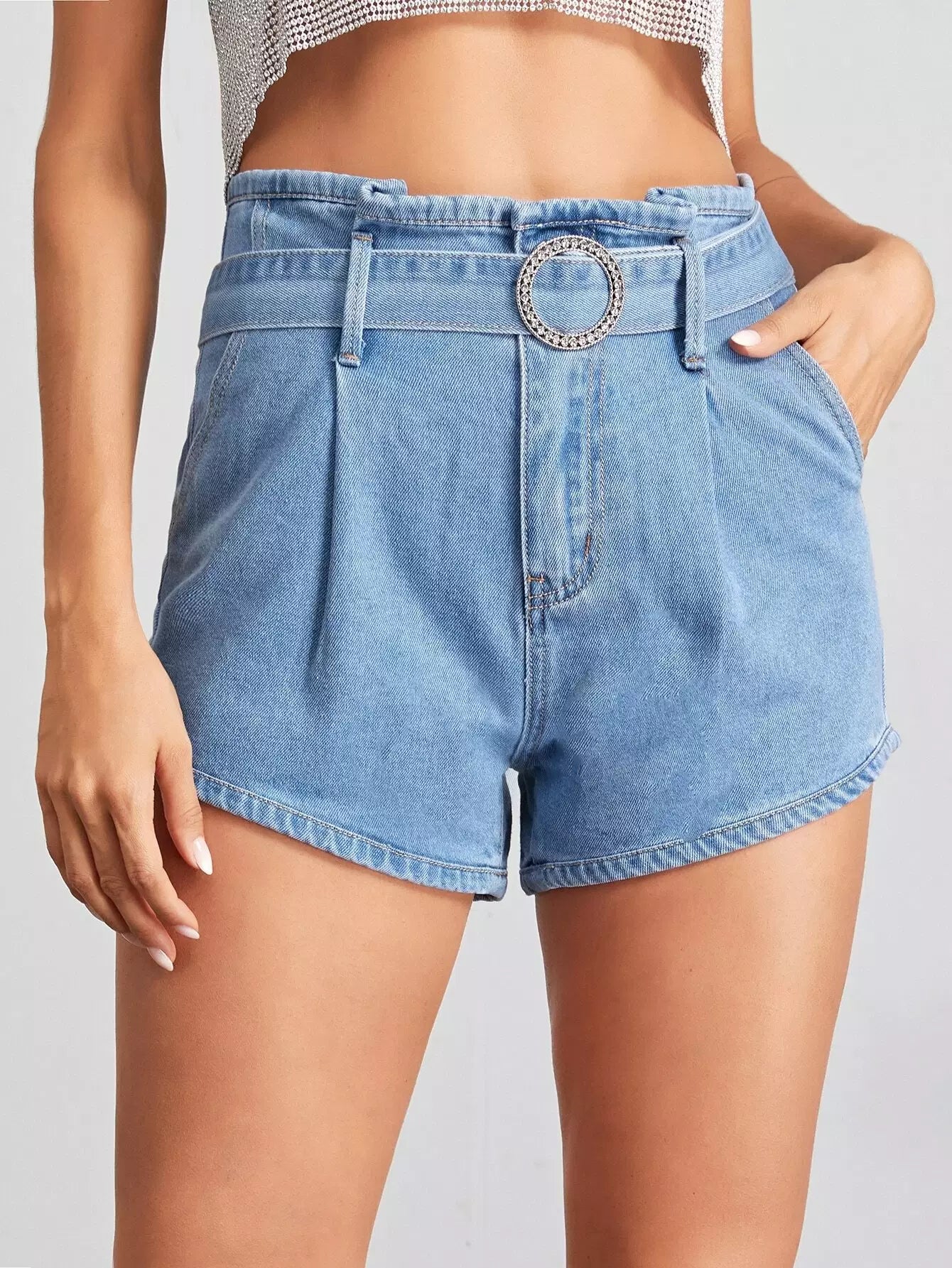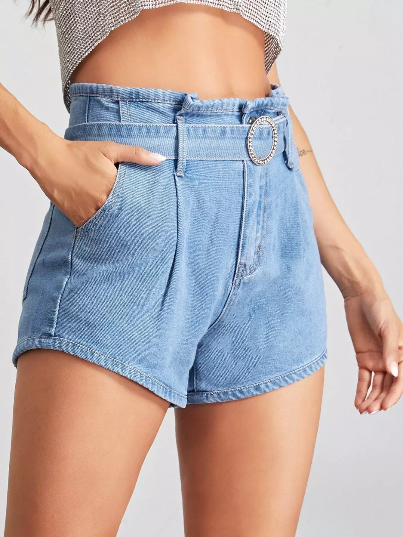 Paperbag Waist Rhinestone O-ring Buckle Denim Shorts Without Belt