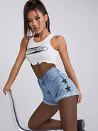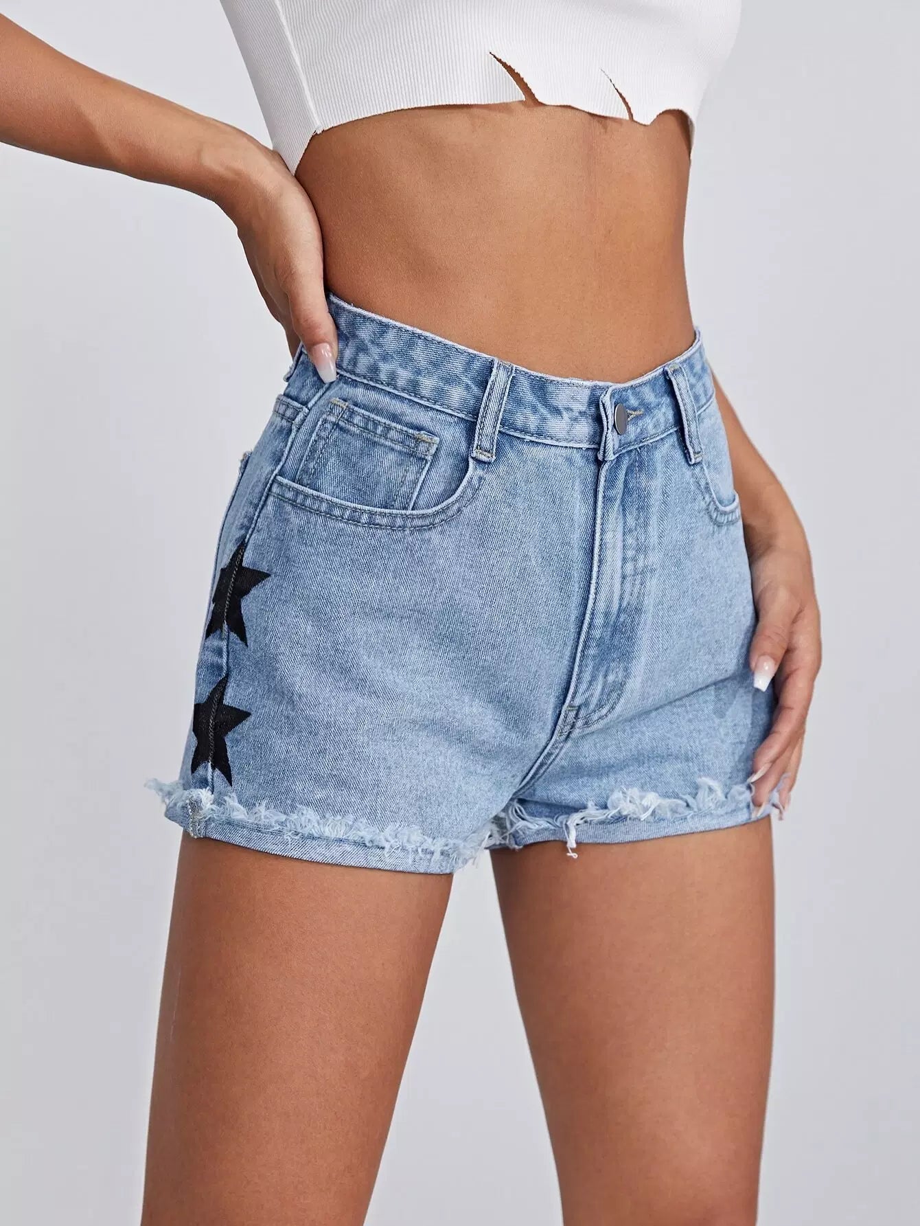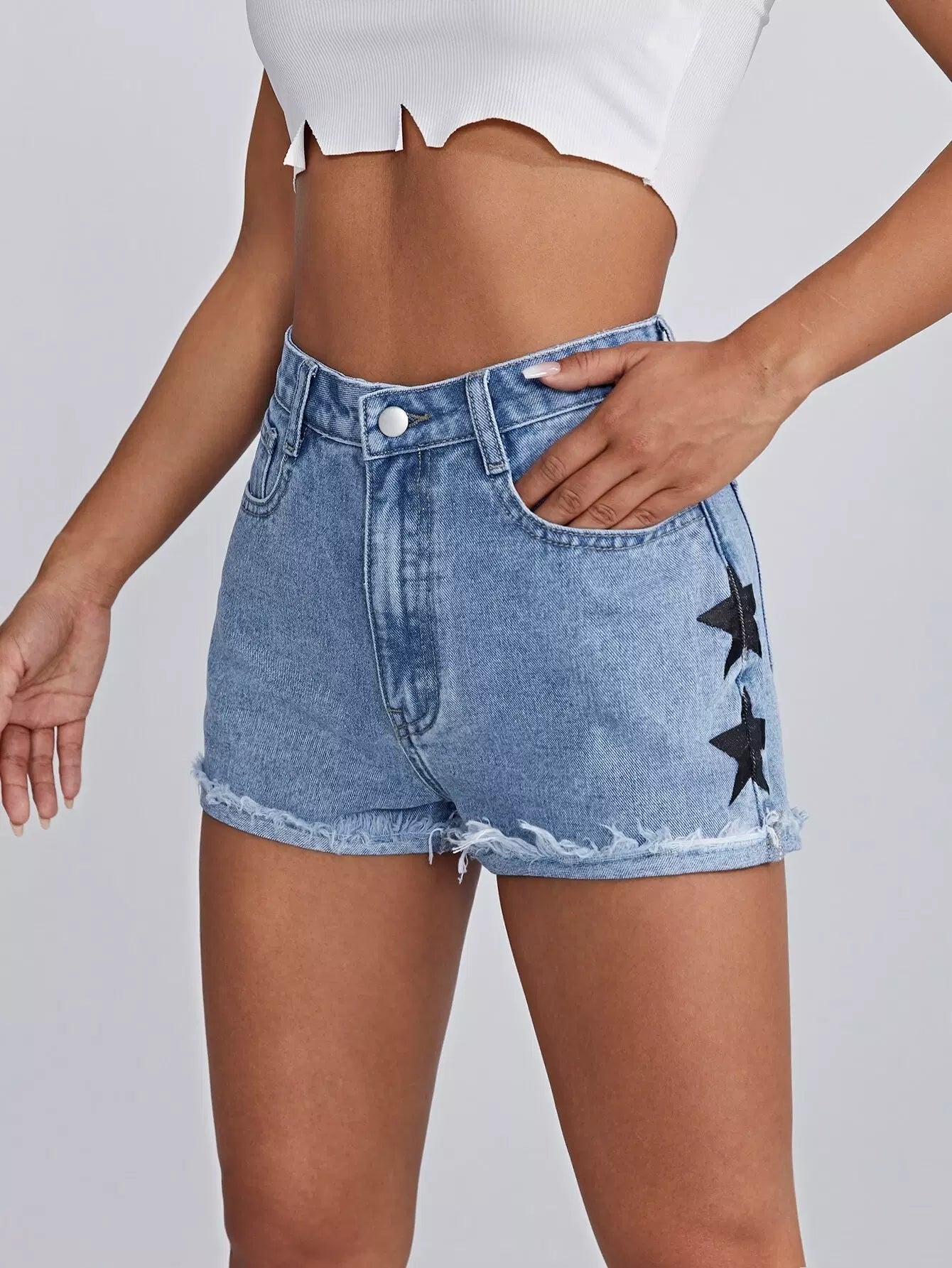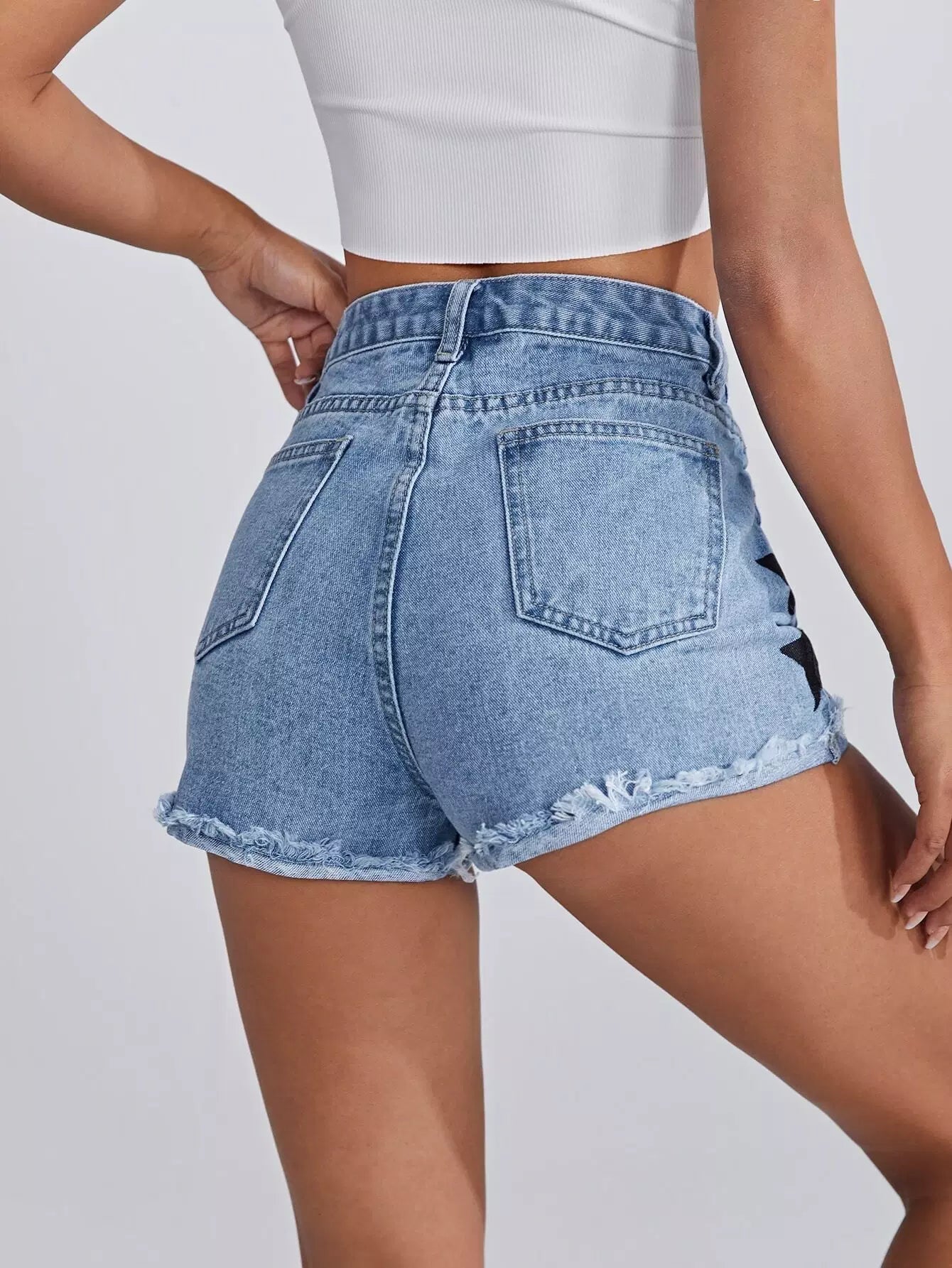 Raw Hem Star Print Denim Shorts