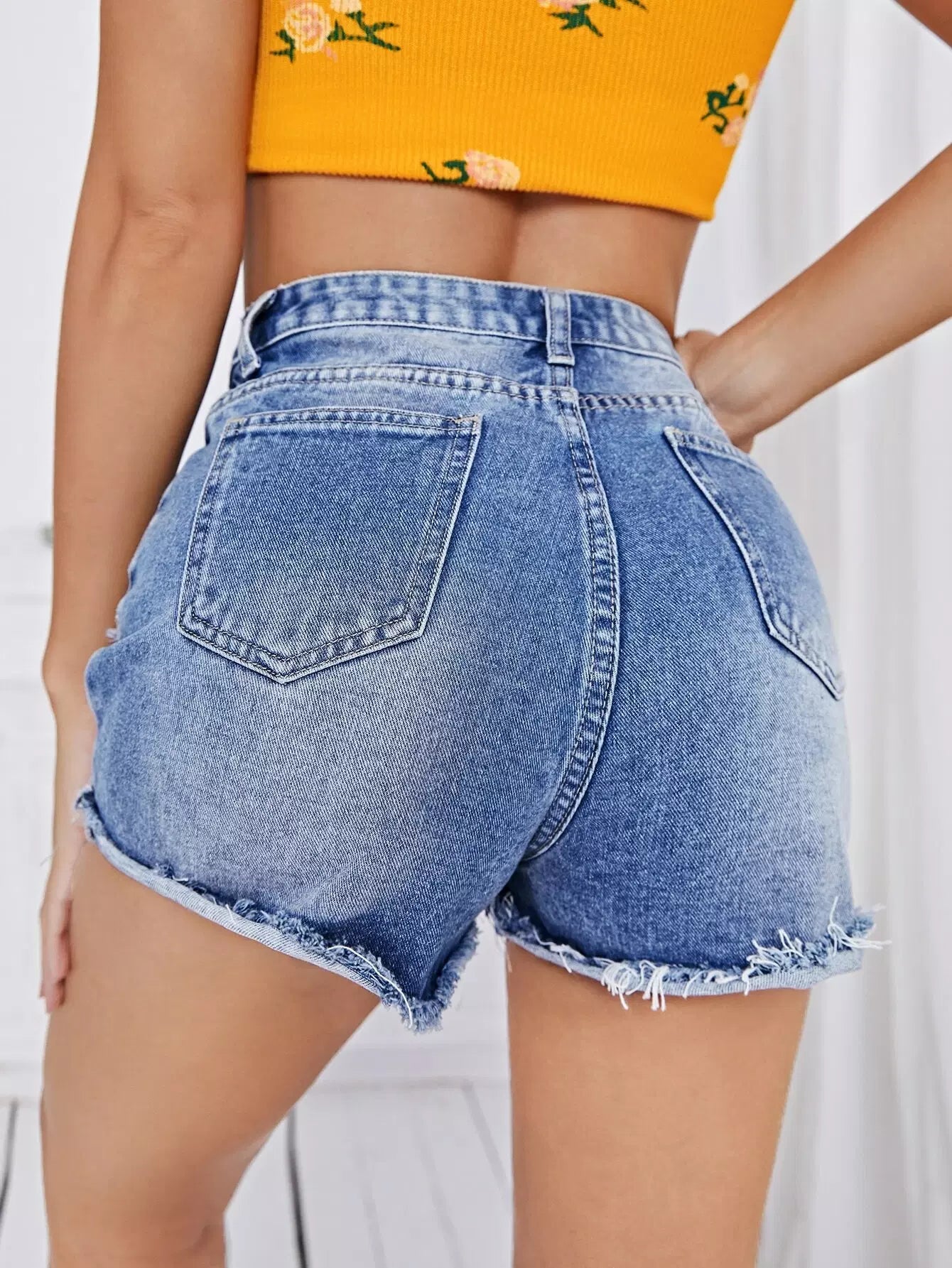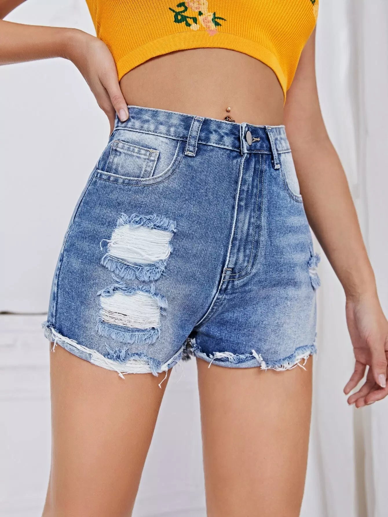 Ripped Detail Raw Hem Denim Shorts