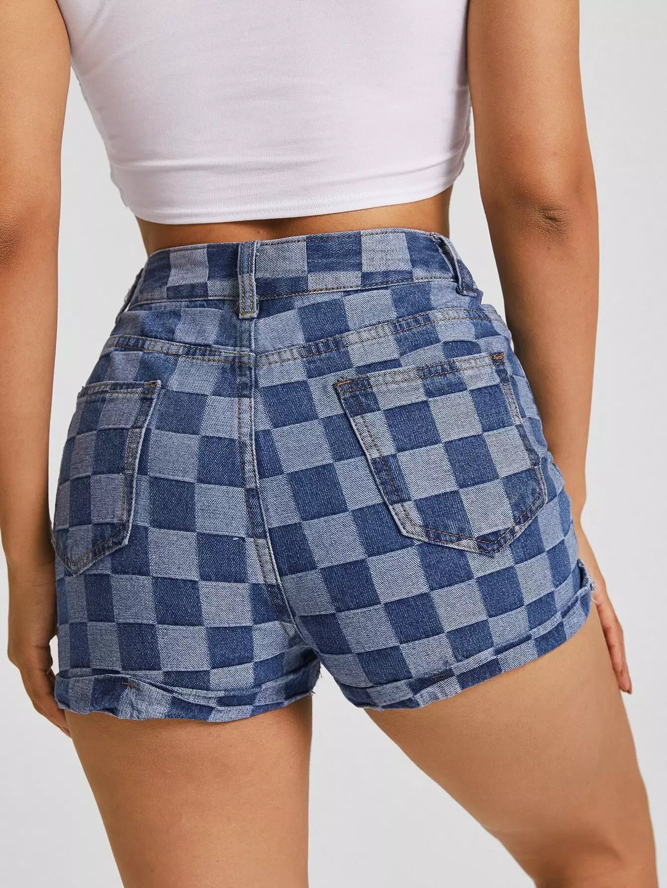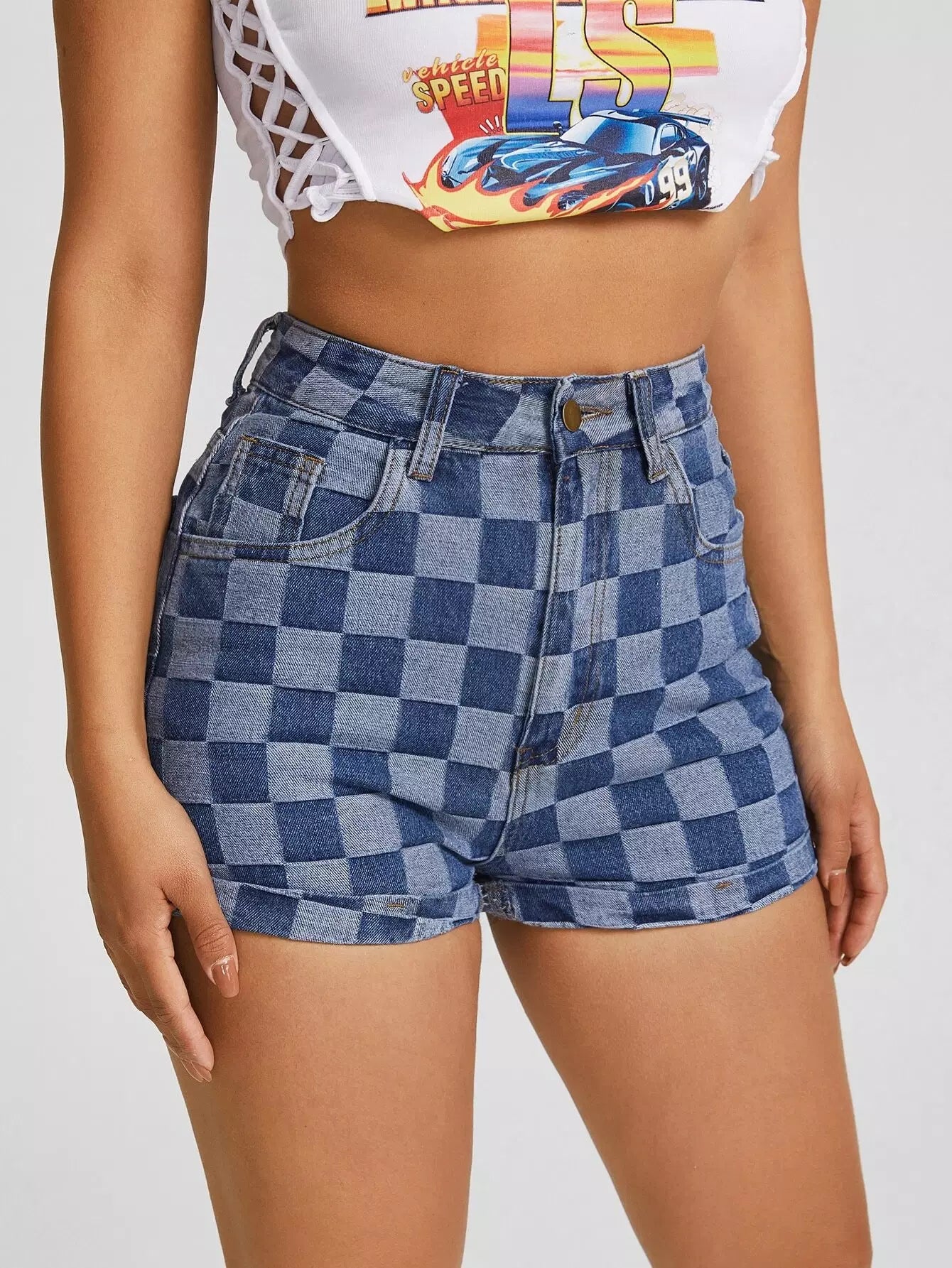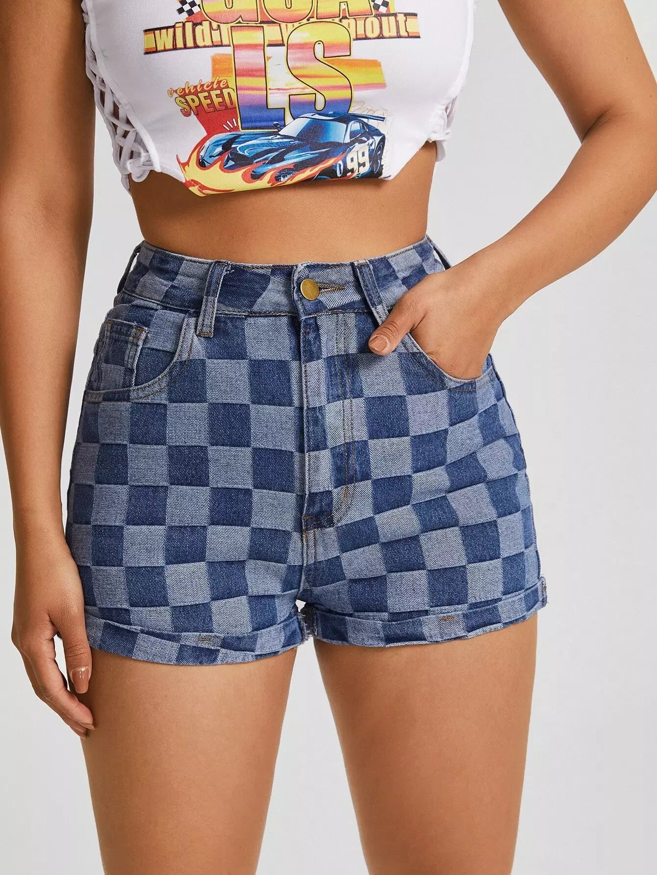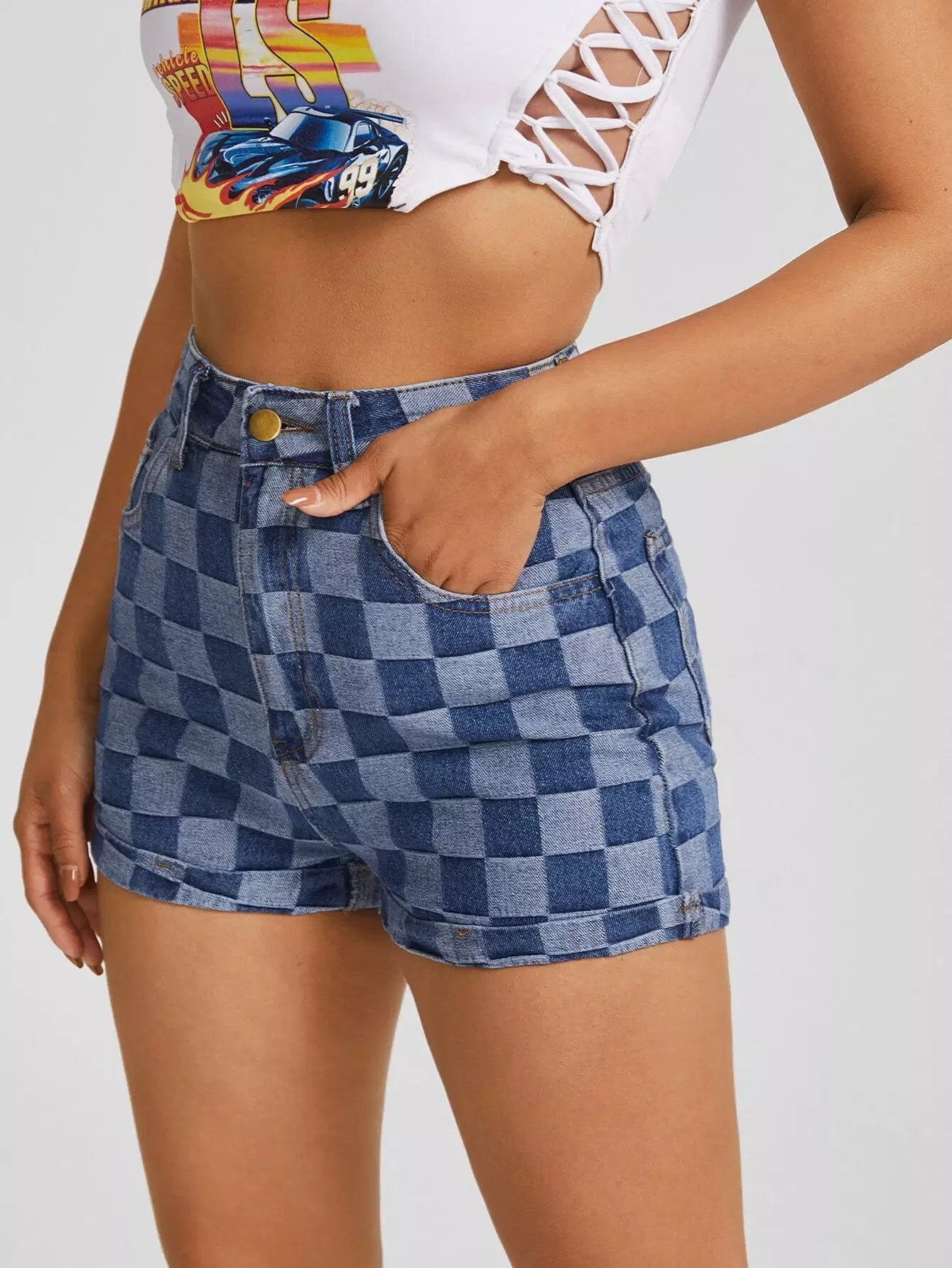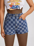 Slant Pocket Checkered Print Denim Shorts