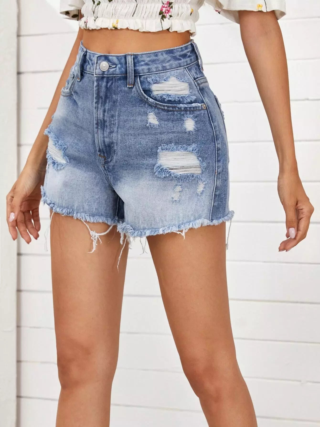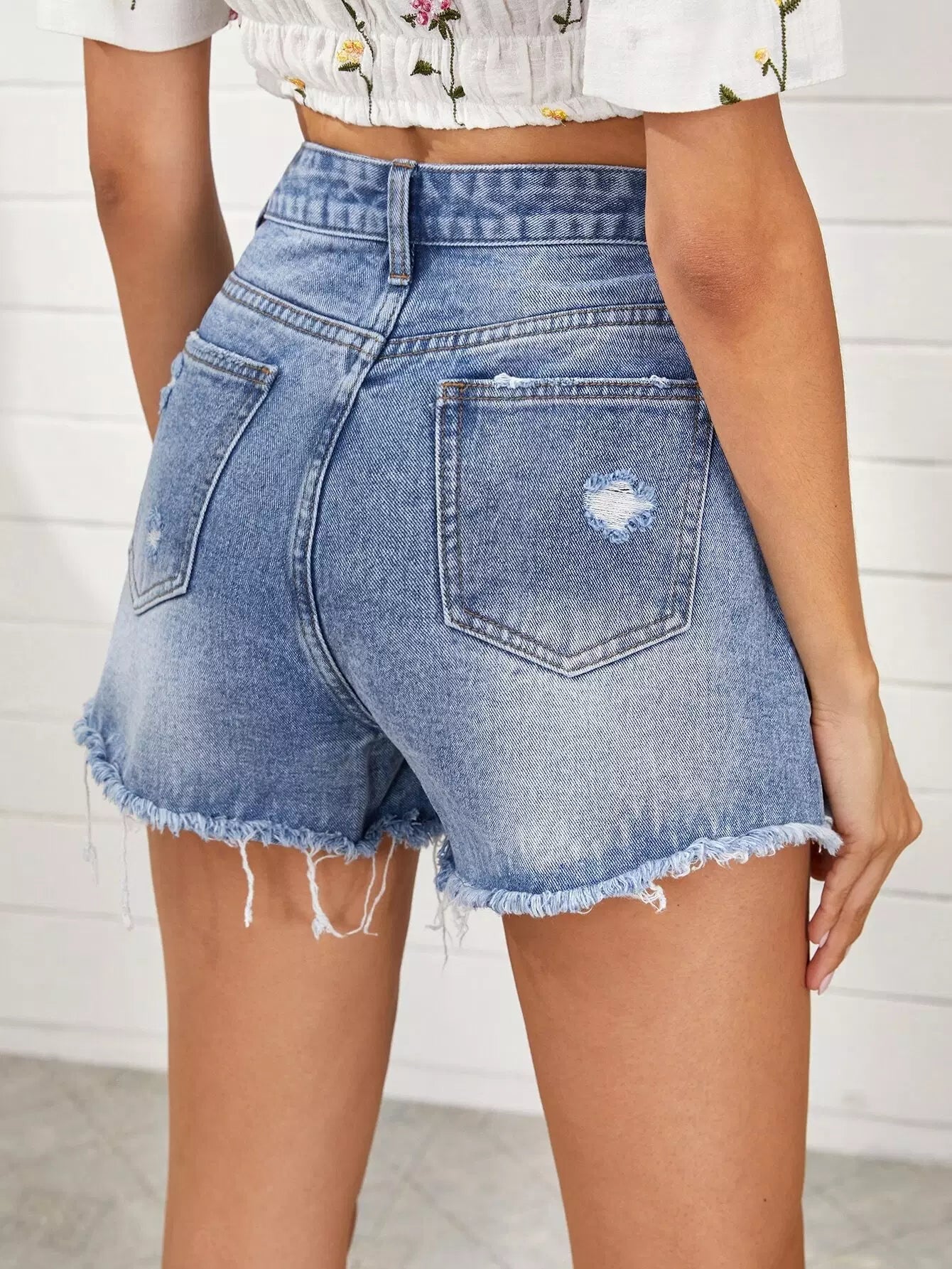 Slant Pocket Raw Hem Ripped Denim Shorts