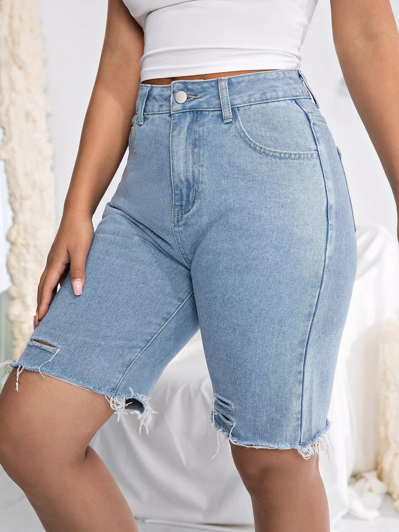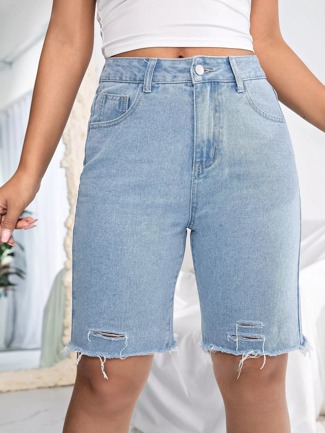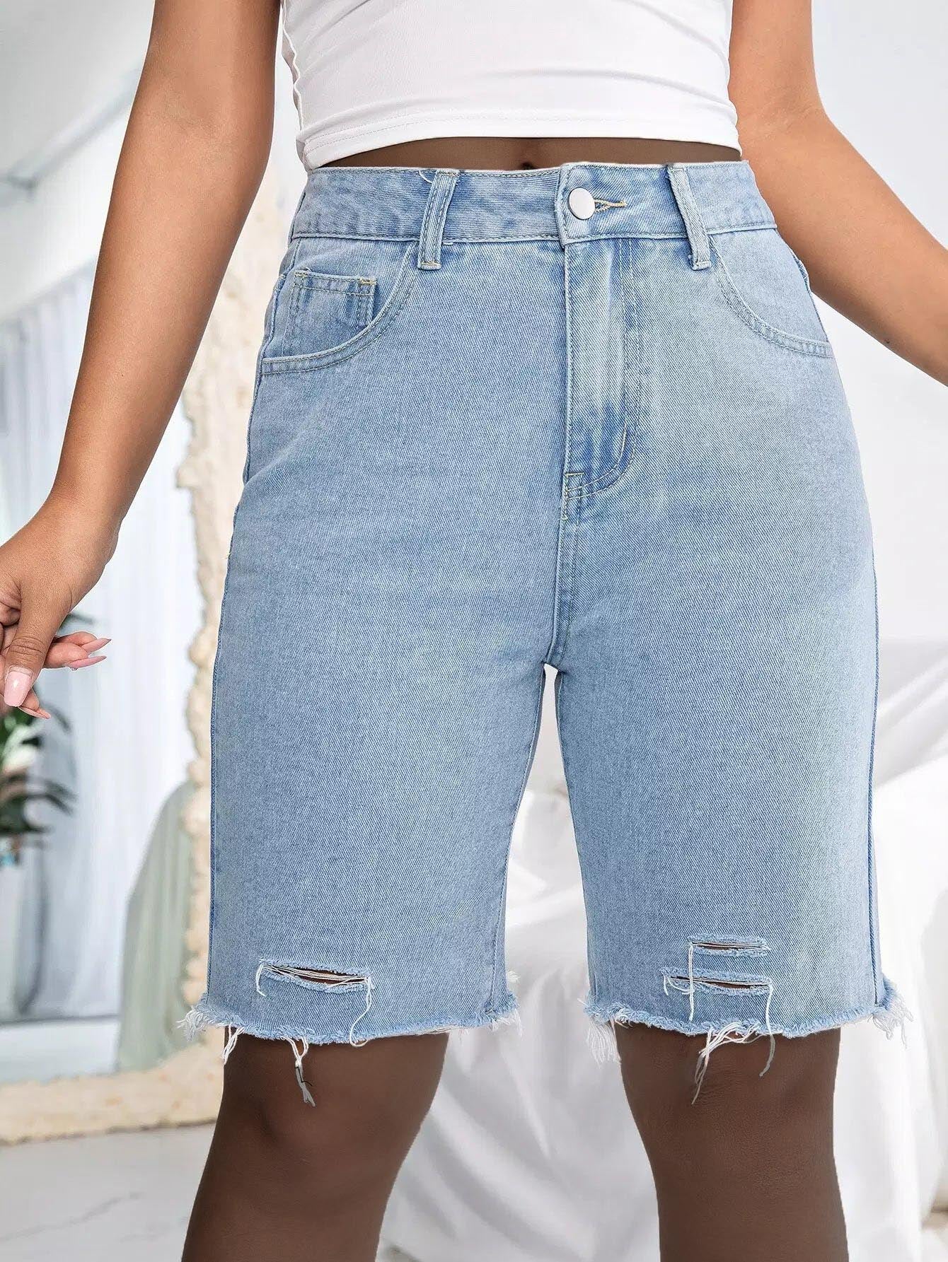 Solid Ripped Raw Hem Denim Shorts