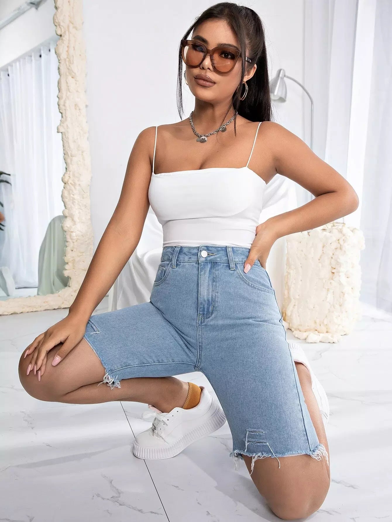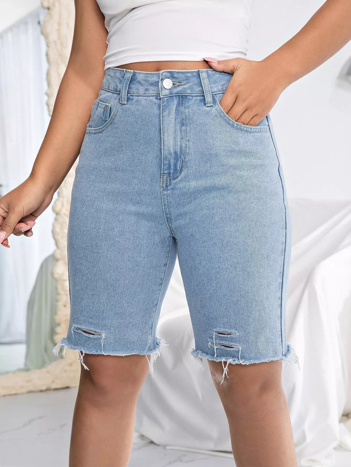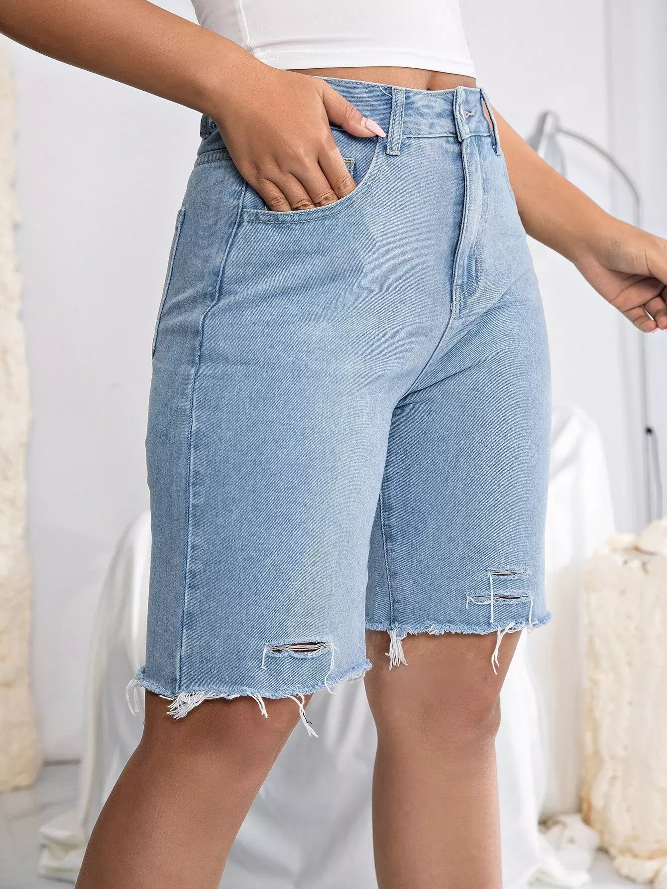 Solid Ripped Raw Hem Denim Shorts