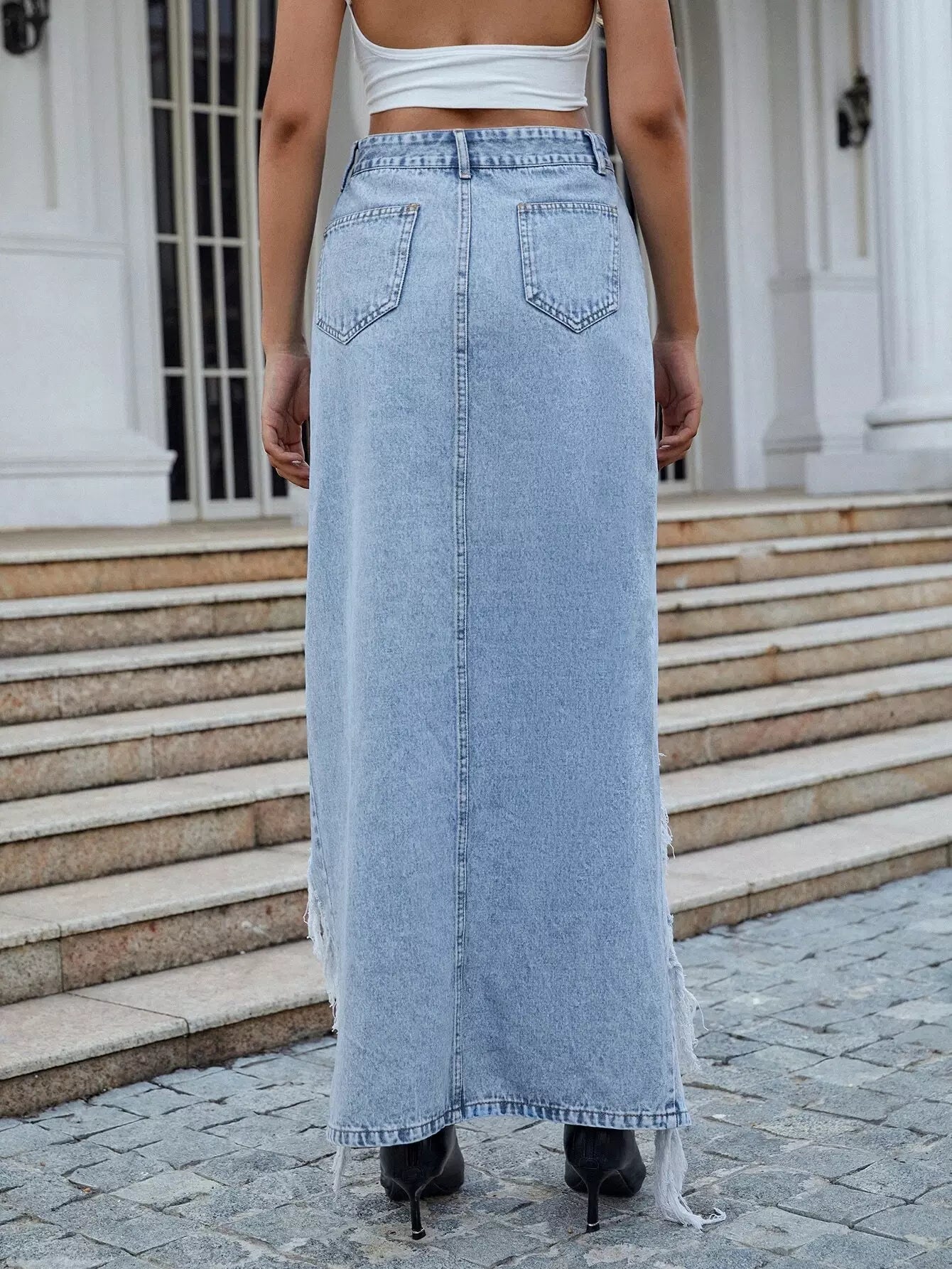 High Waist Ripped Frayed Asymmetrical Hem Denim Skirt