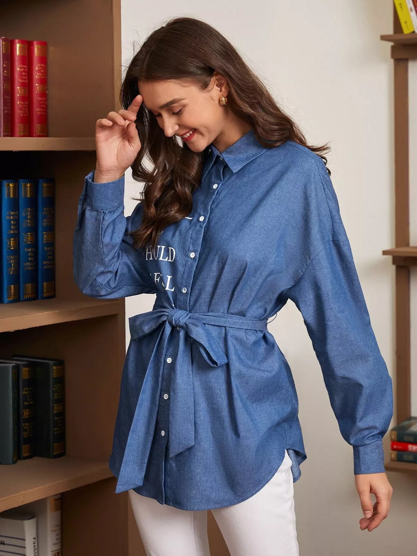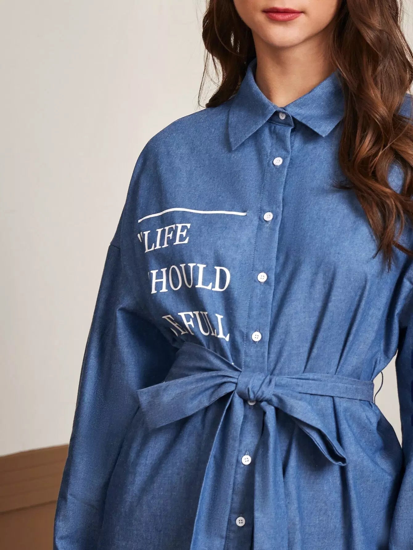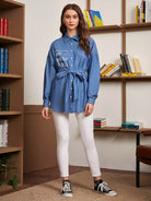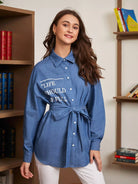 Slogan Graphic Drop Shoulder Self Denim Blouse Without Belt