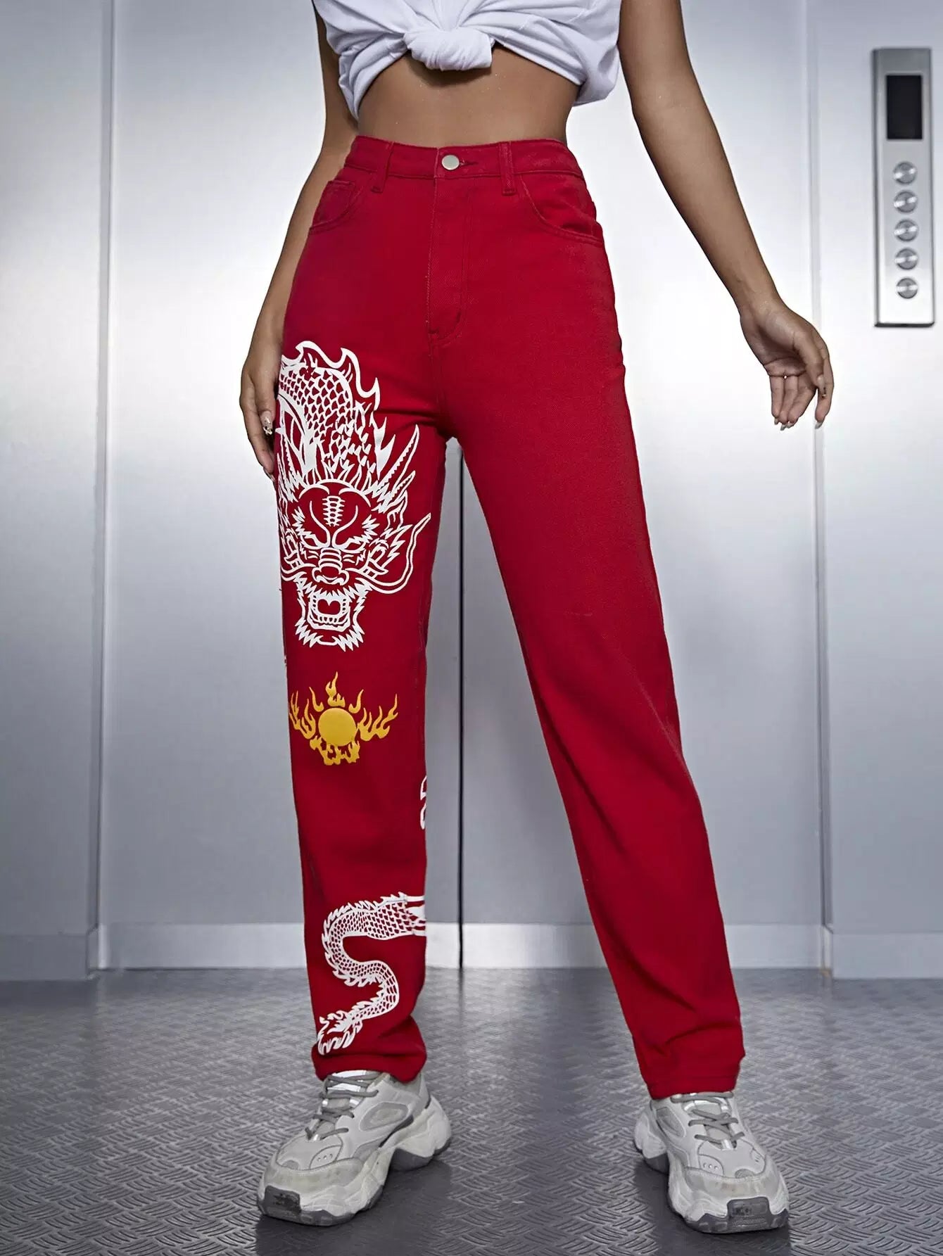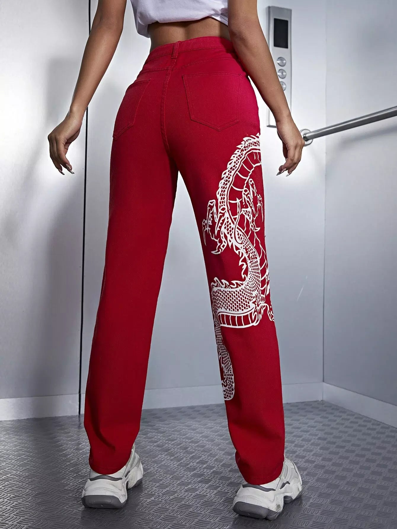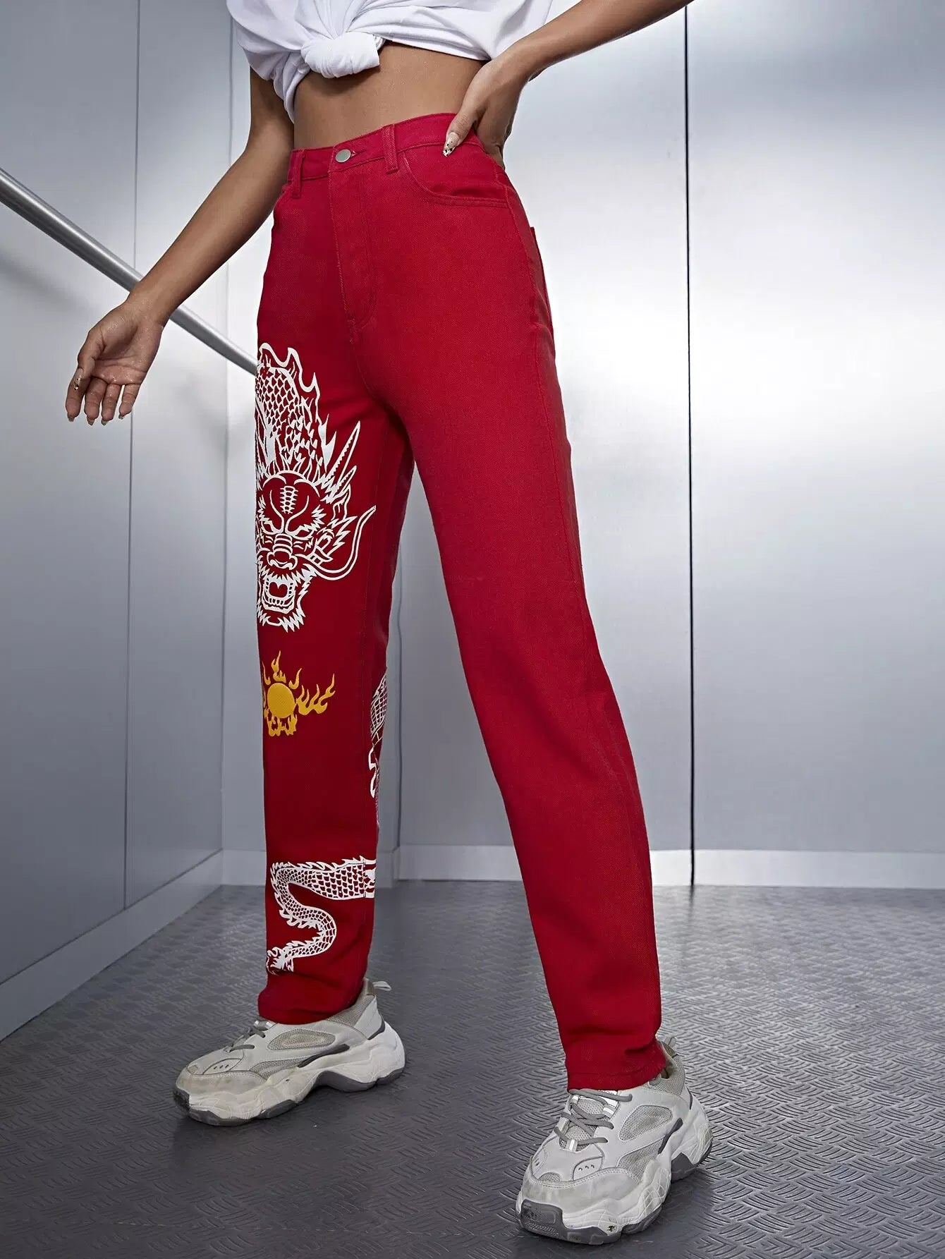 Women - Chinese Dragon and Fire Print Straight Leg Jeans