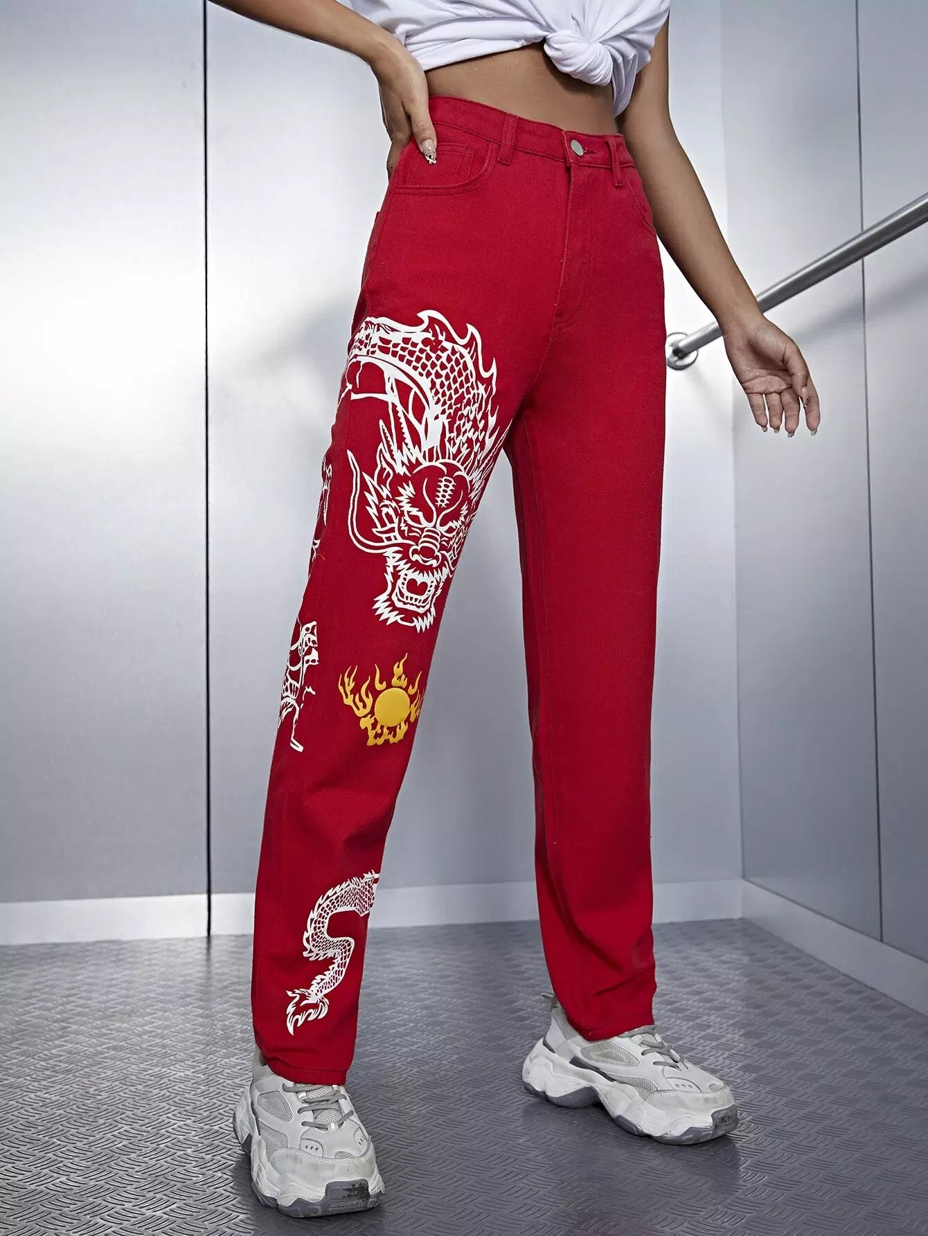 Chinese Dragon and Fire Print Straight Leg Jeans