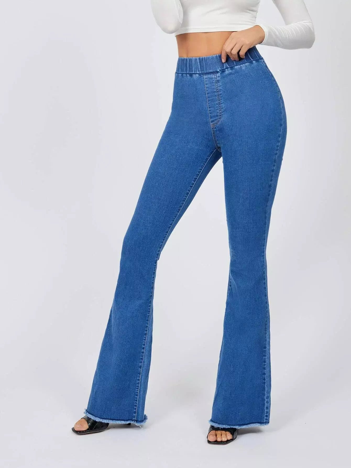 Elastic Waist Raw Hem Flare Leg Jeans