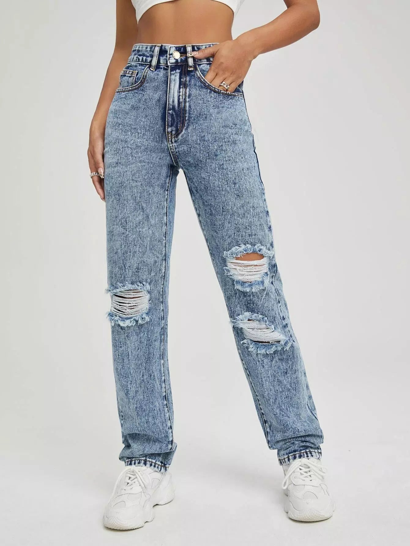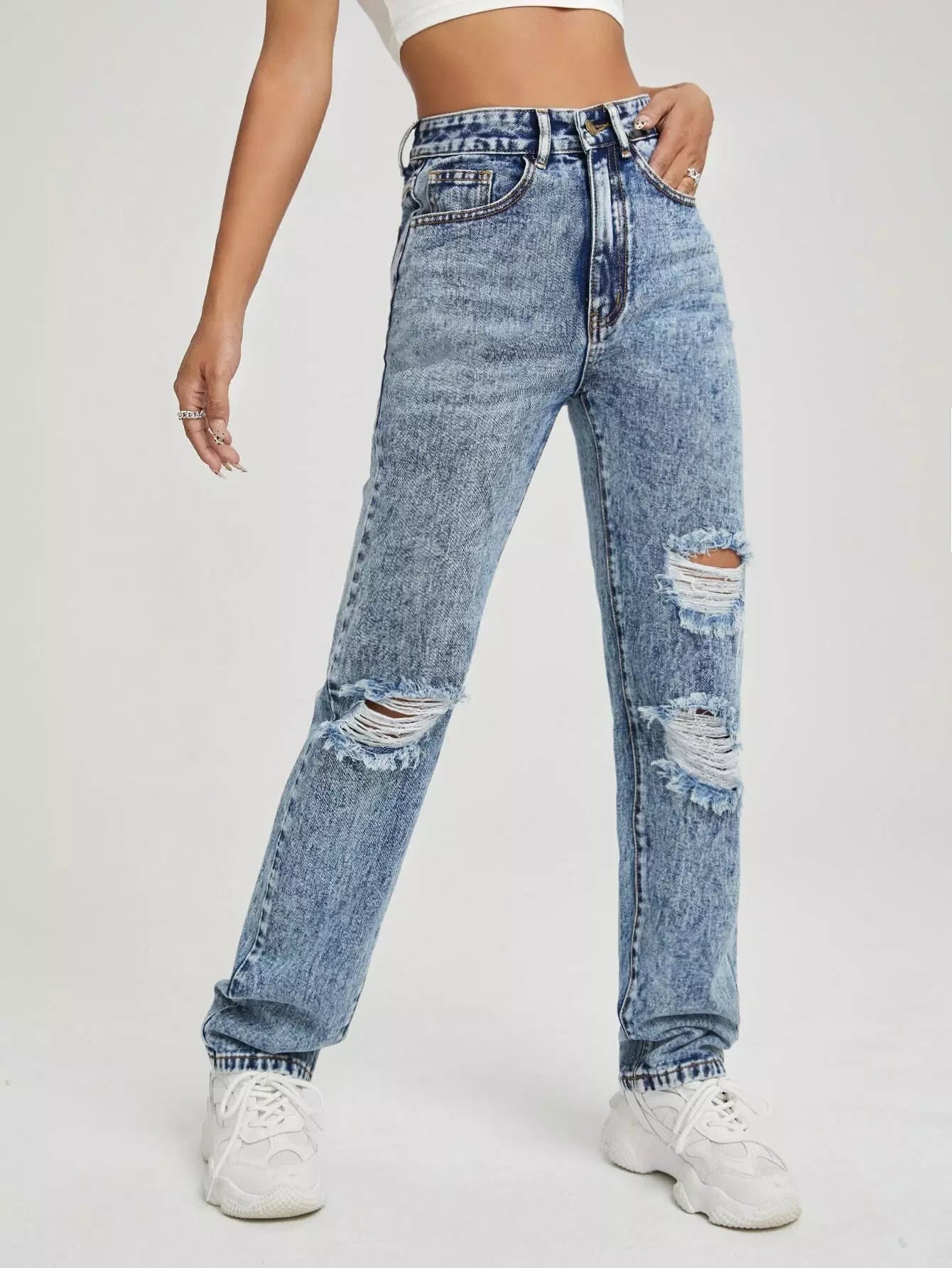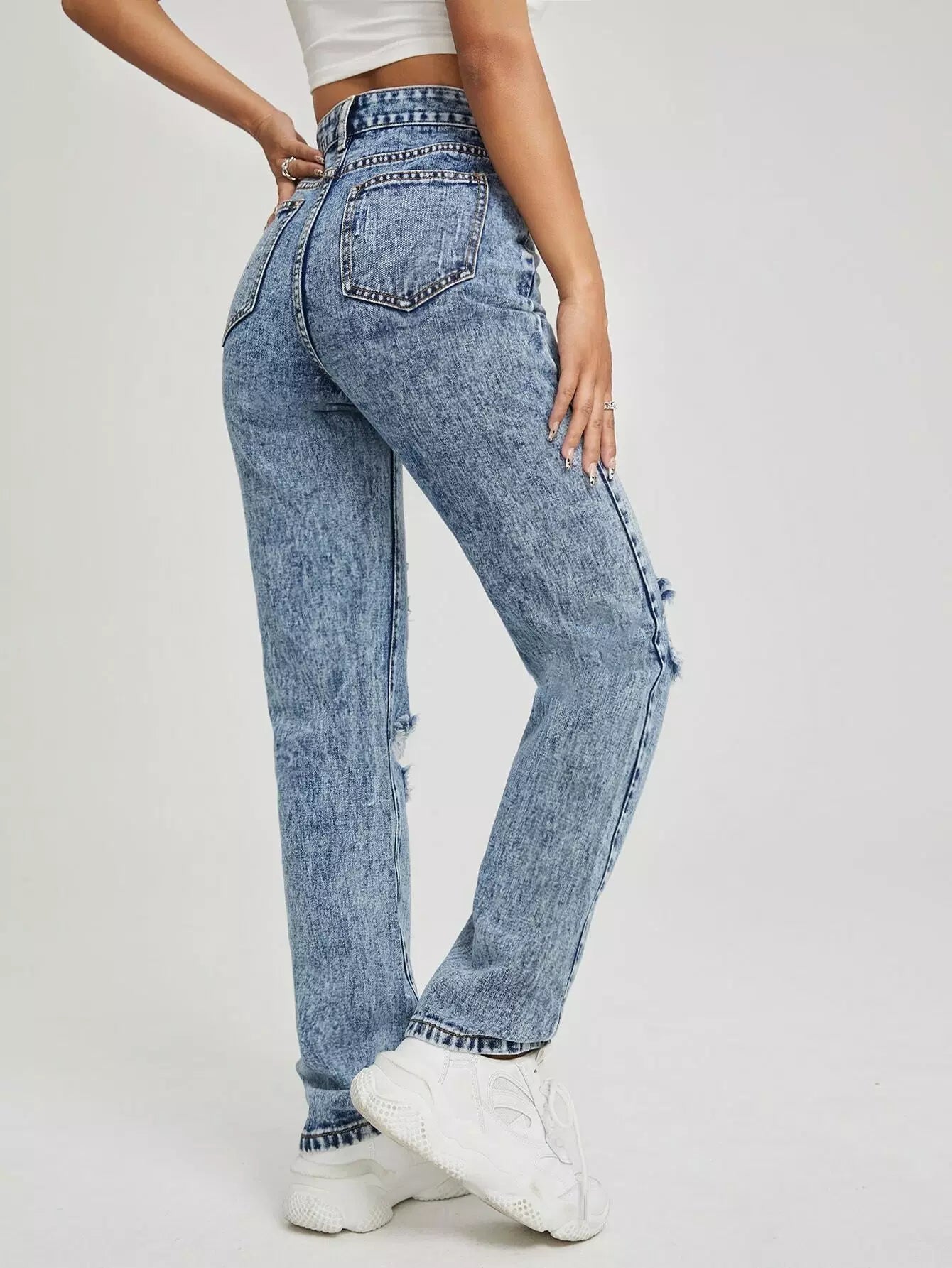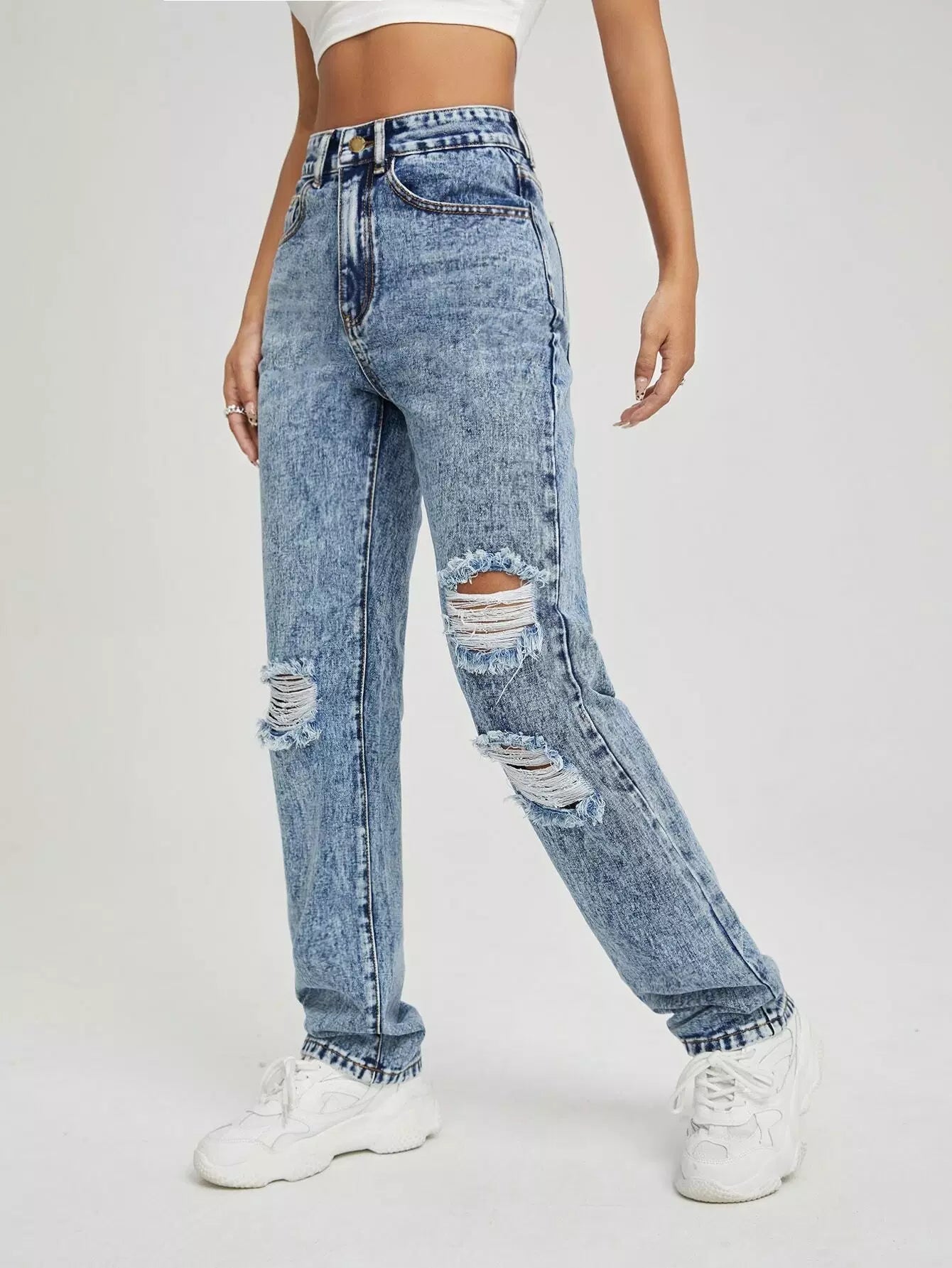 High Waist Ripped Straight Leg Jeans
