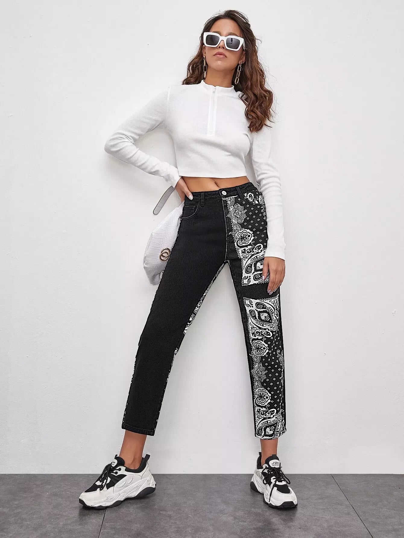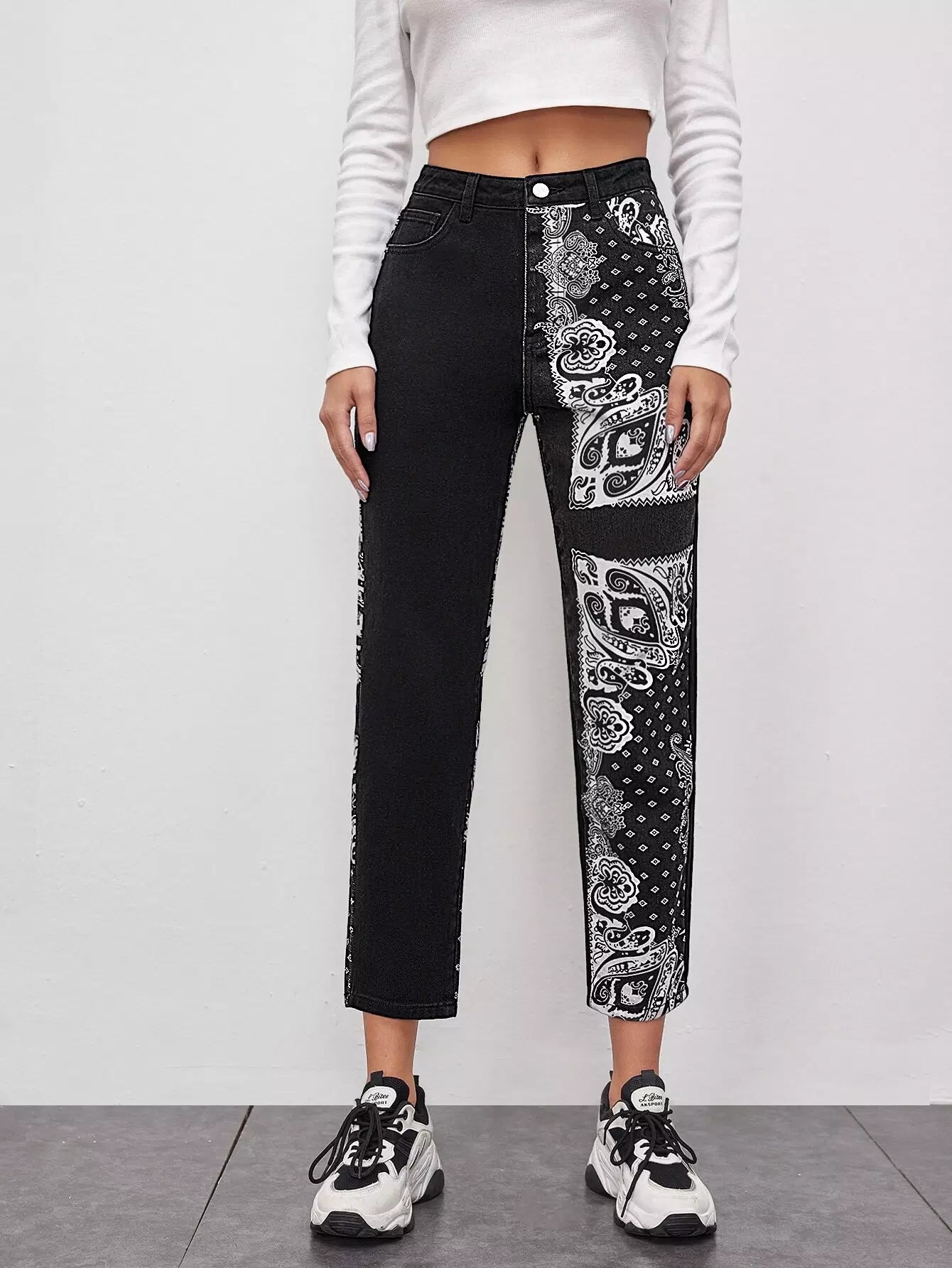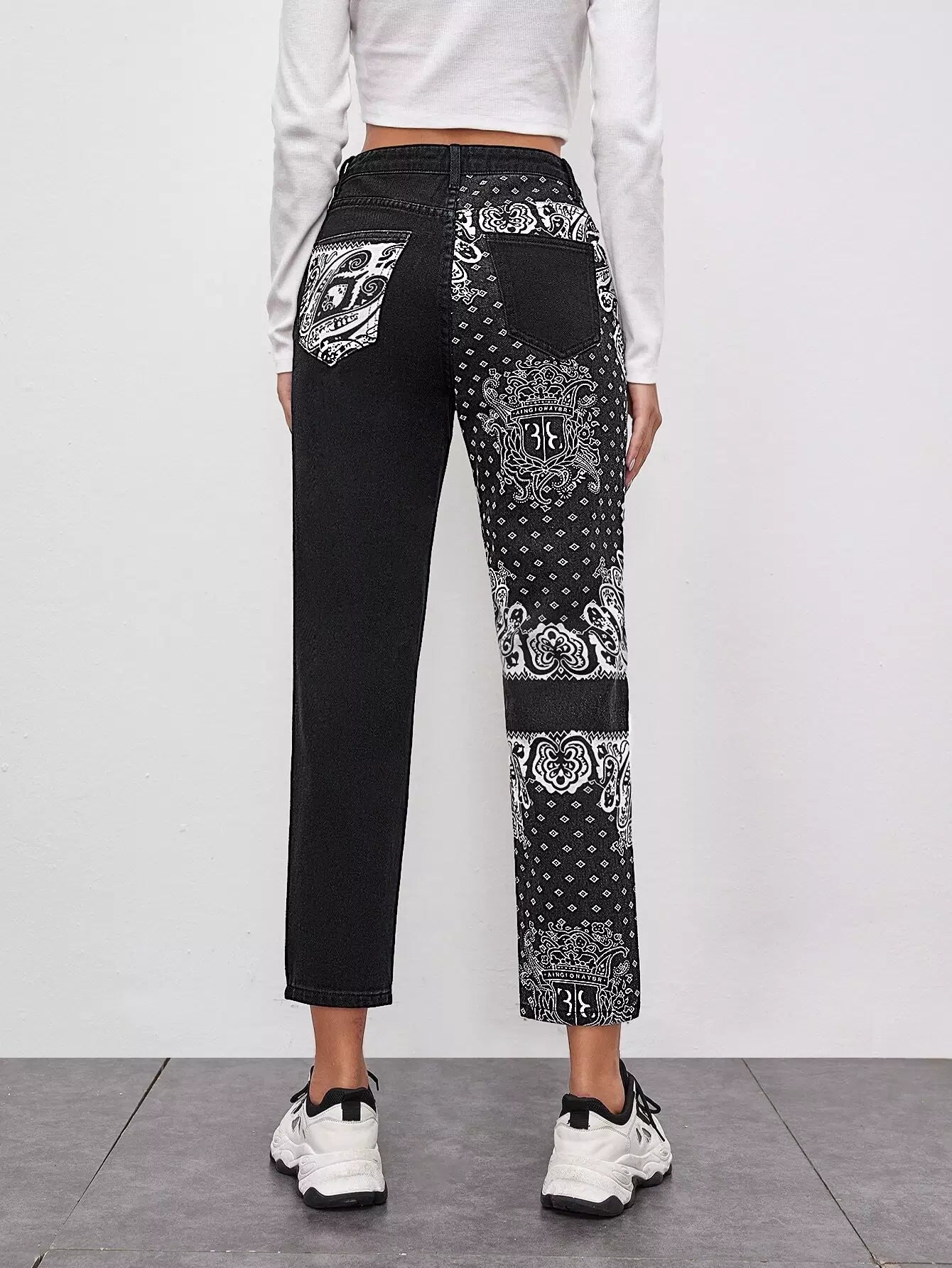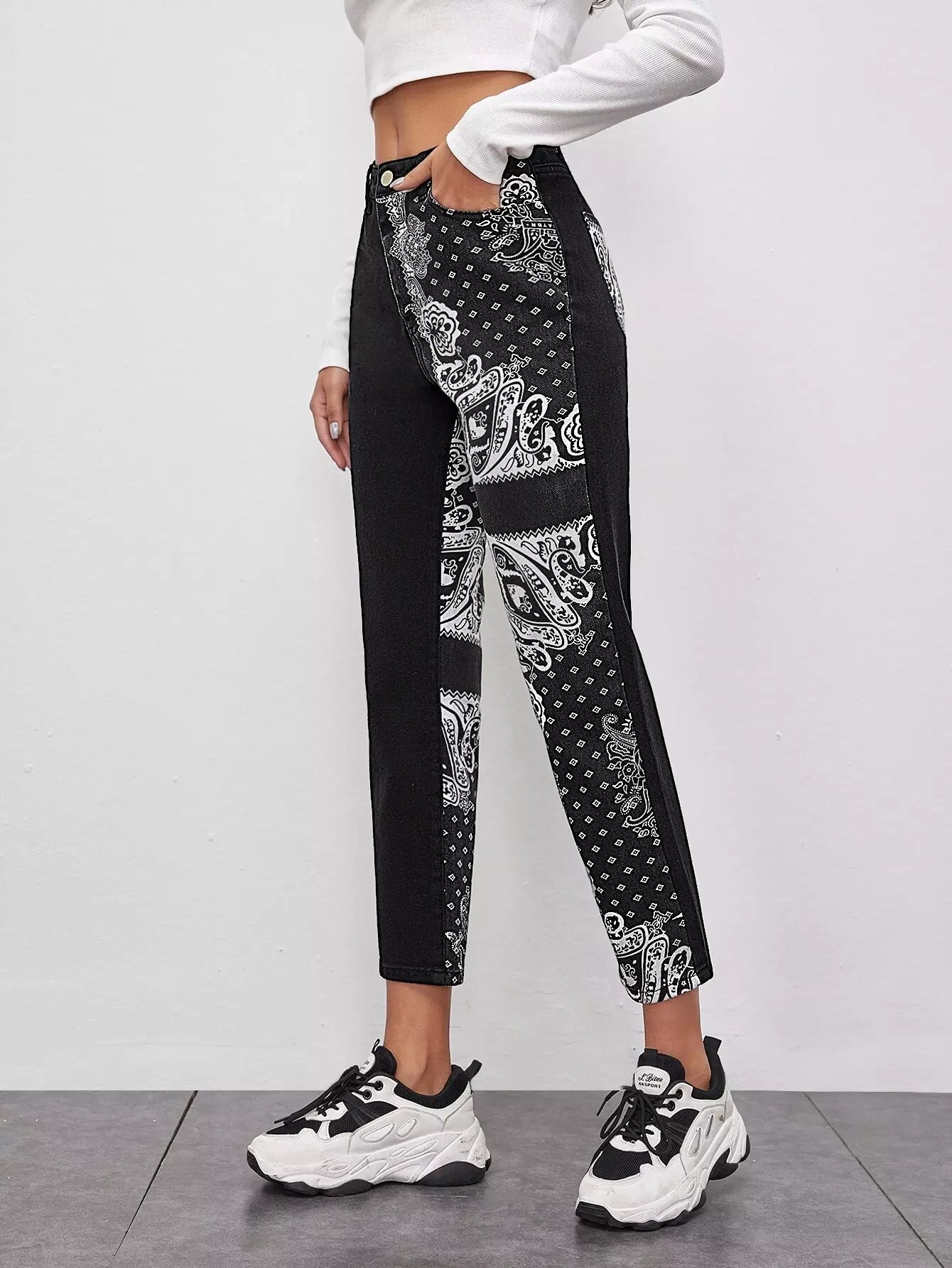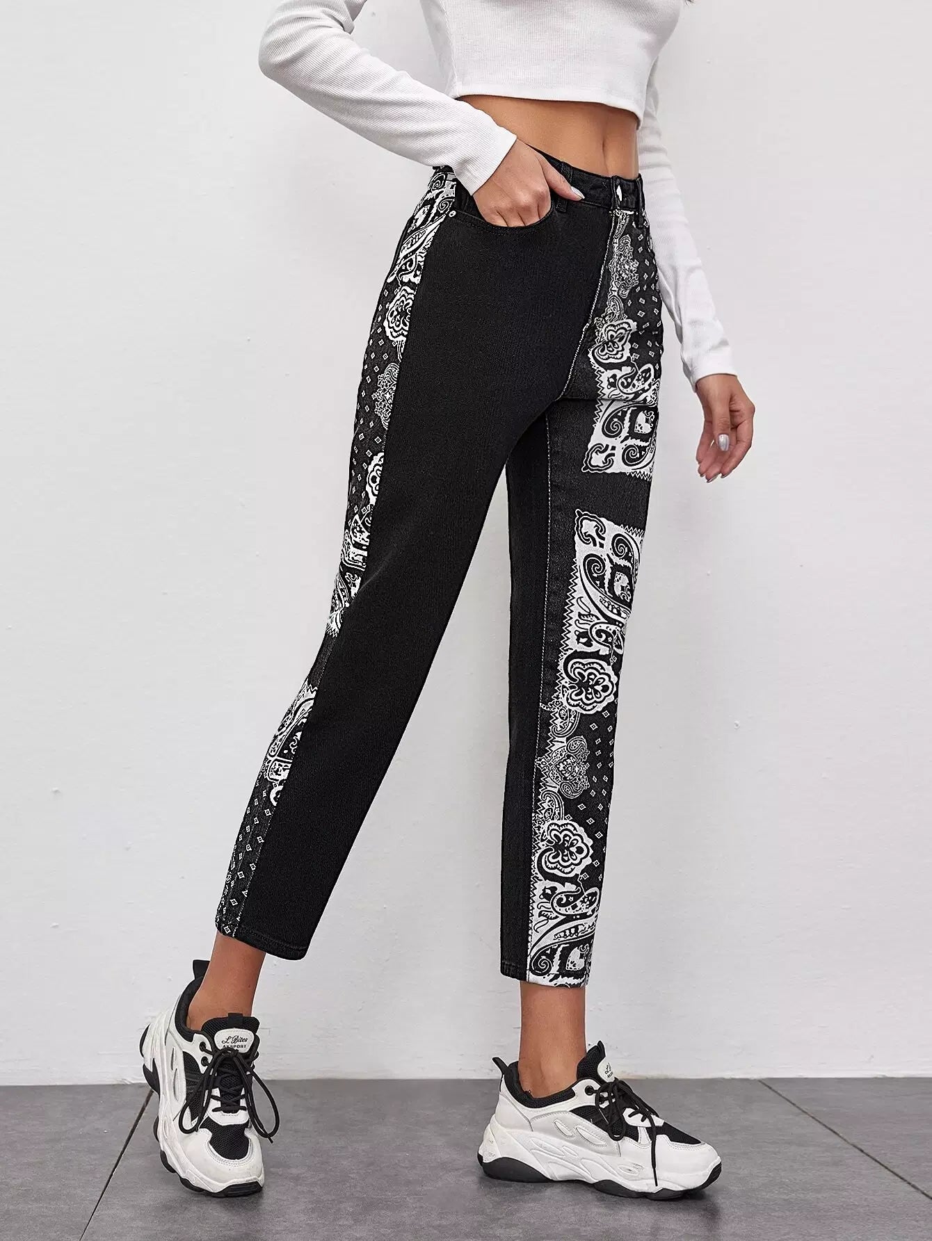 Scarf Print Slant Pocket Straight Jeans