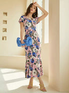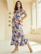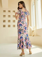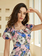 Allover Floral Print Puff Sleeve Ruffle Hem Fitted Dress