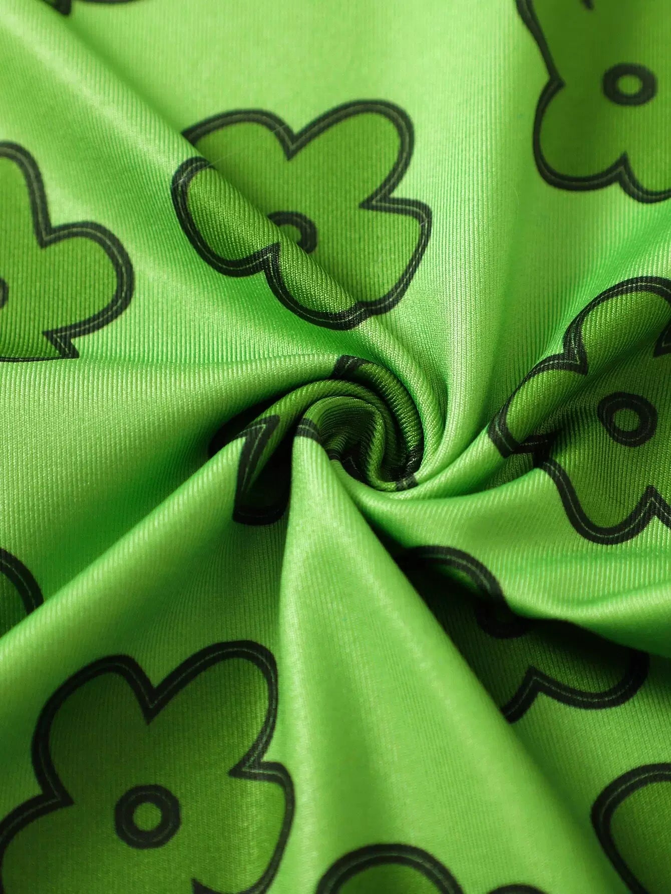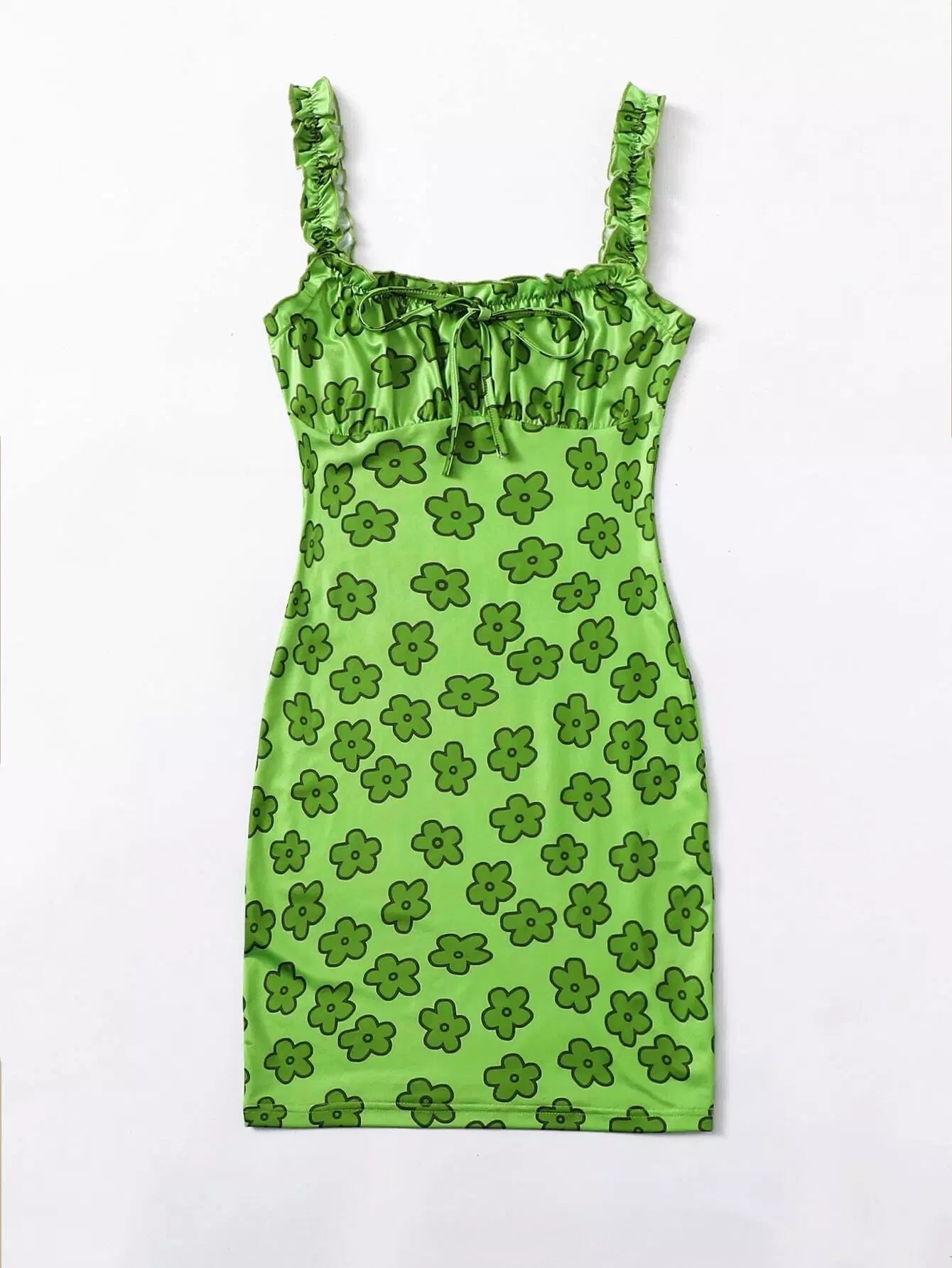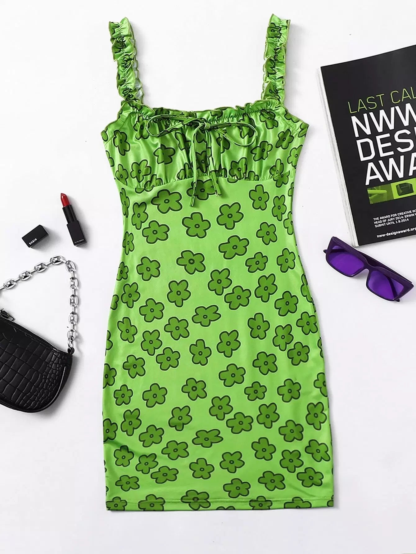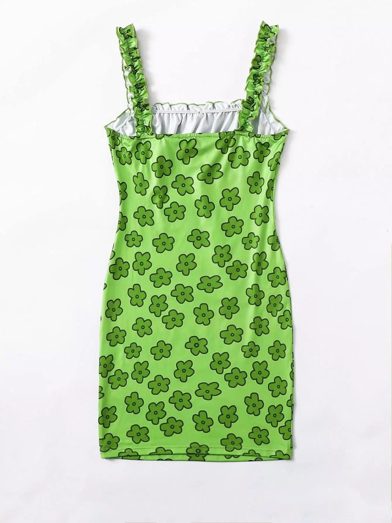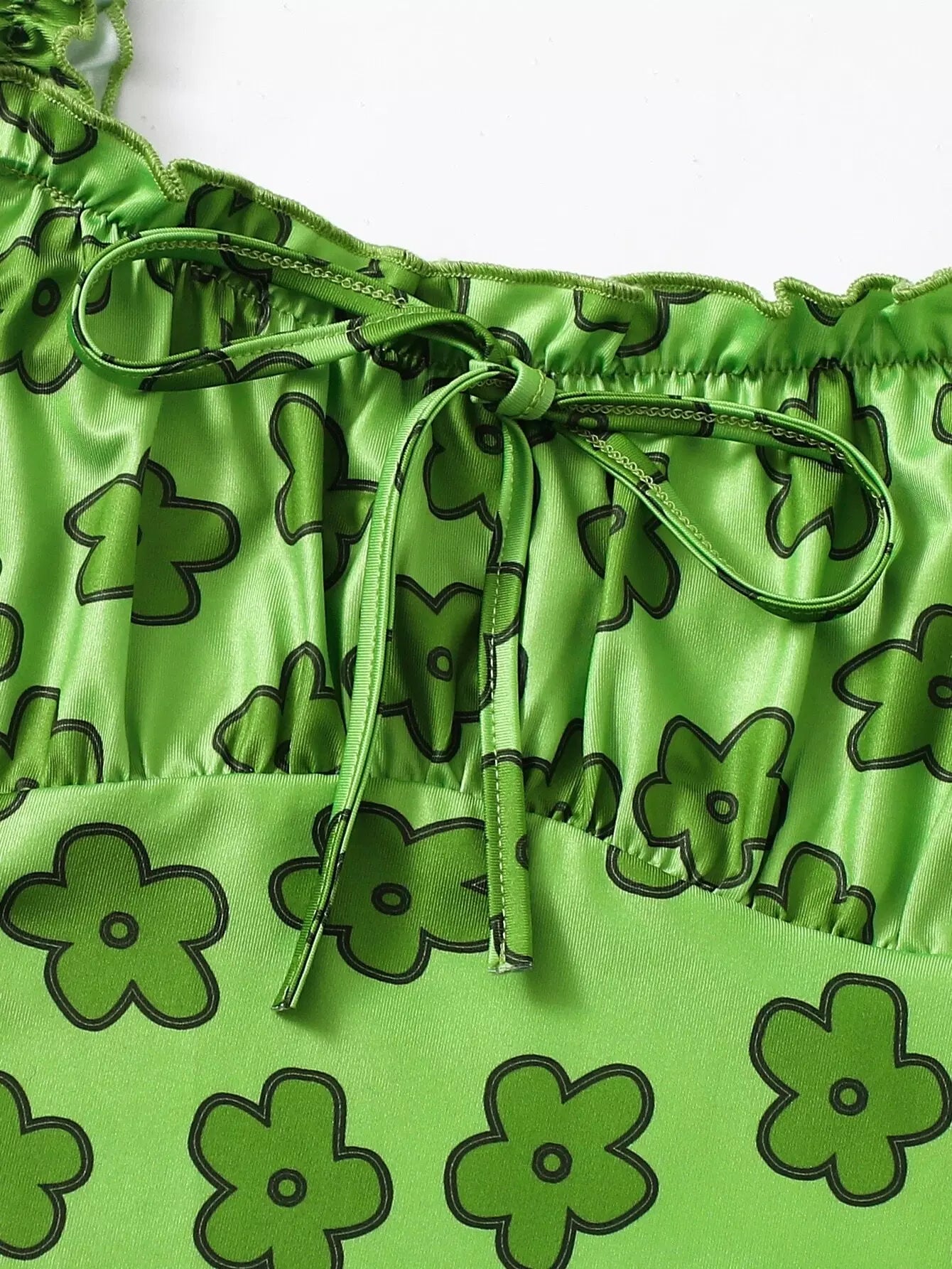 Allover Floral Print Ruched Bust Frill Trim Dress