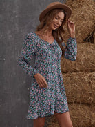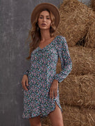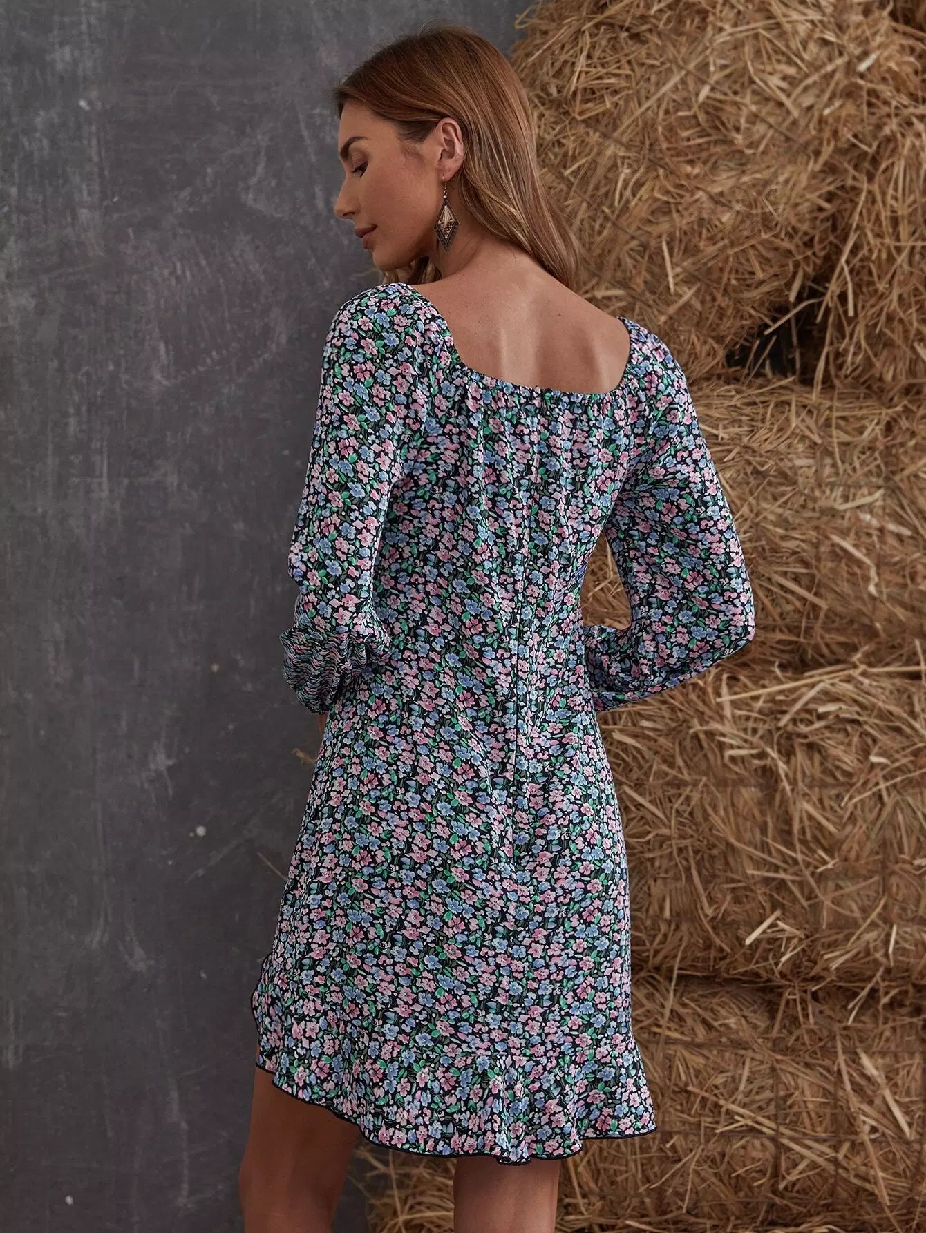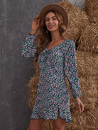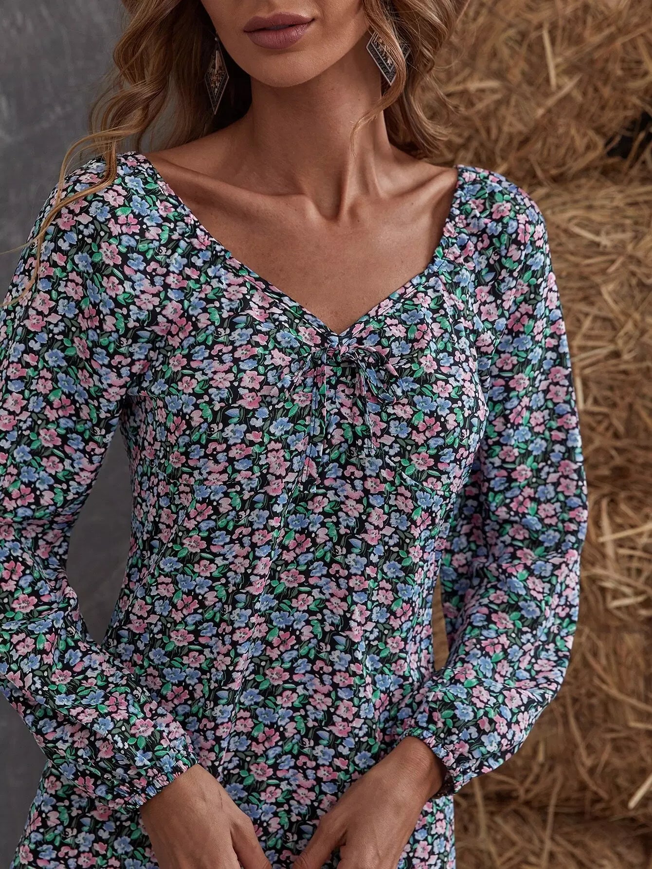 Allover Floral Print Tie Front Ruffle Hem Dress