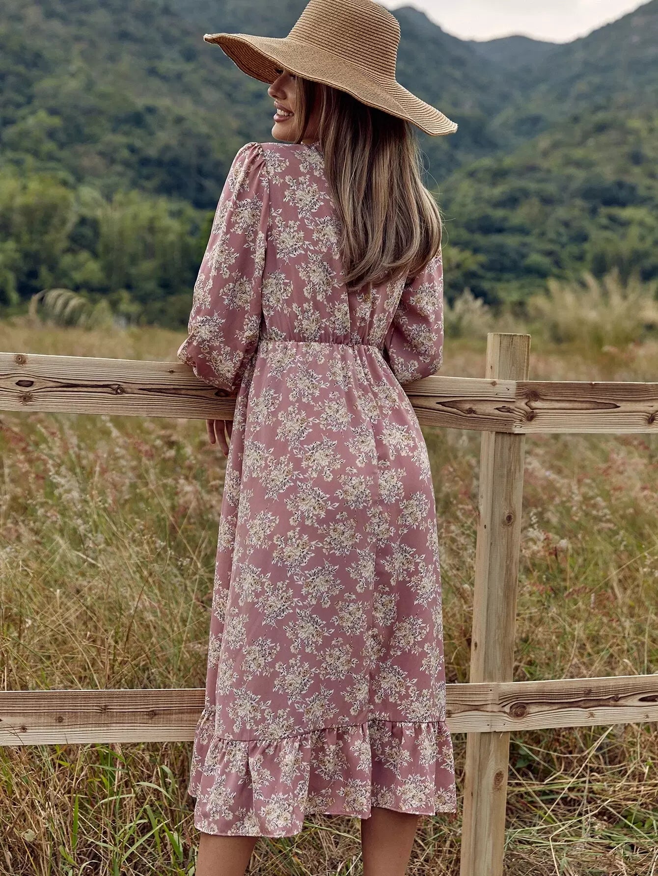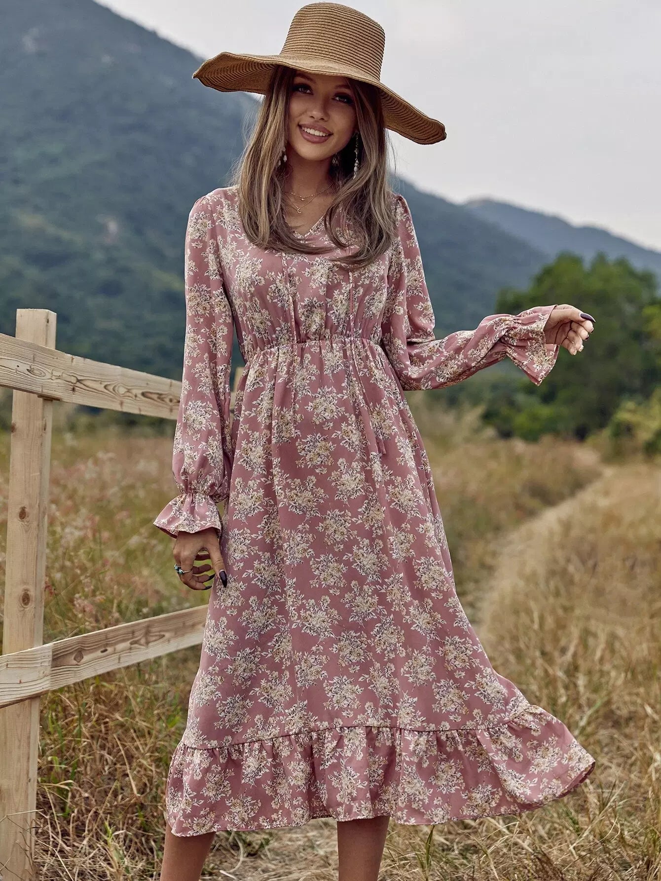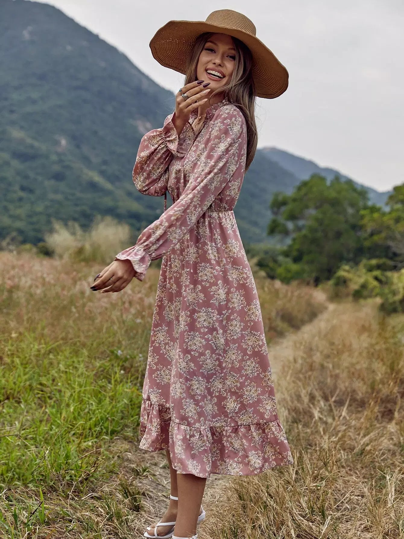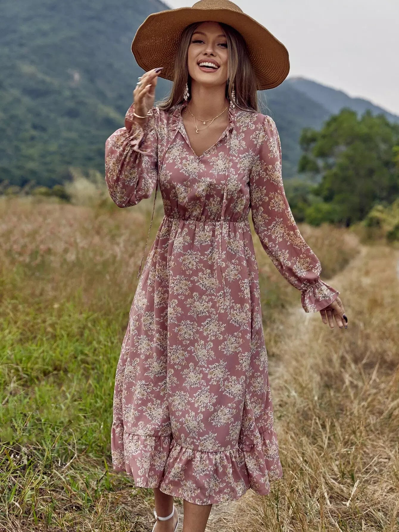 Allover Floral Tie Neck A-line Dress
