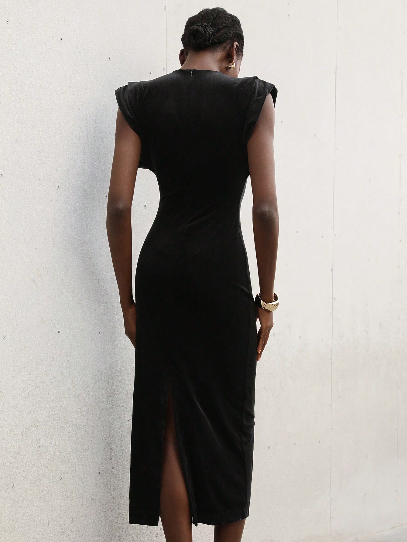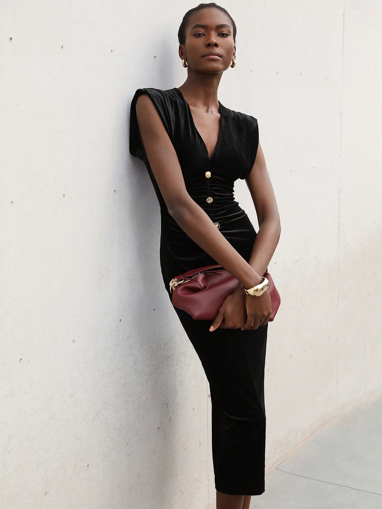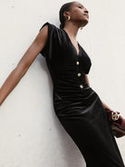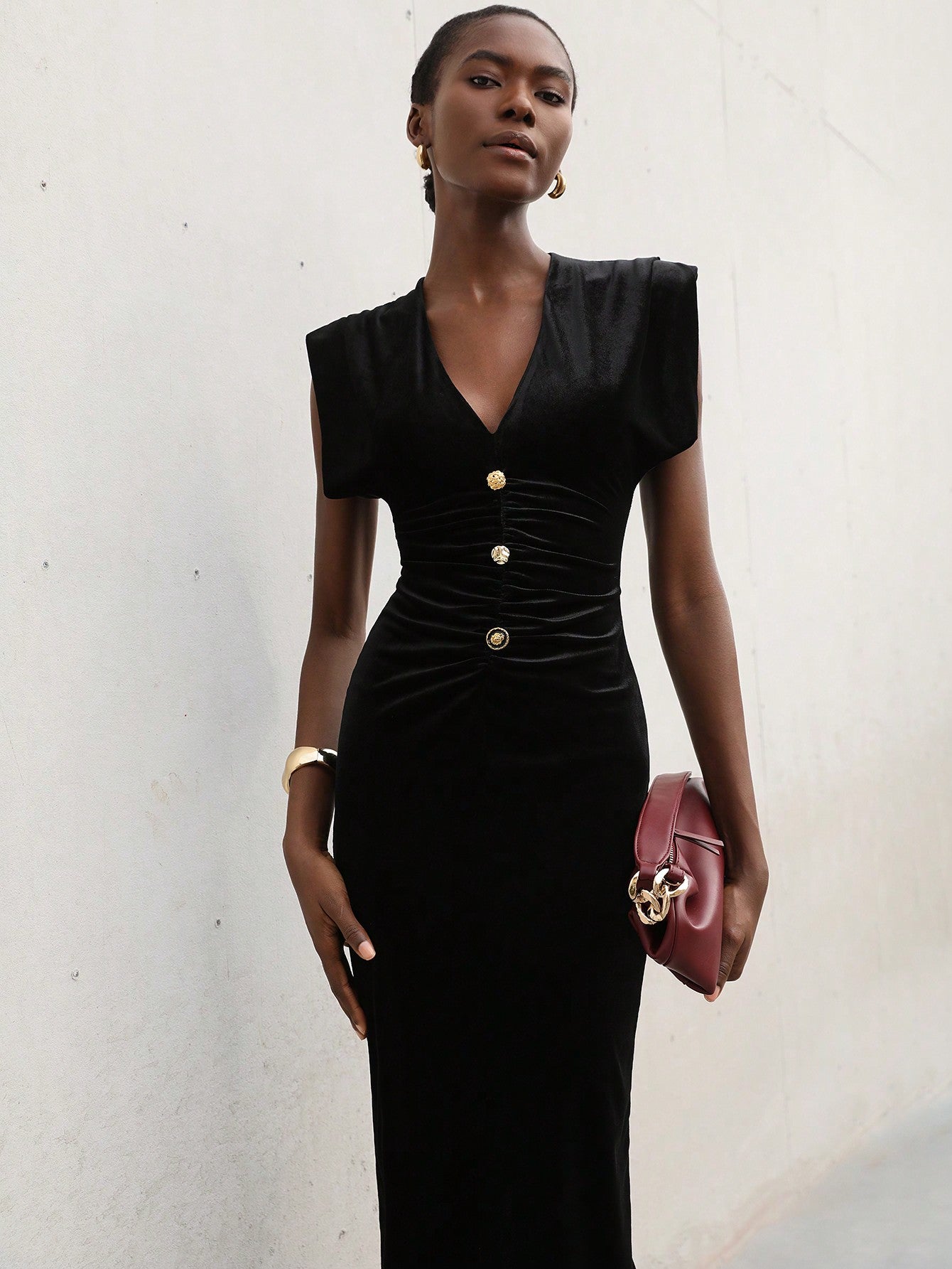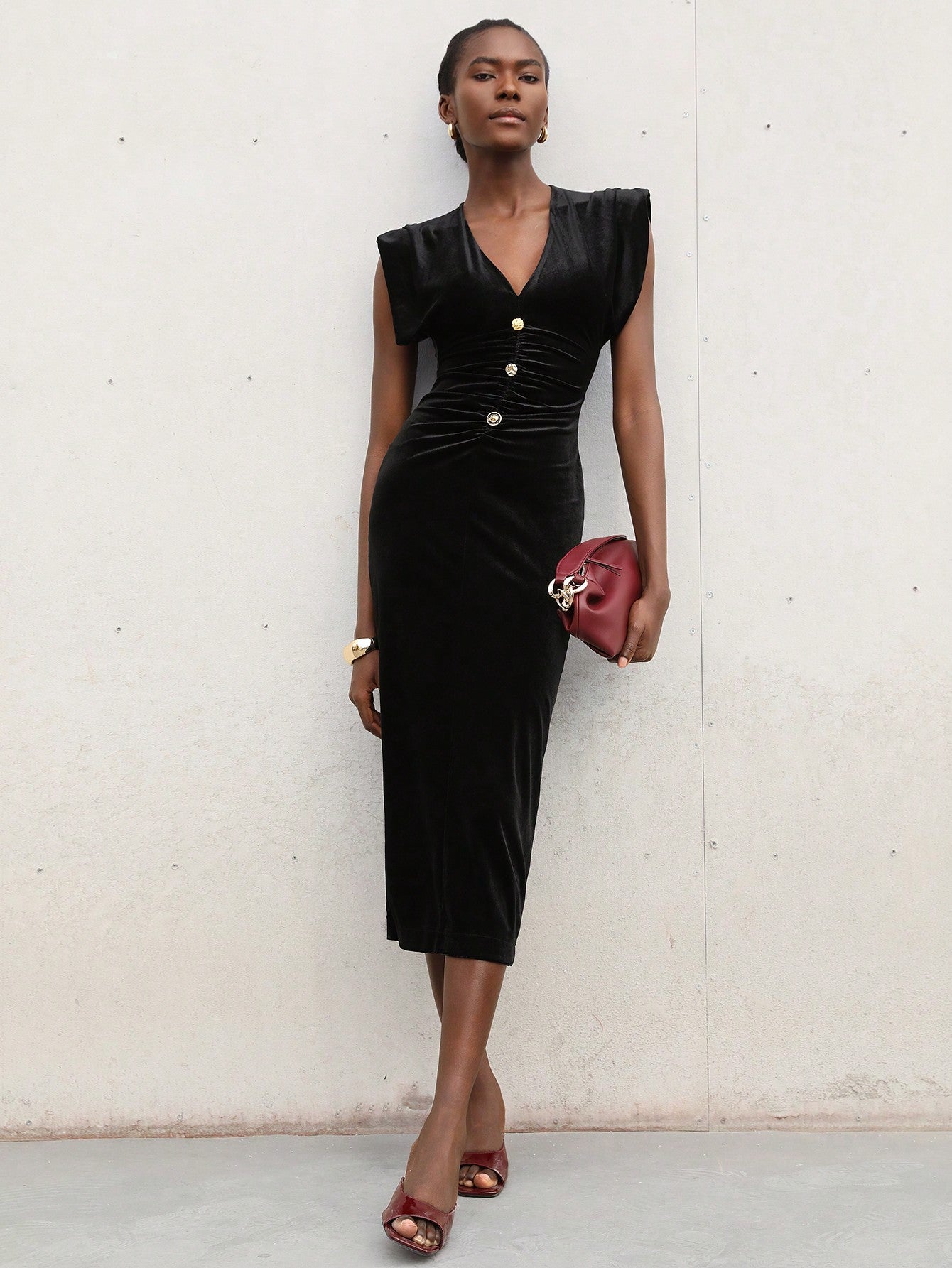 Aveloria Modichic Black Velvet Elegant High-End Design New Year Party V-Neck Sleeveless Ruched Waist