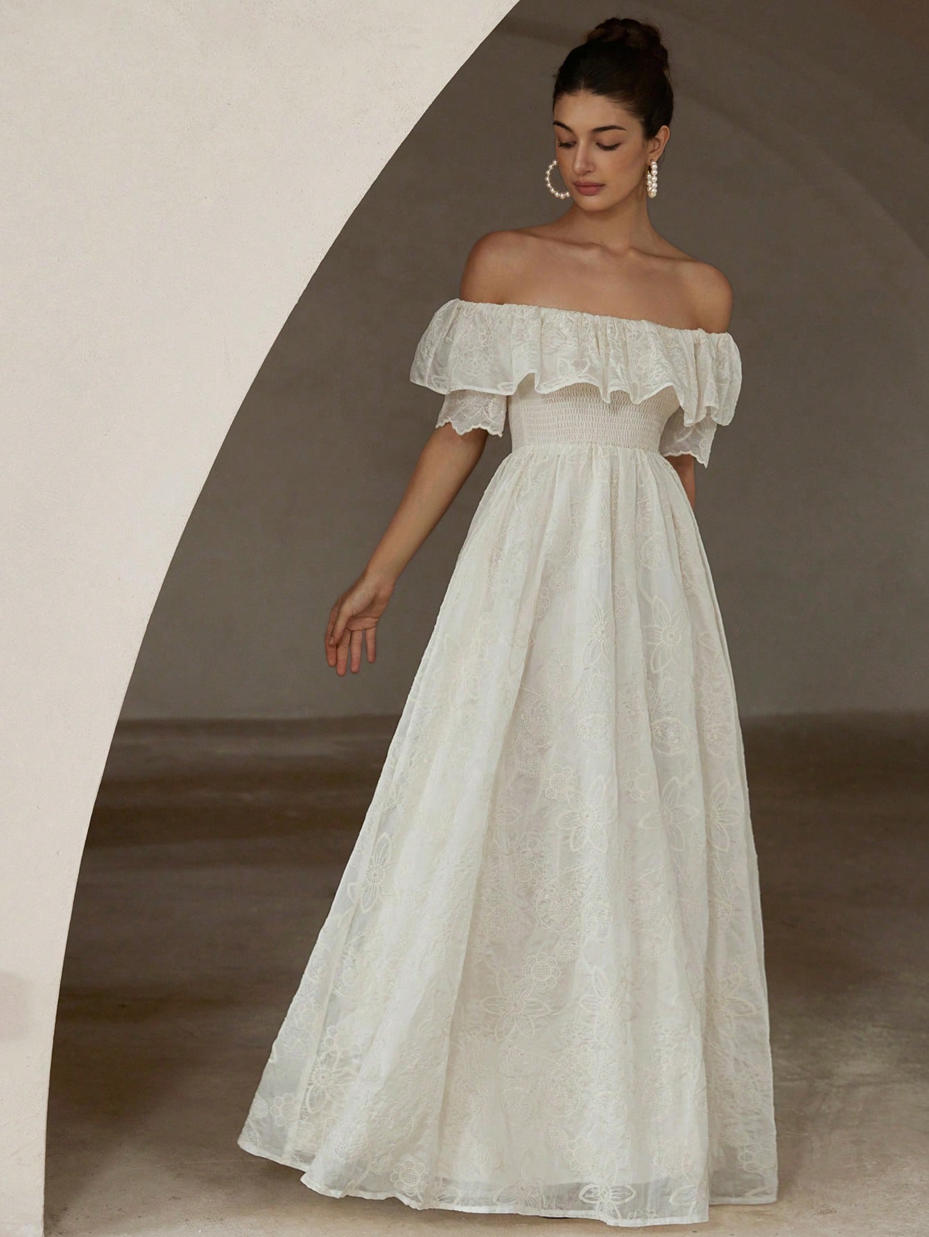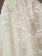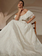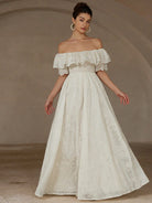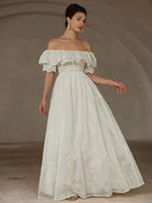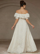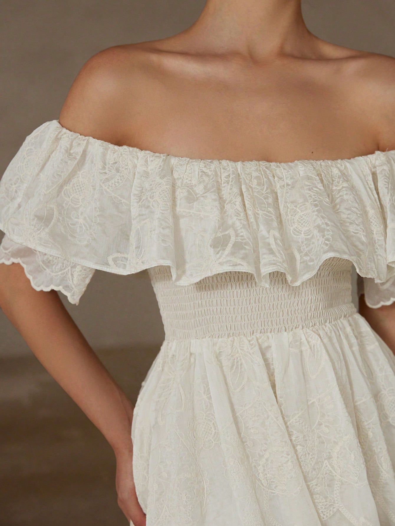 Aveloria Rosie Chiffon Embroidered Off Shoulder Ruffle Trim Fitted Waist Sleeveless Dress