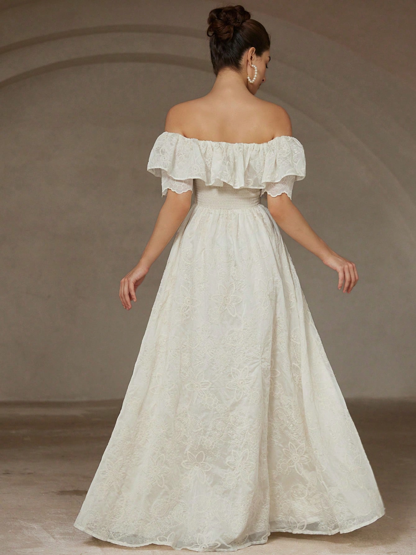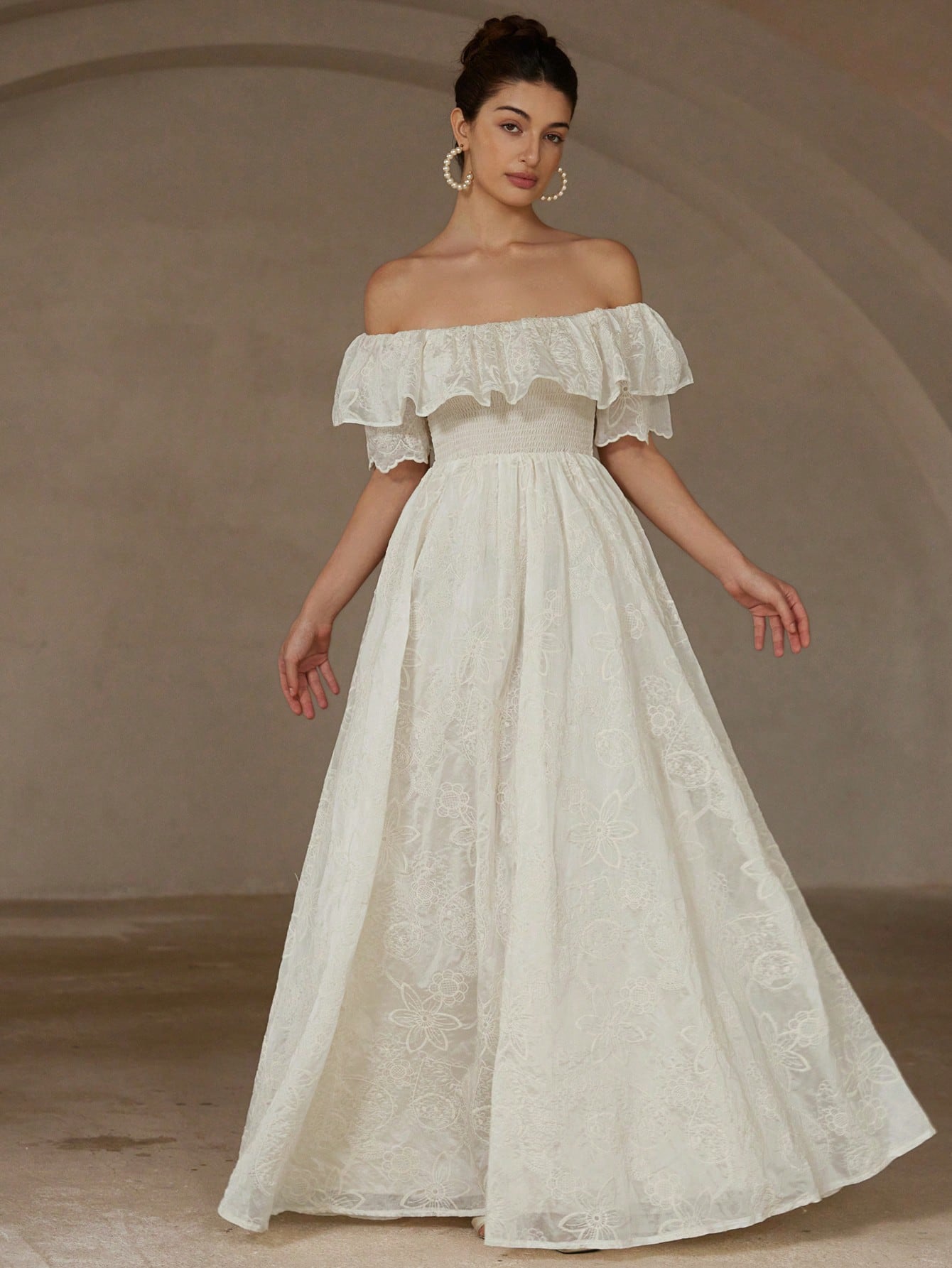 women Aveloria Rosie Chiffon Embroidered Off Shoulder Ruffle Trim Fitted Waist Sleeveless Dress