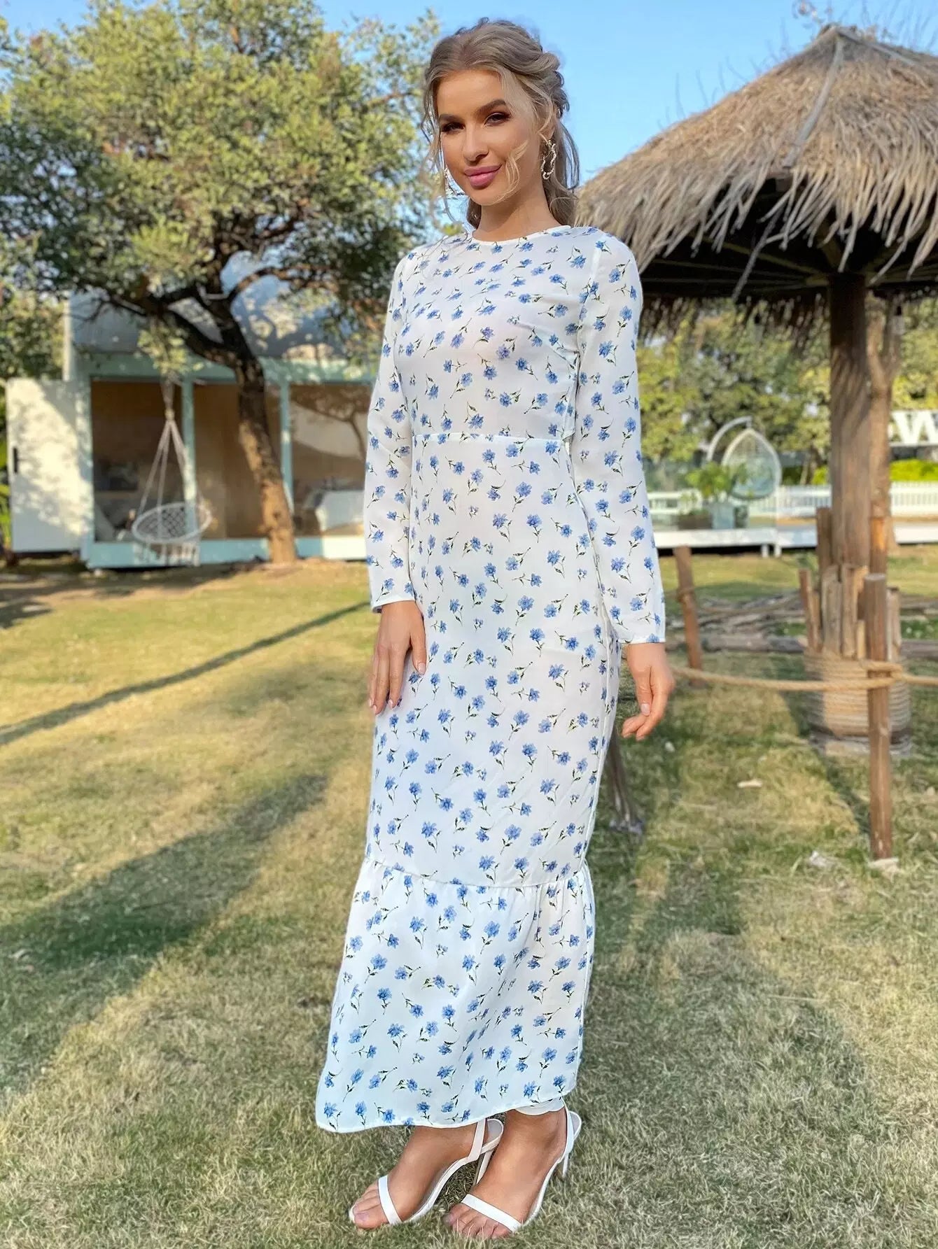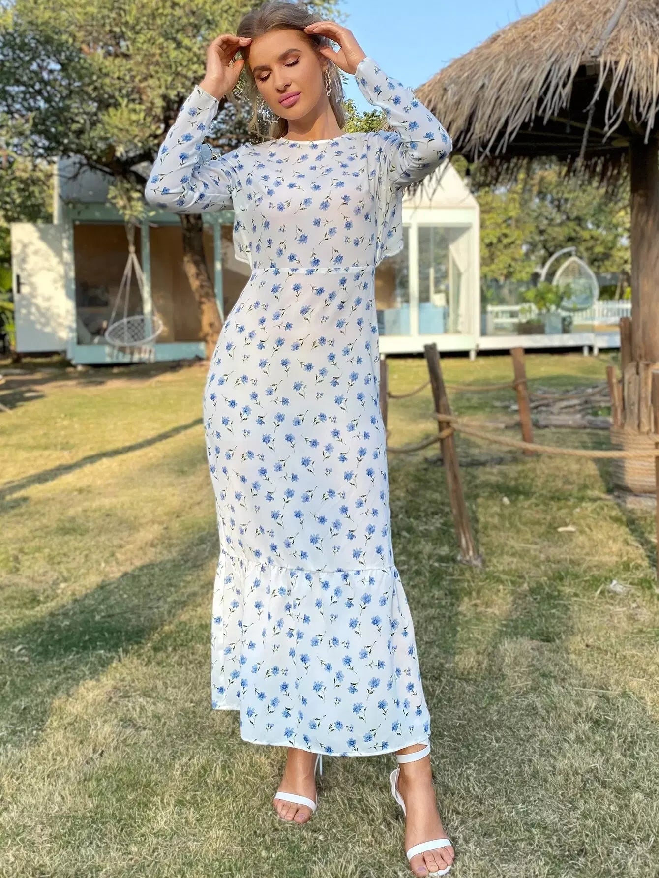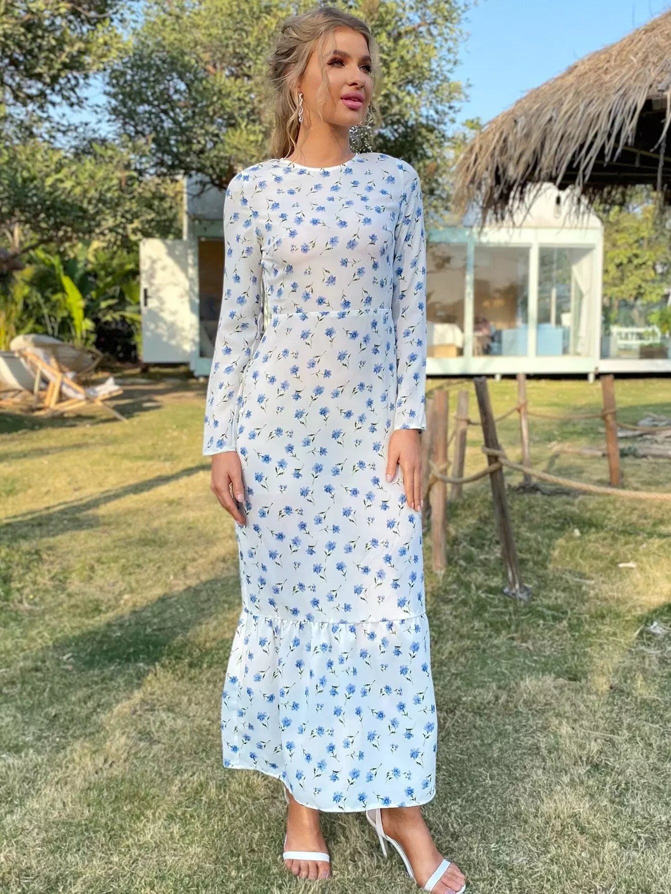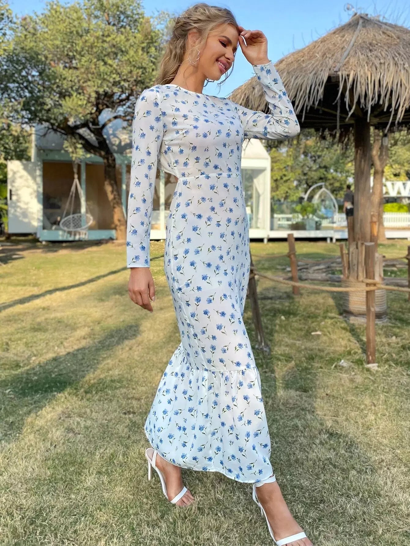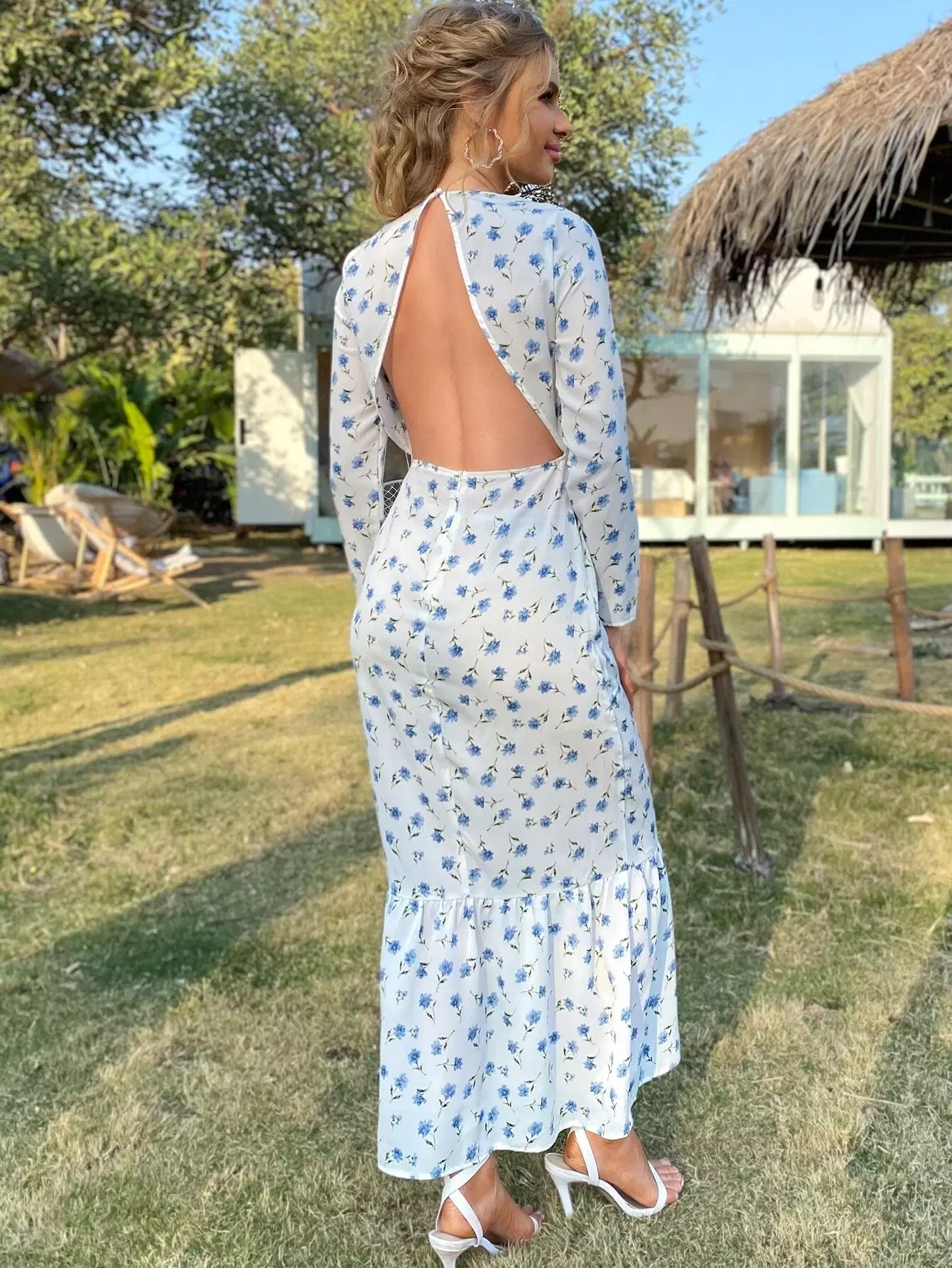 Backless Flounce Hem Floral Print Dress