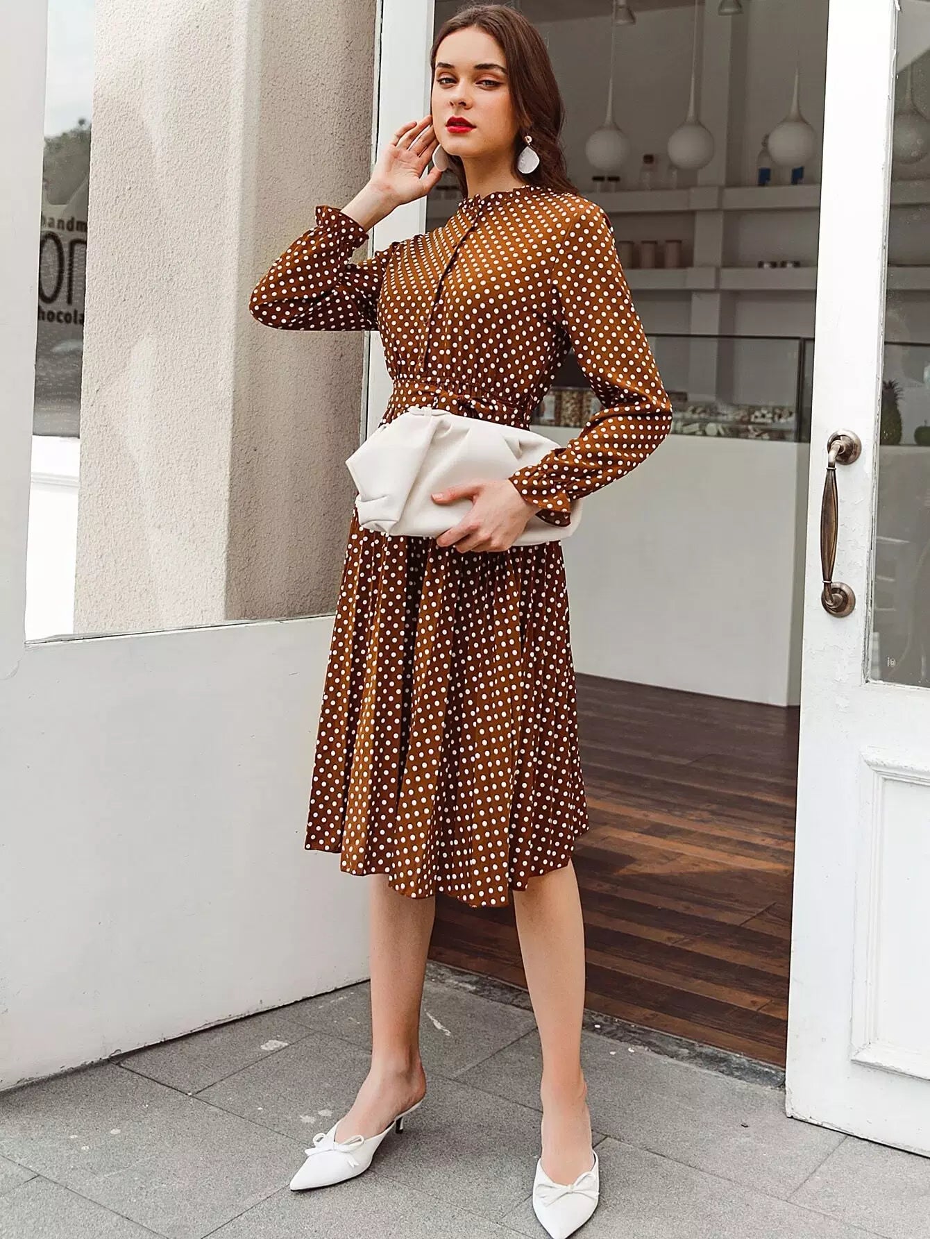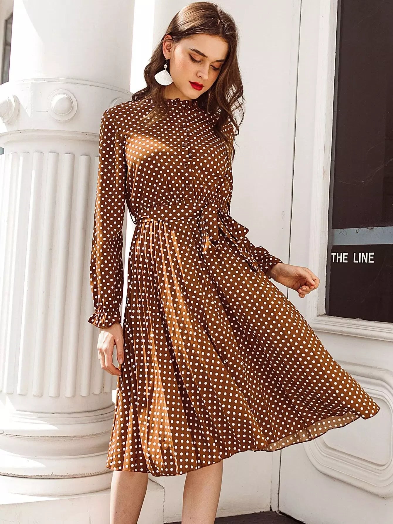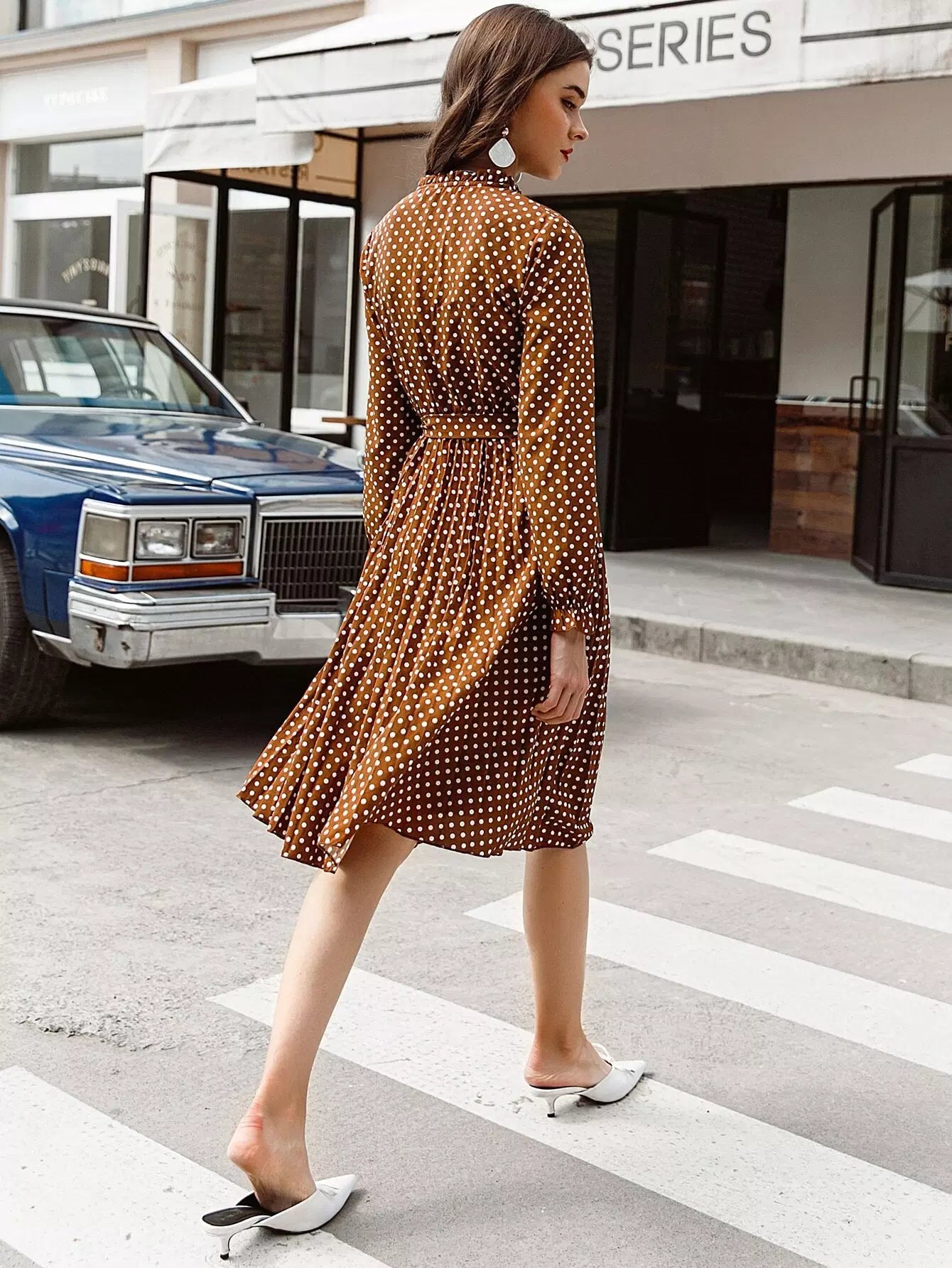 Bell Sleeve Polka Dot Pleated Hem Dress Without Belt