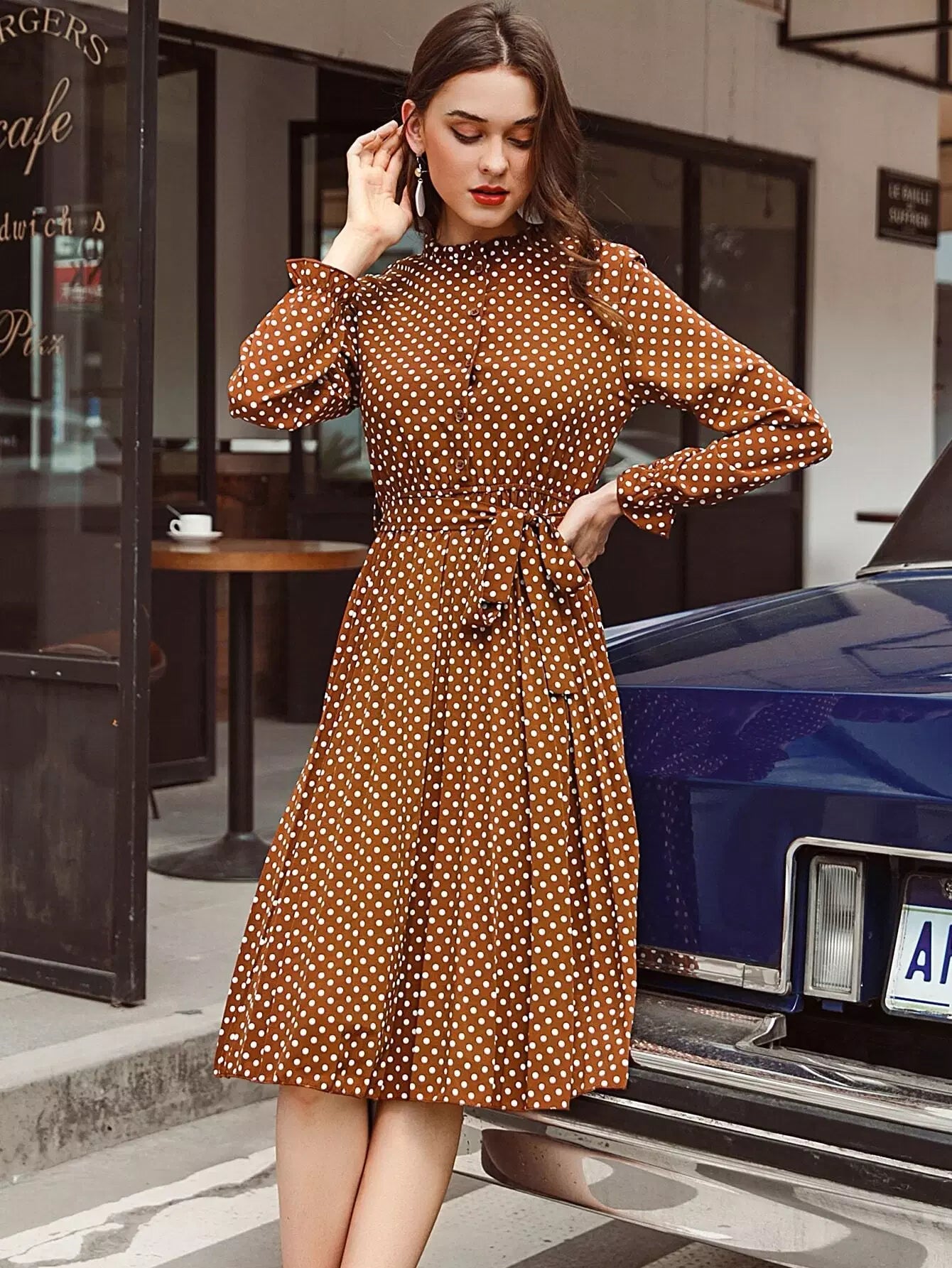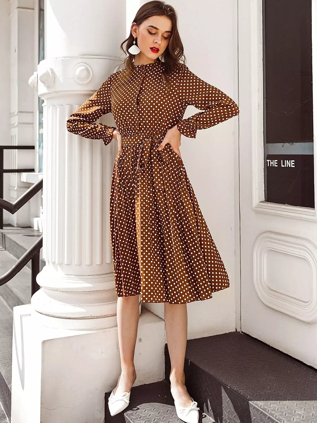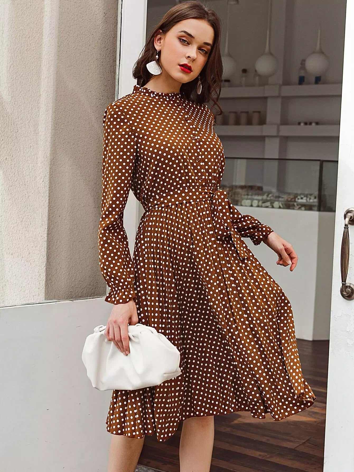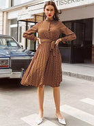 Bell Sleeve Polka Dot Pleated Hem Dress Without Belt