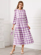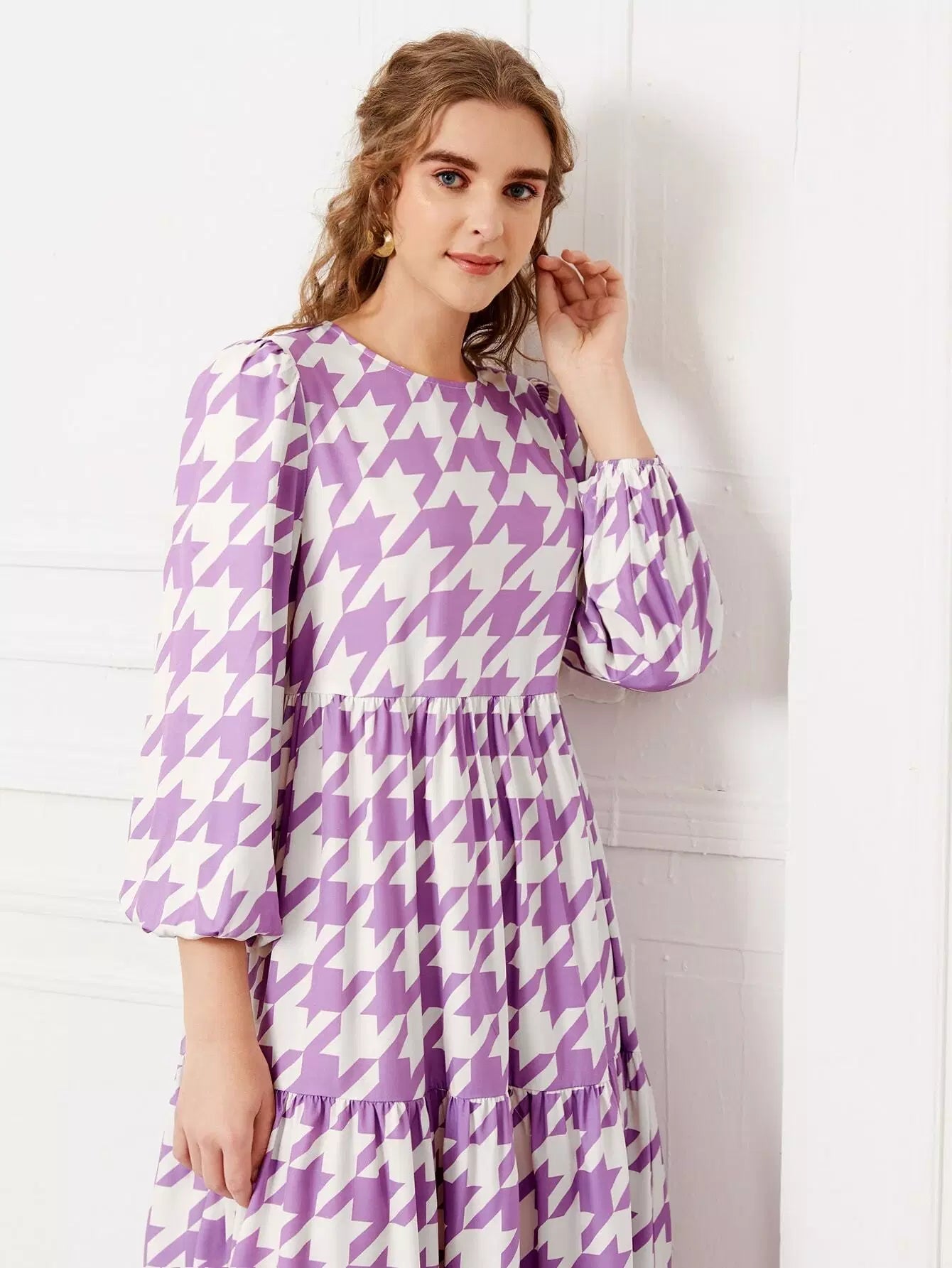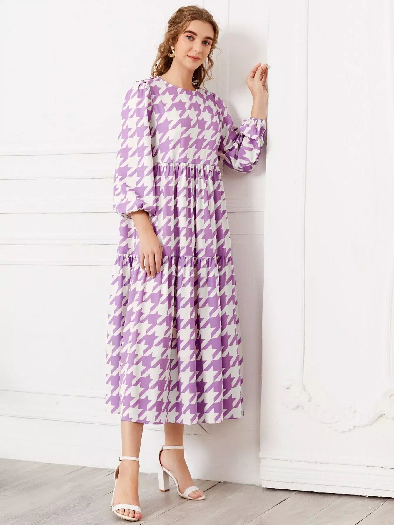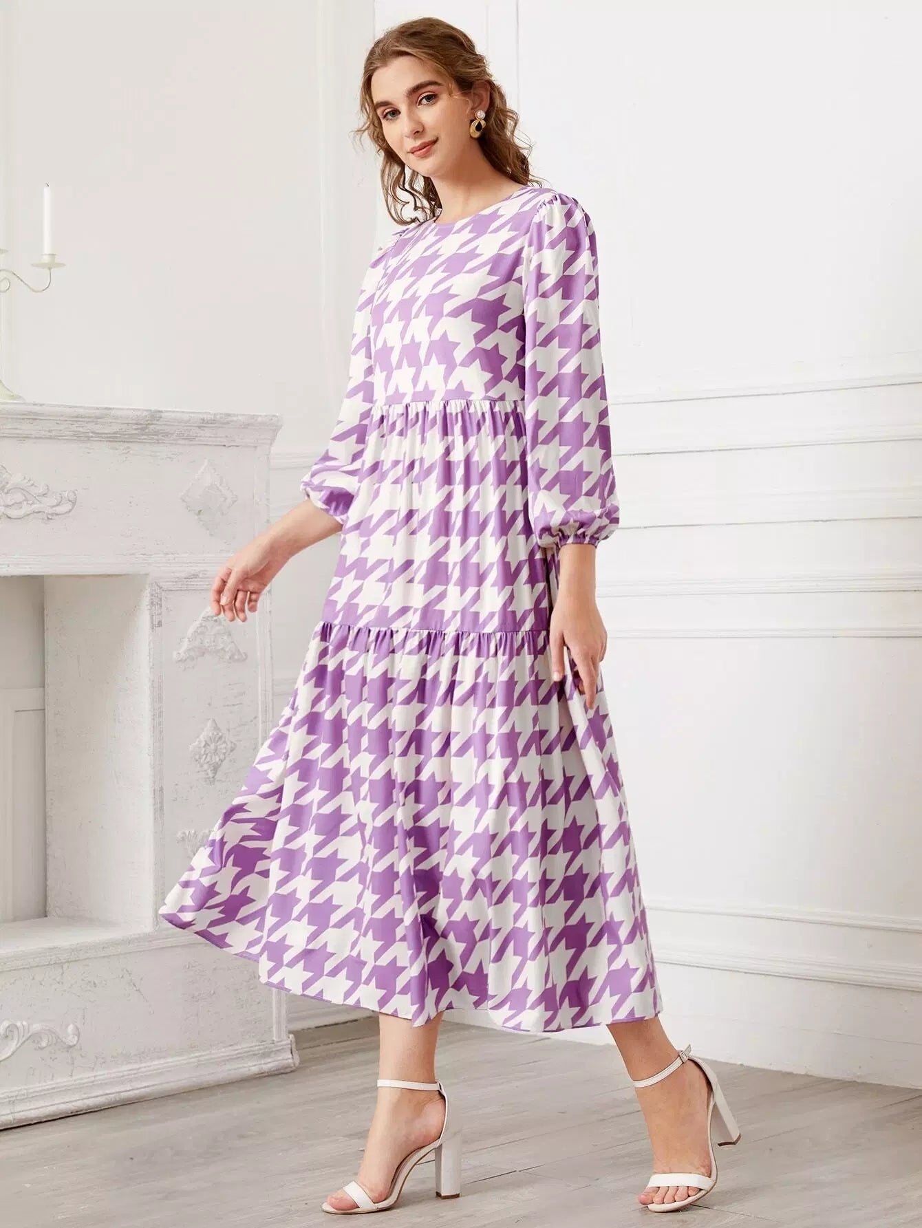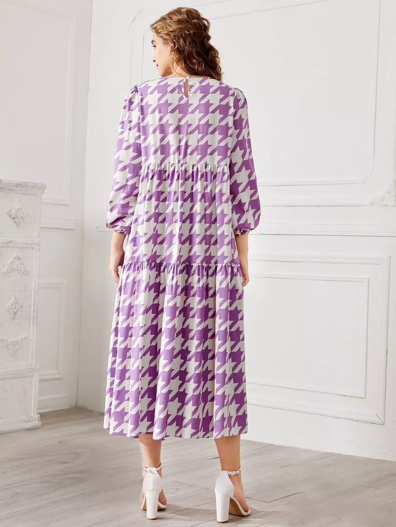 Bishop Sleeve Ruffle Hem Houndstooth Dress
