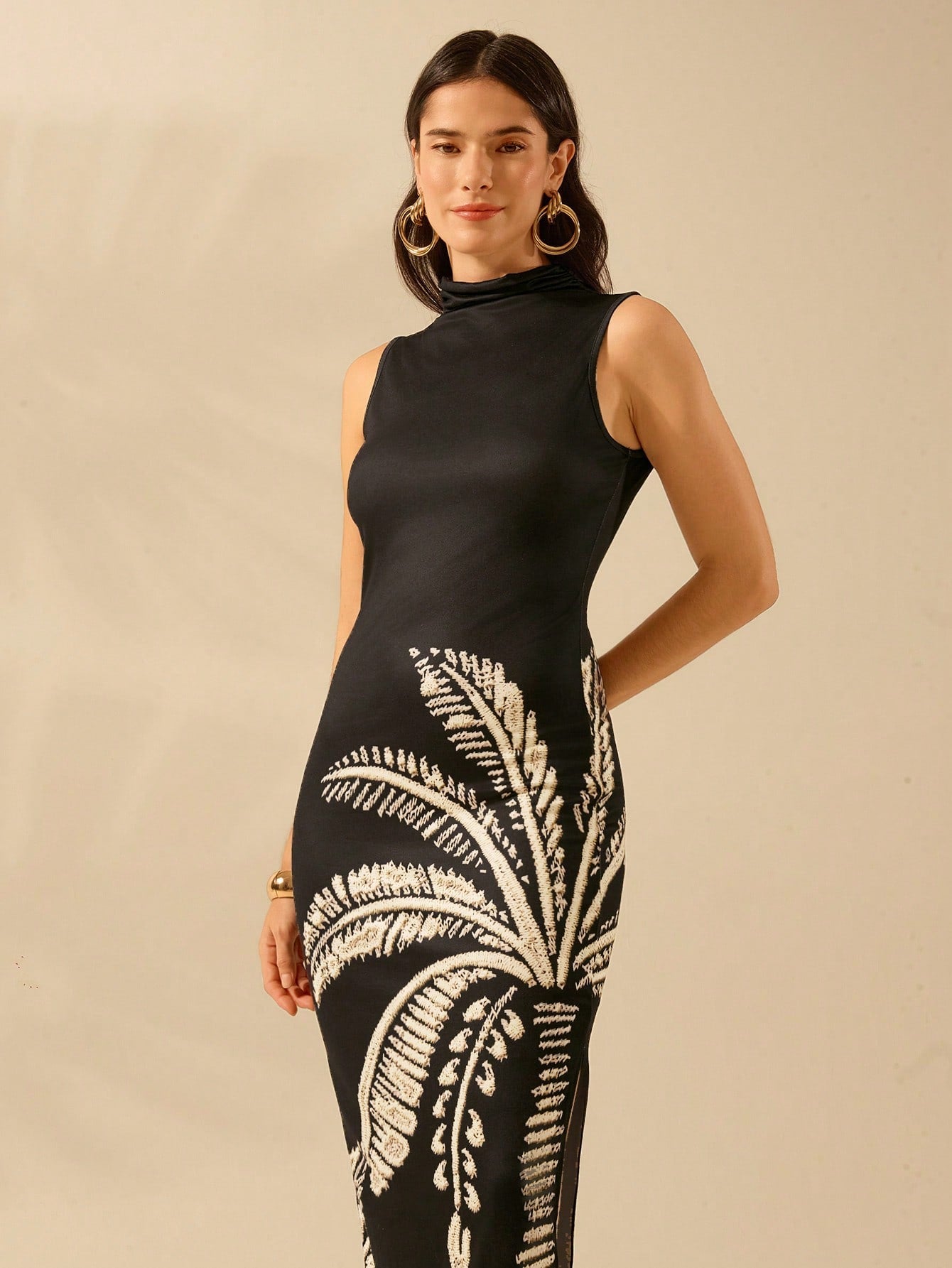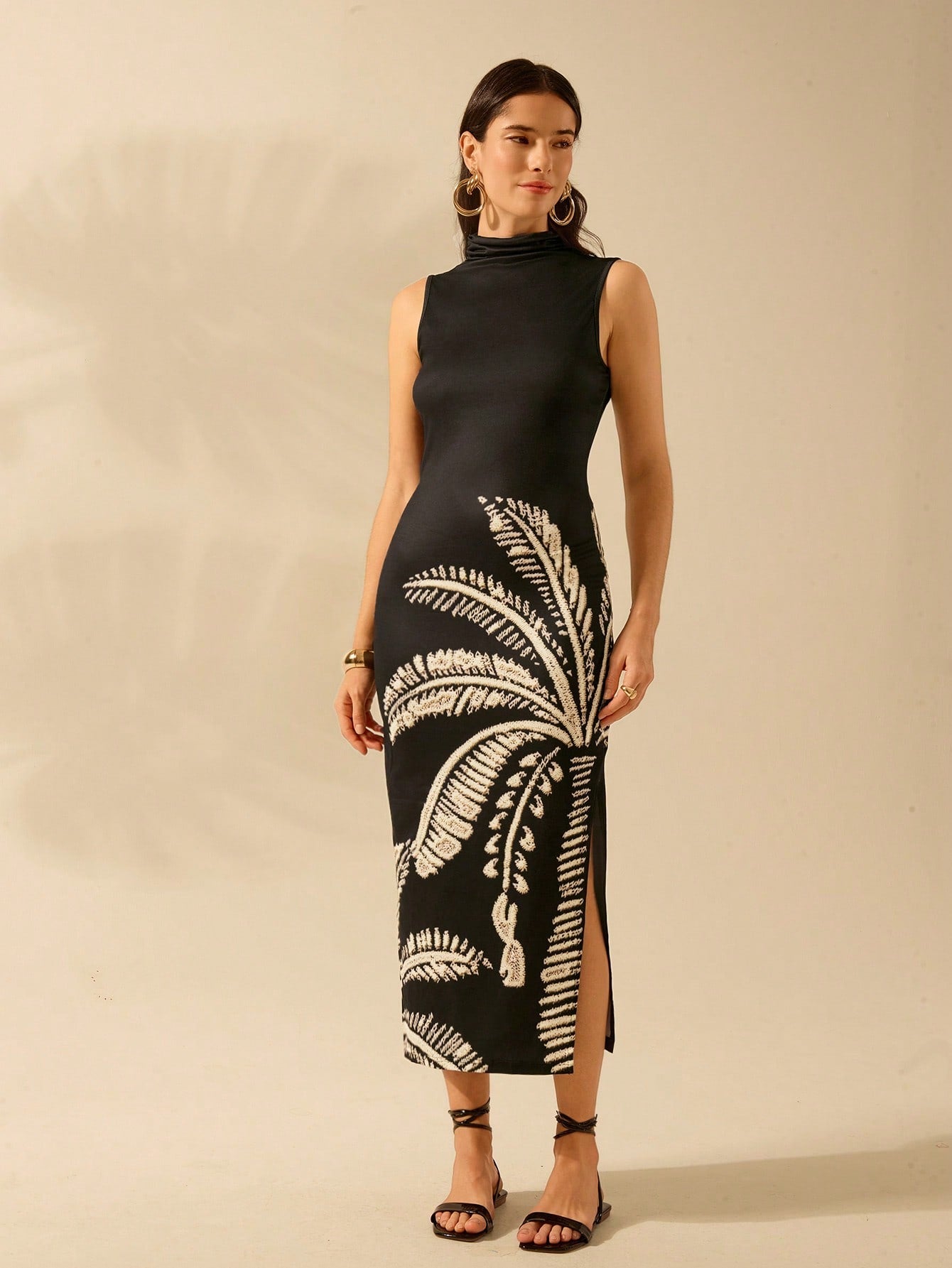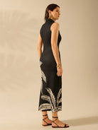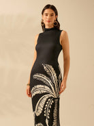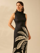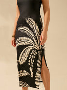 CAJUNI Women's Boho Black Oversized Coconut Tree Print Casual Tropical Bodycon Long Dress