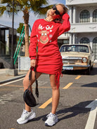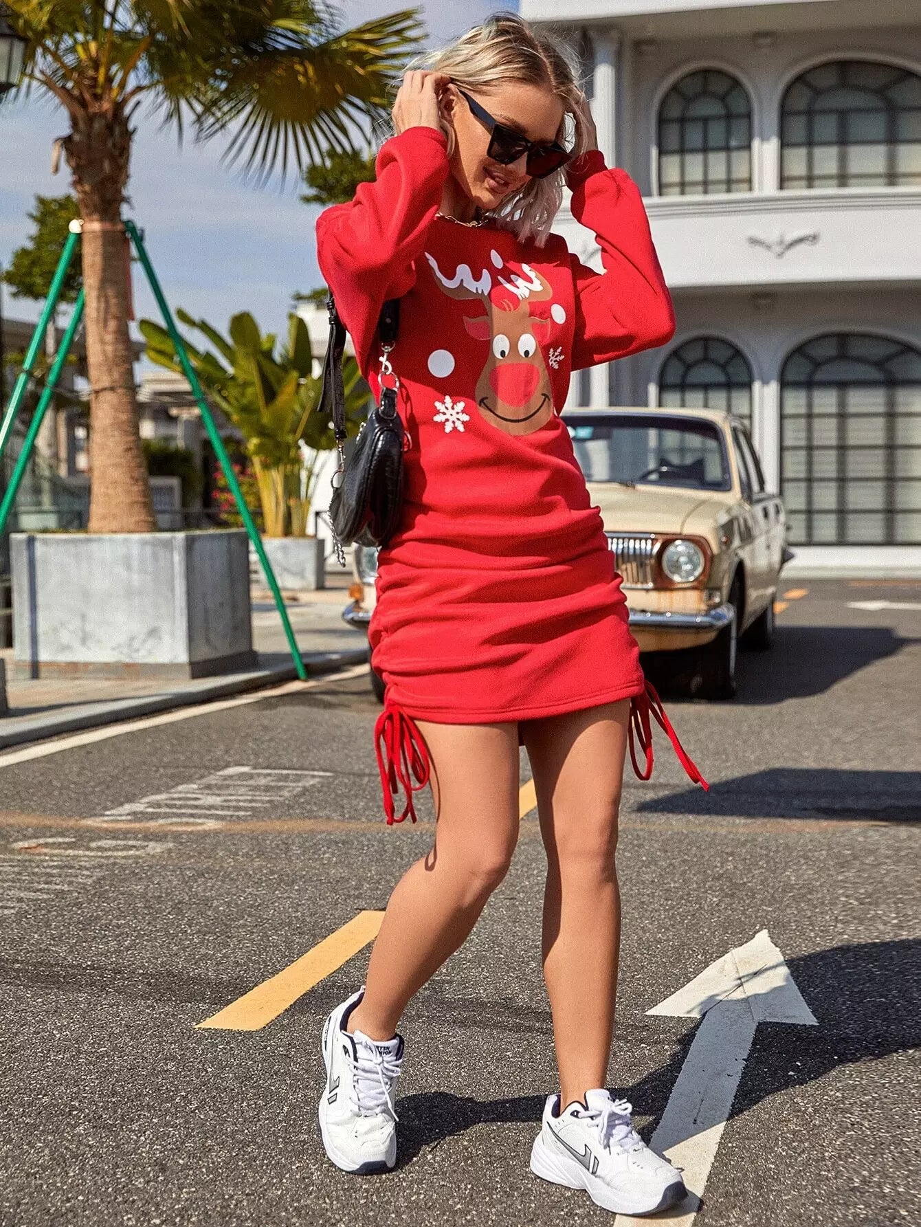 Christmas Elk Print Drawstring Side Drop Shoulder Dress