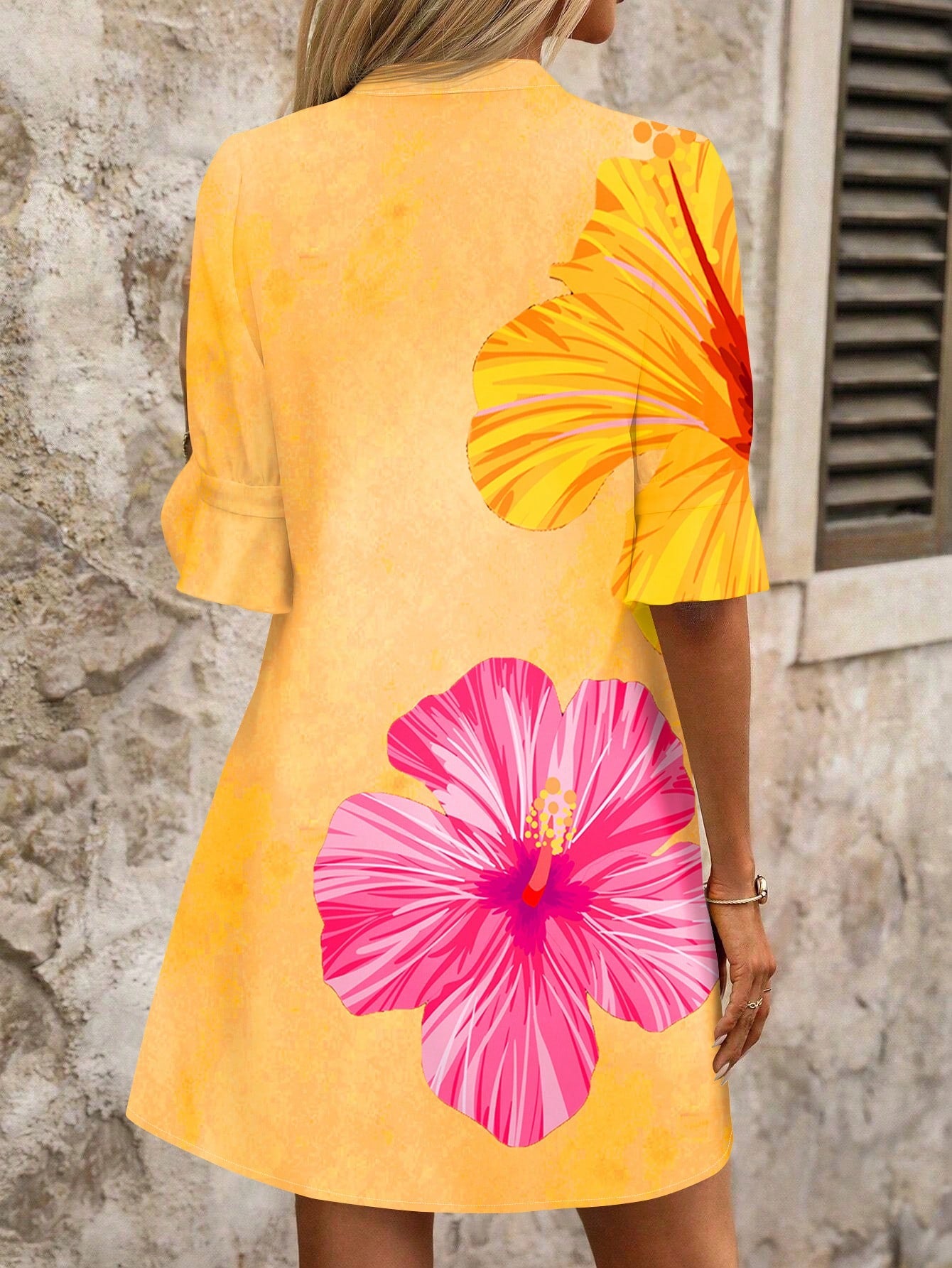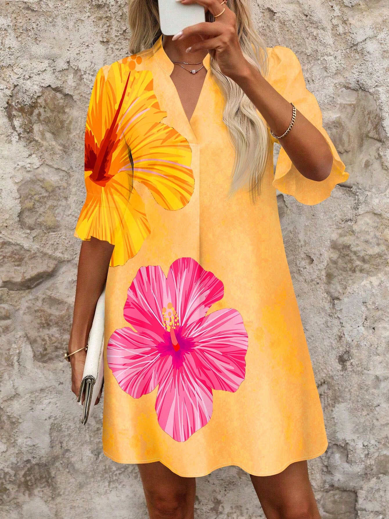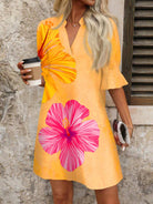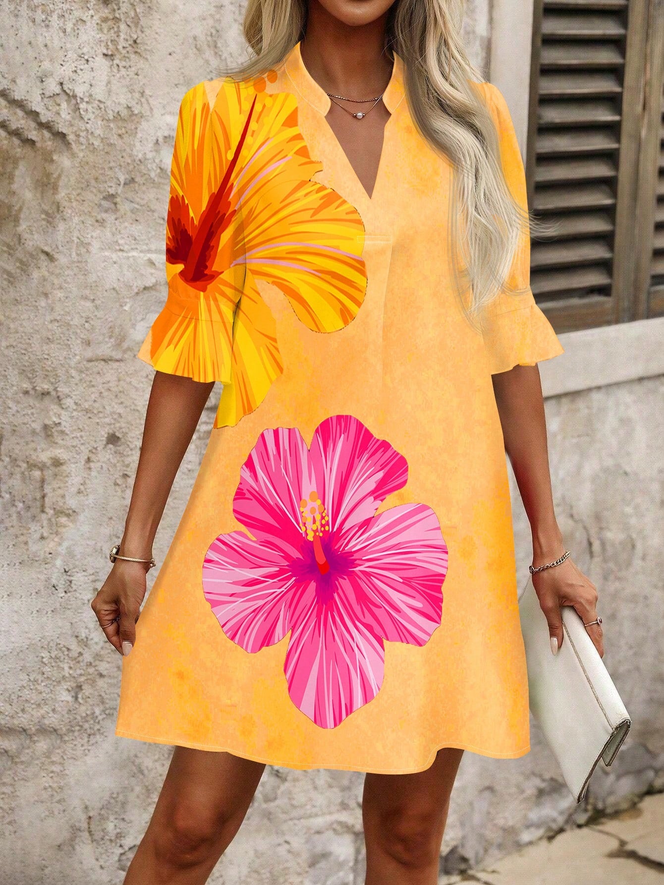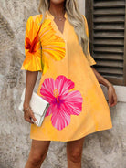 Clasi Women's Short Dress, Bright Orange Floral Print, Vacation Style Women Summer Clothes Women Dress