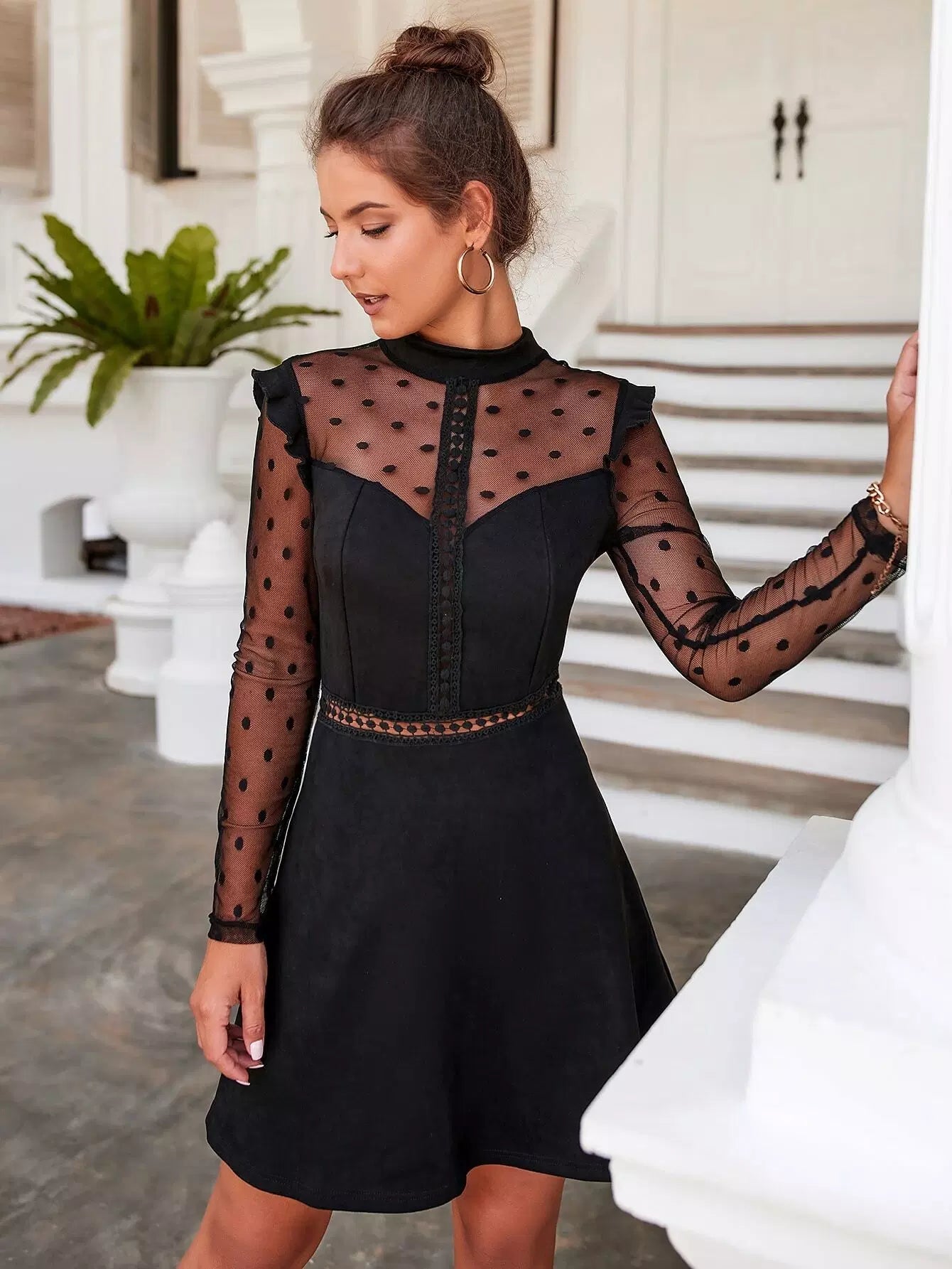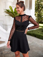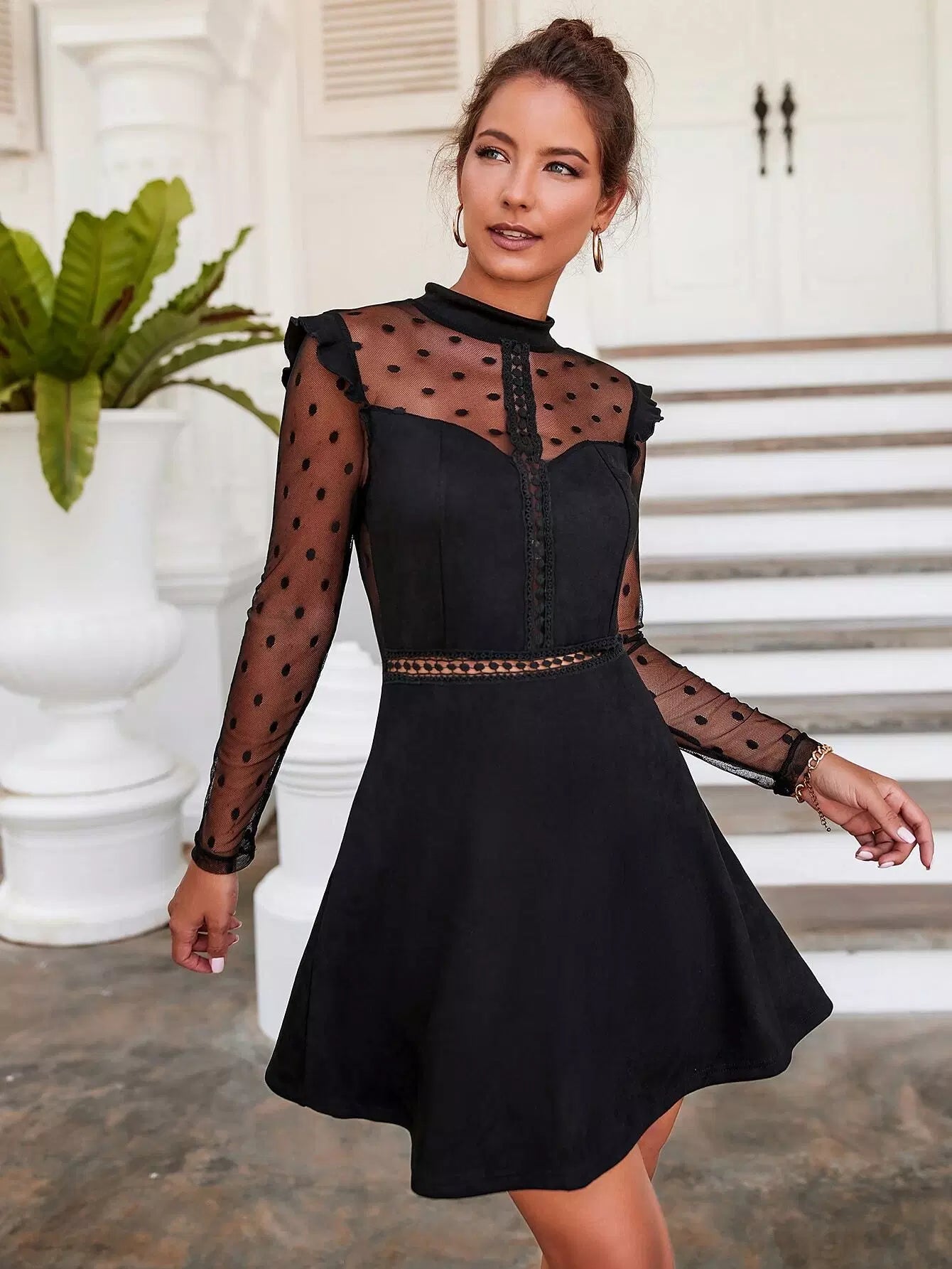 Contrast Dobby Mesh Guipure Lace Insert Ruffle Trim Dress