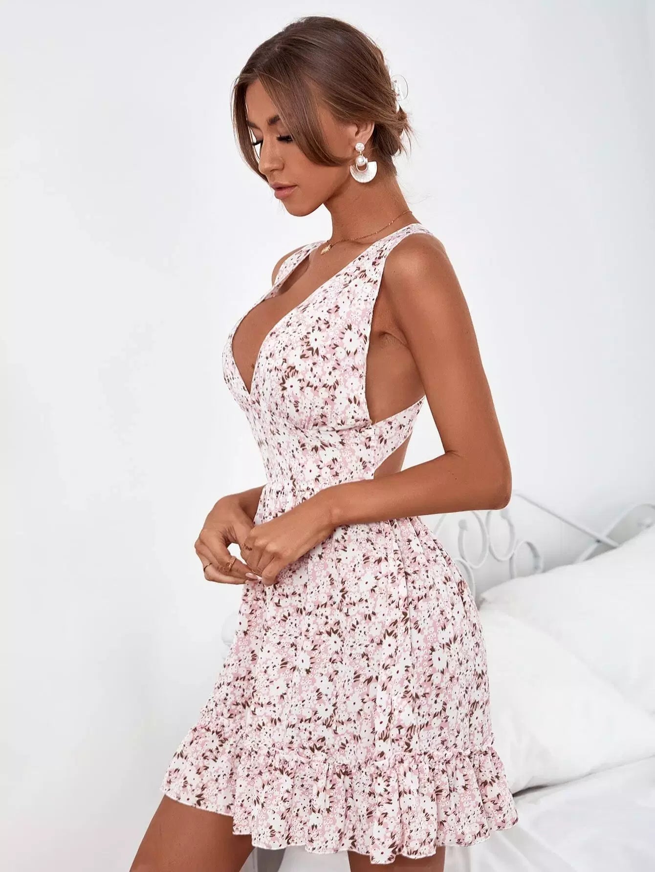 Crisscross Backless Ruffle Hem Ditsy Floral Dress
