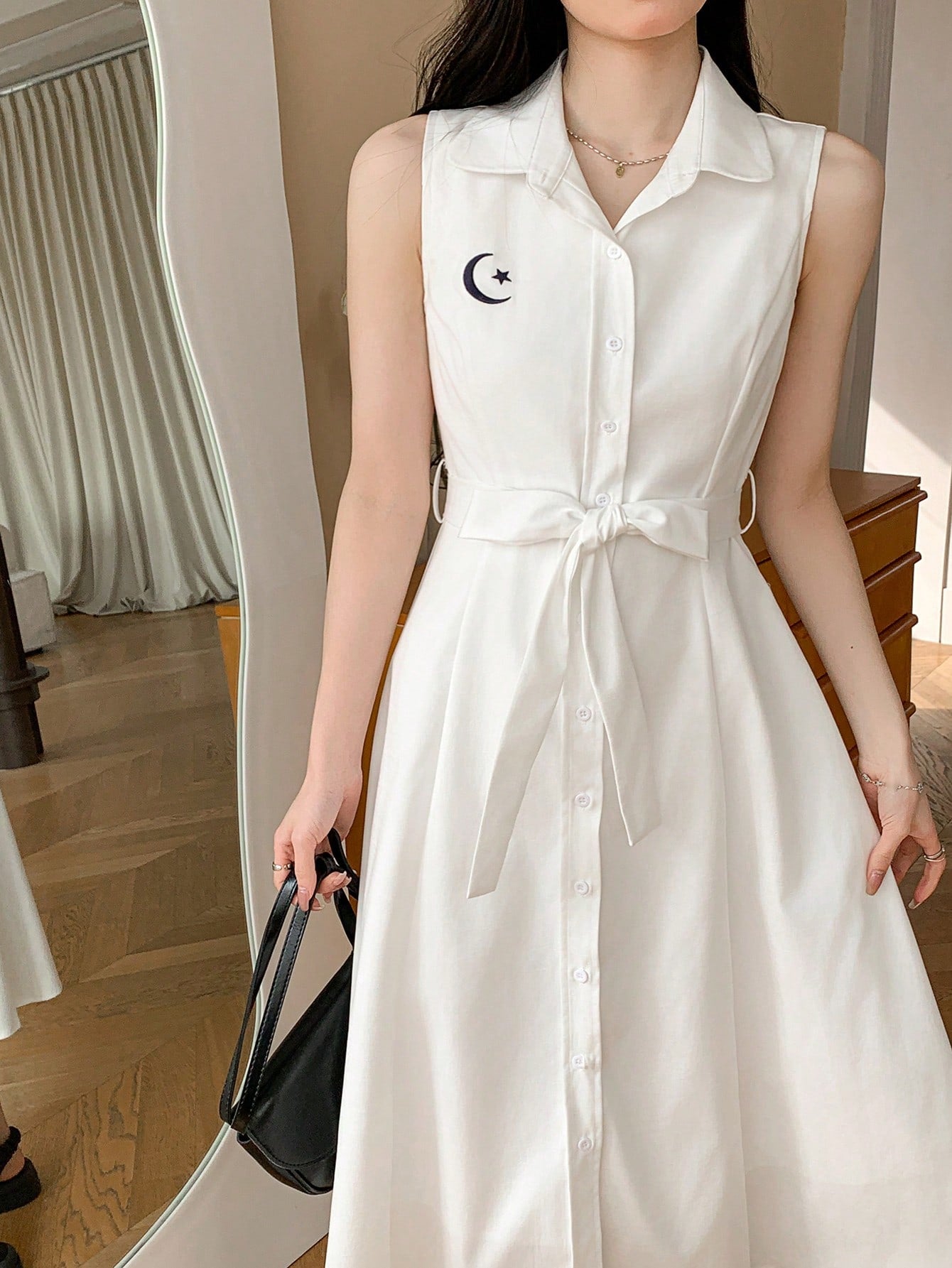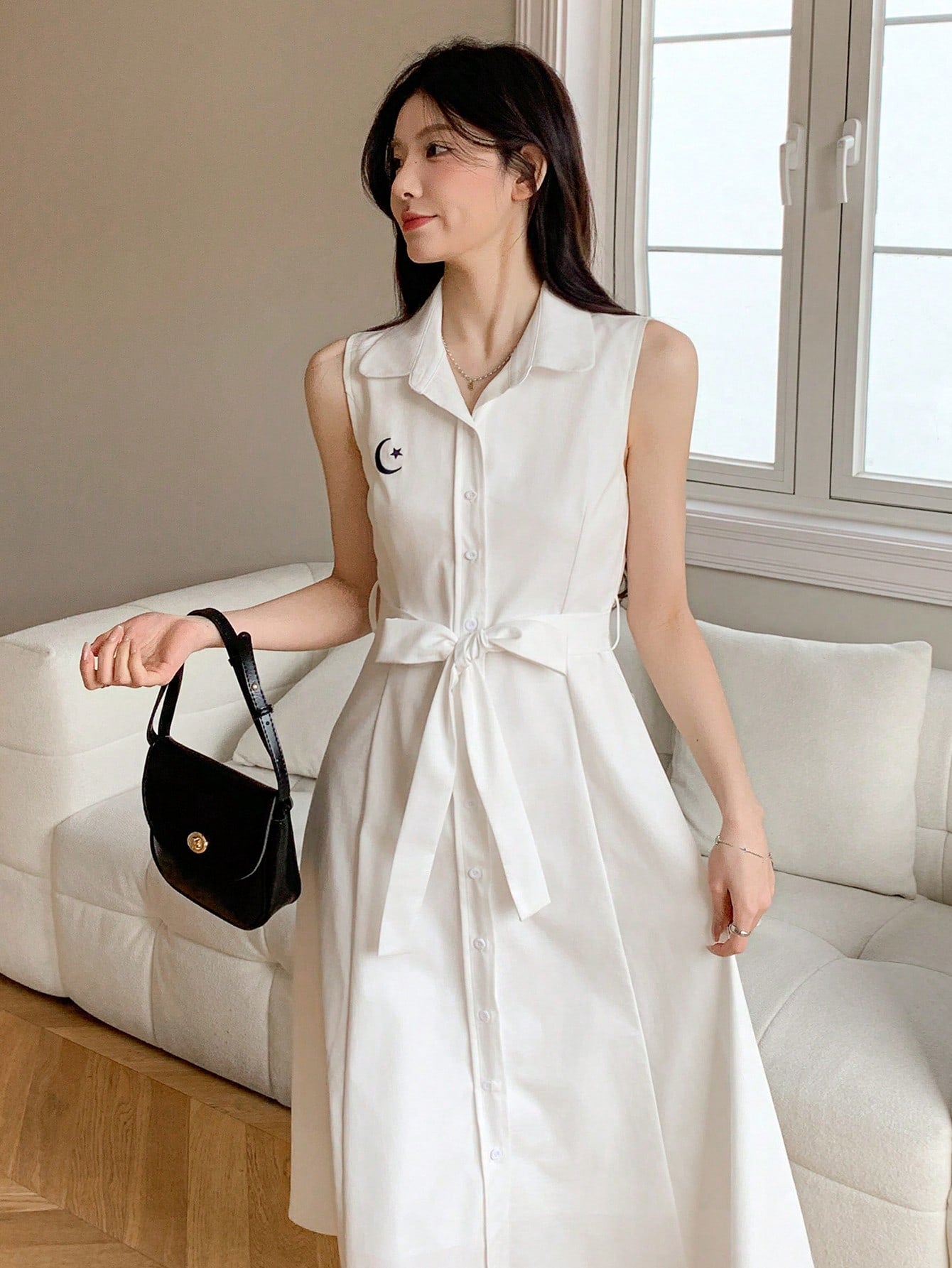 DAZY Embroidered Sleeveless Belted Mid-Length Dress For Women Sundress Shirt Dress,Casual Women Dresses