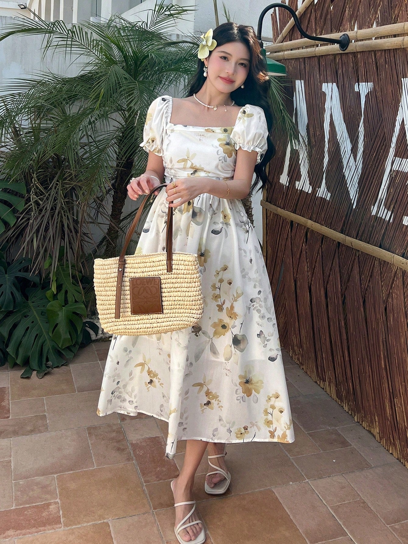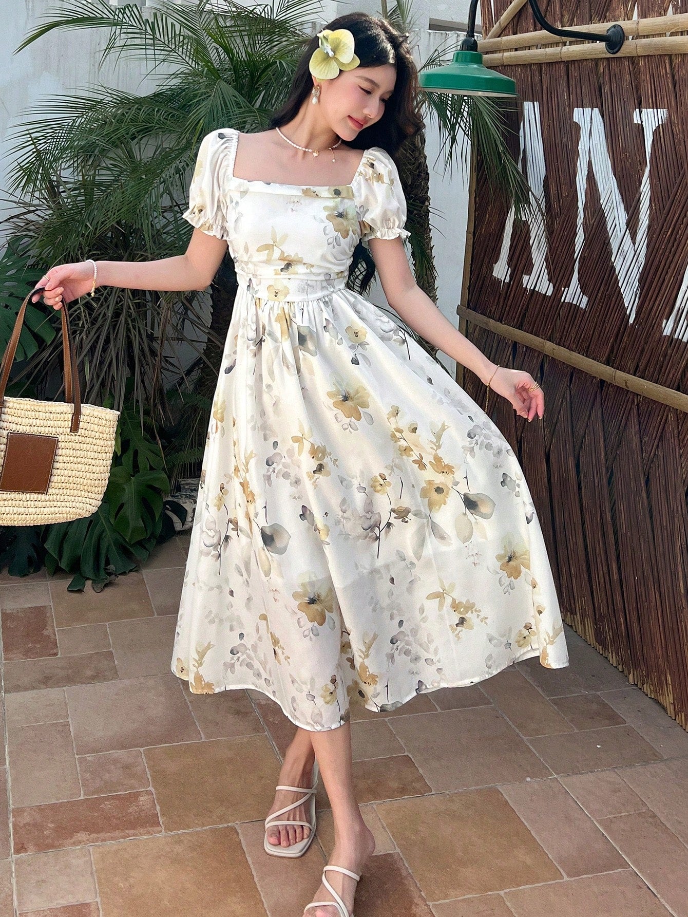 women DAZY Women Square Neck Short Sleeve Floral Long Dress