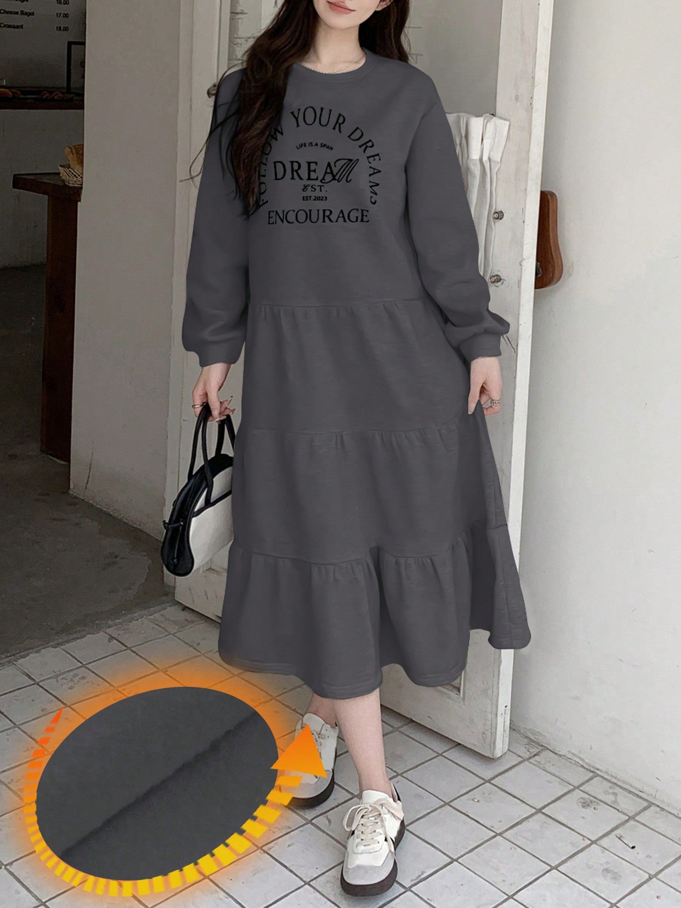 DAZY Women's Casual Letter Print Round Neck Long Sleeve Ruffle Hem Dress, Autumn/Winter,Fall Women Clothes