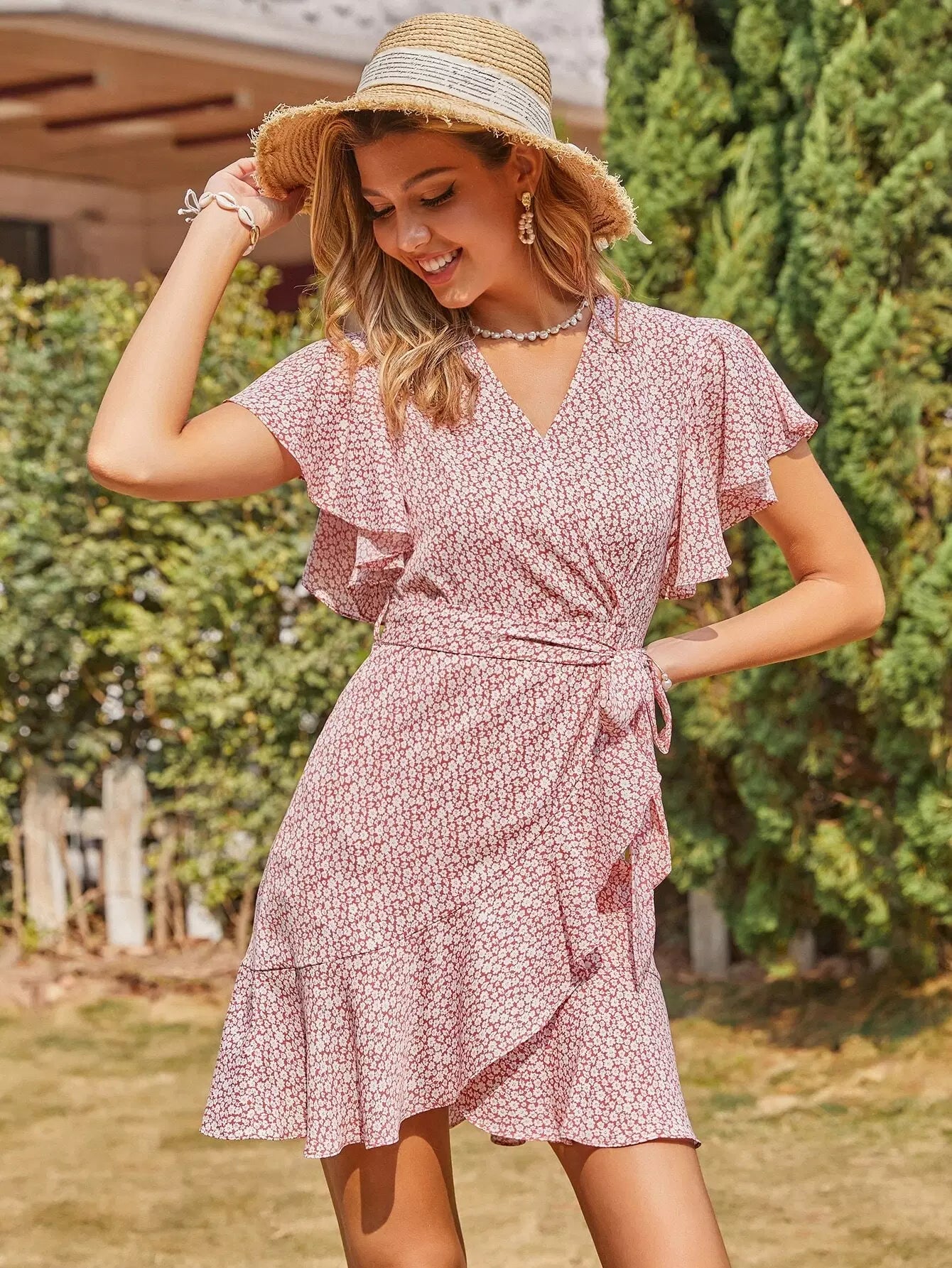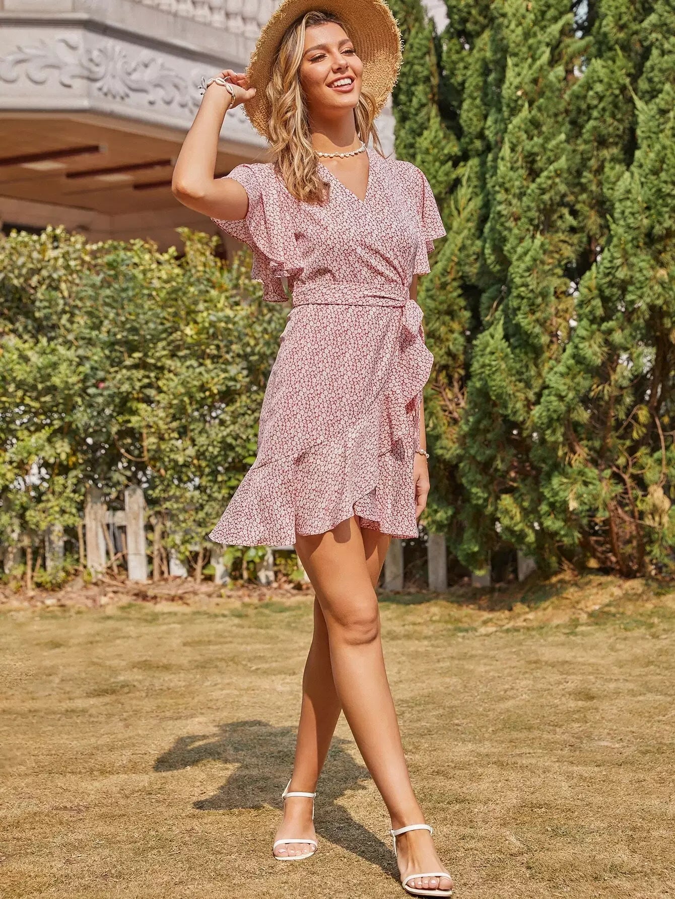 Ditsy Floral Print Butterfly Sleeve Wrap Dress Without Belt