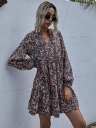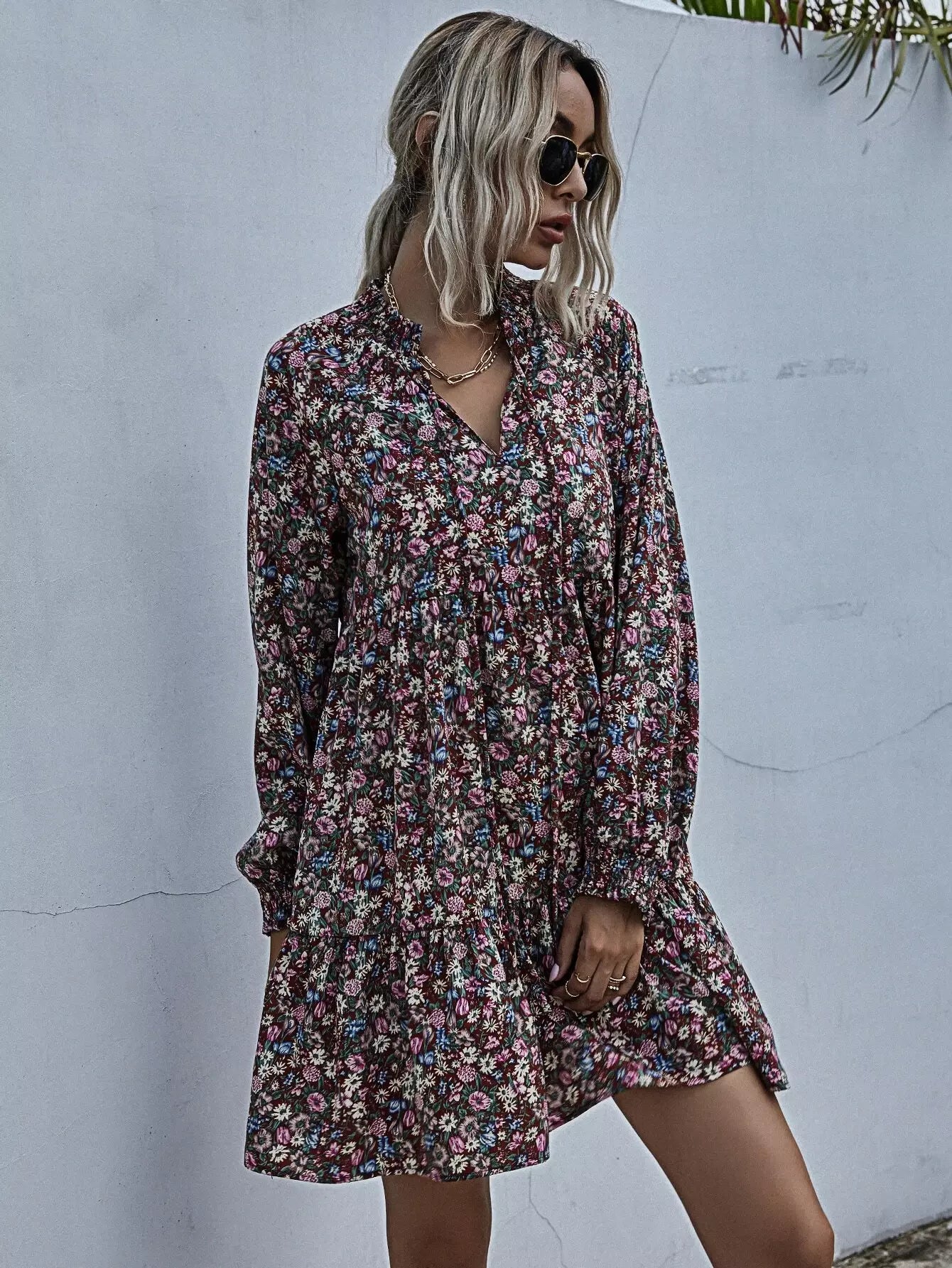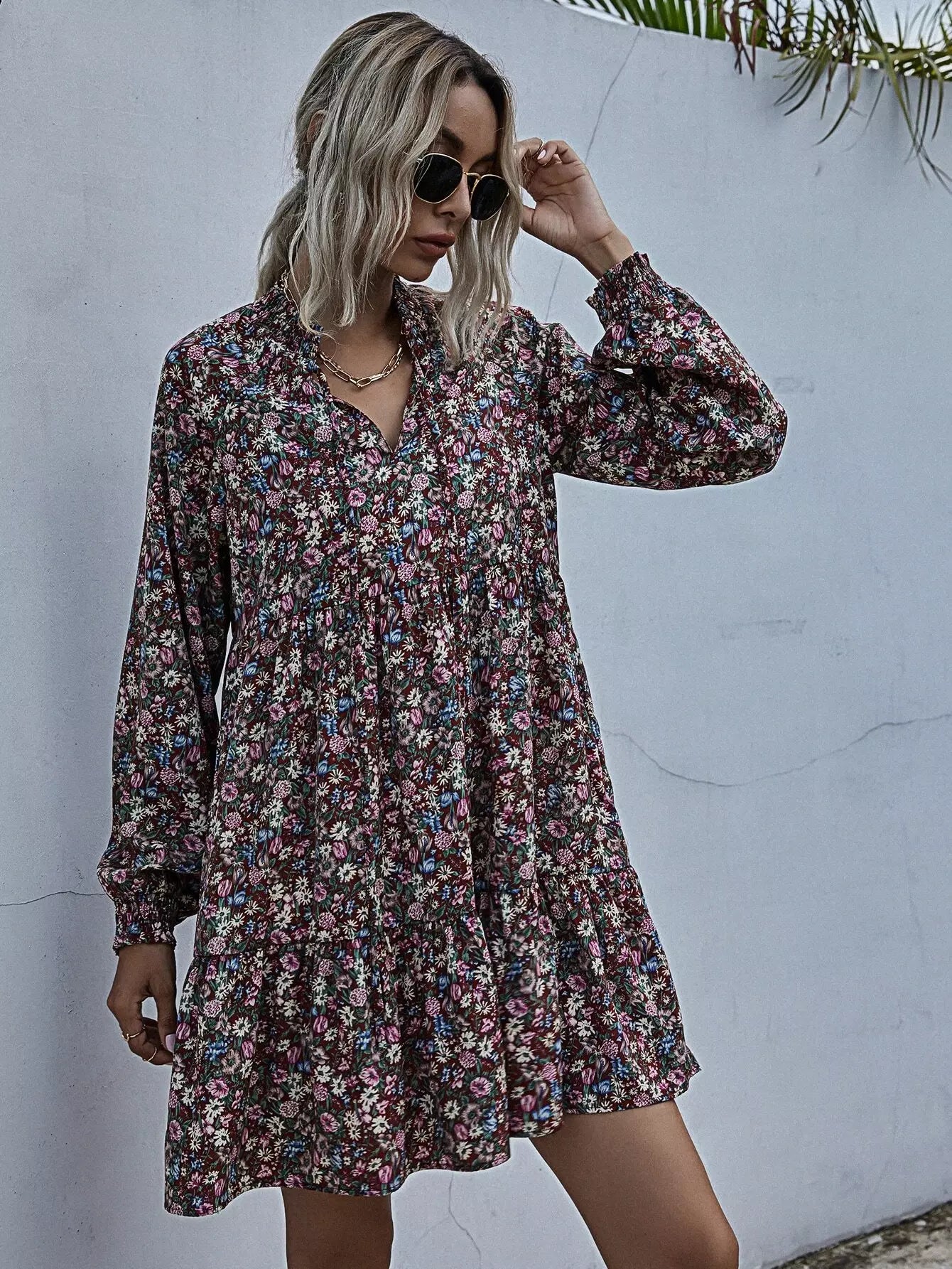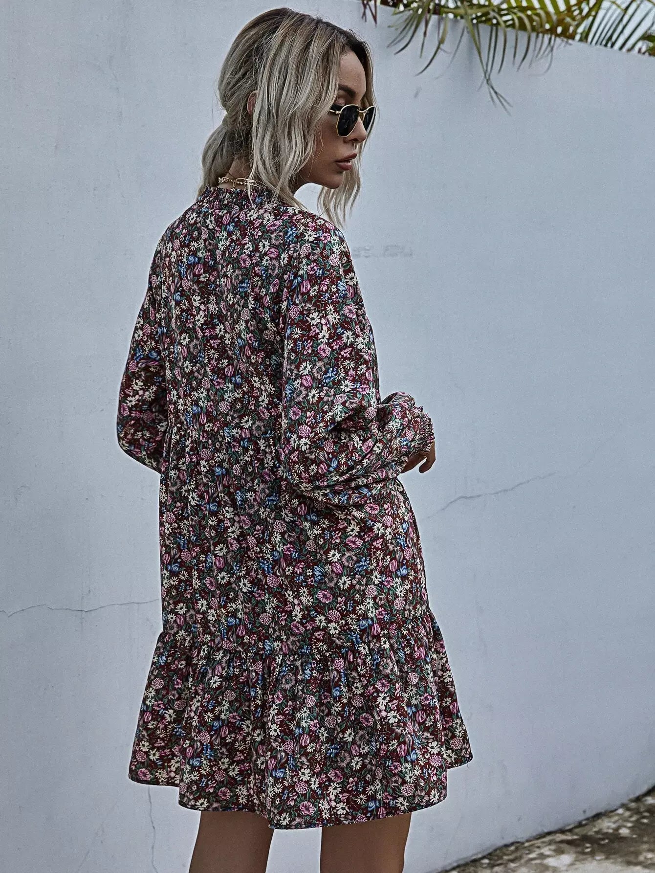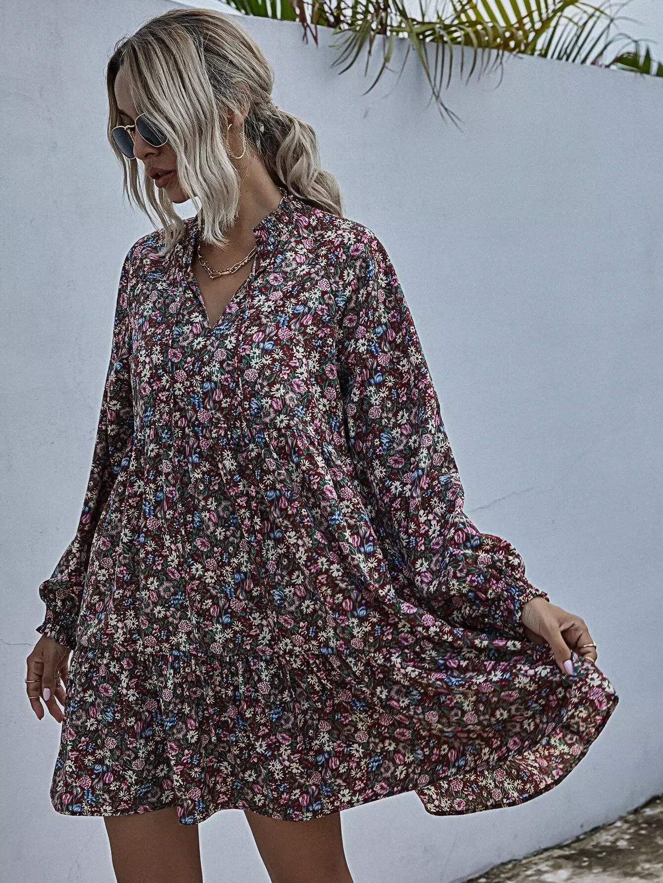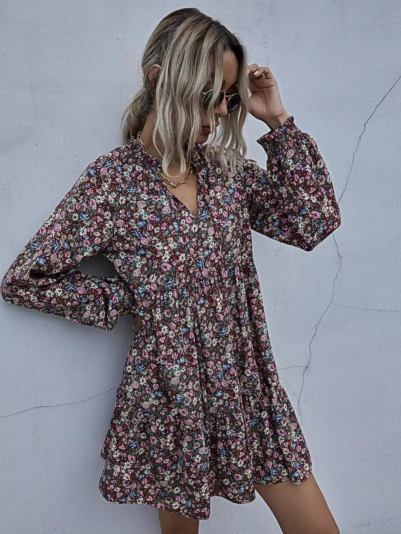 Ditsy Floral Print Shirred Cuff & Neck Dress