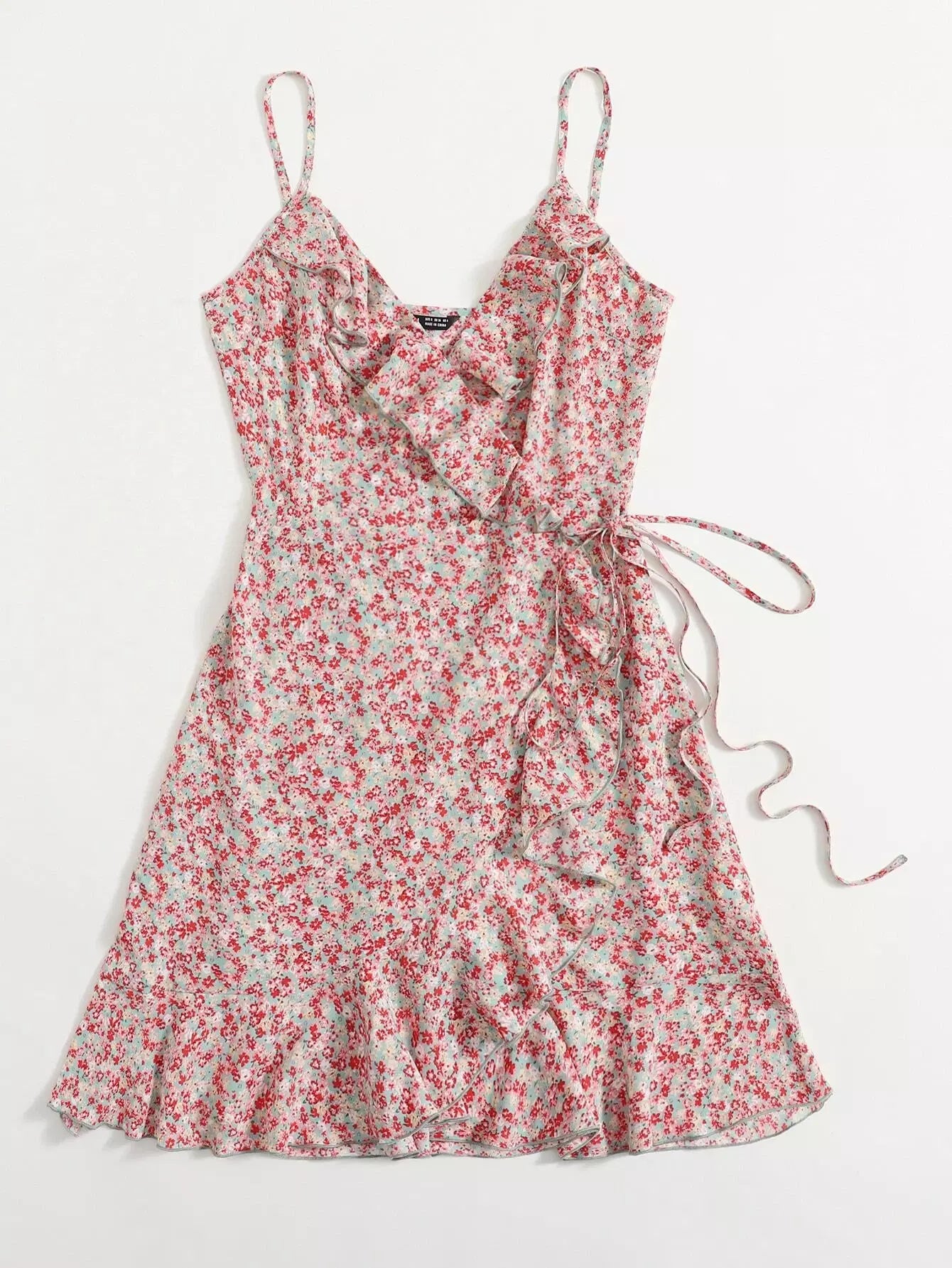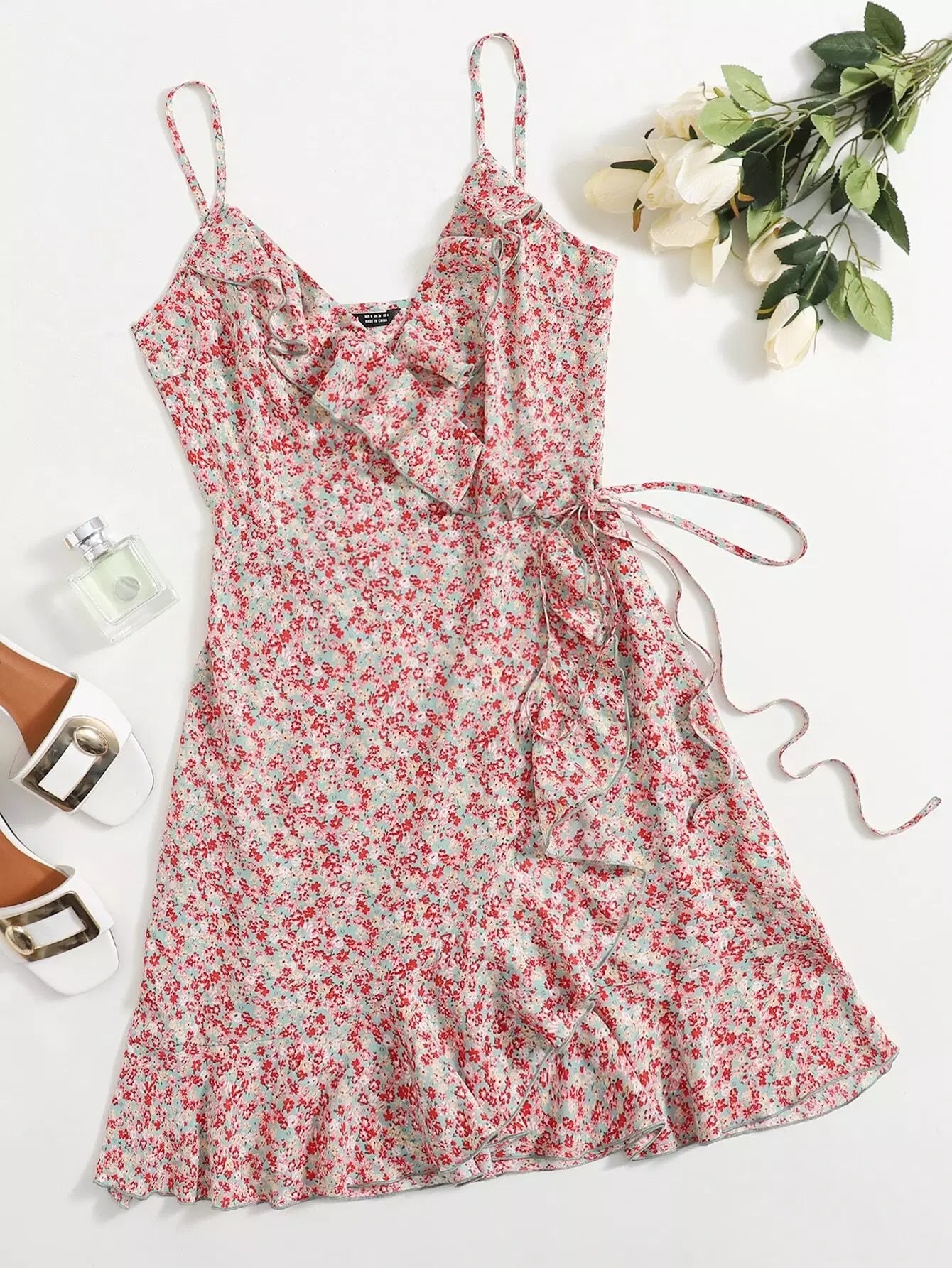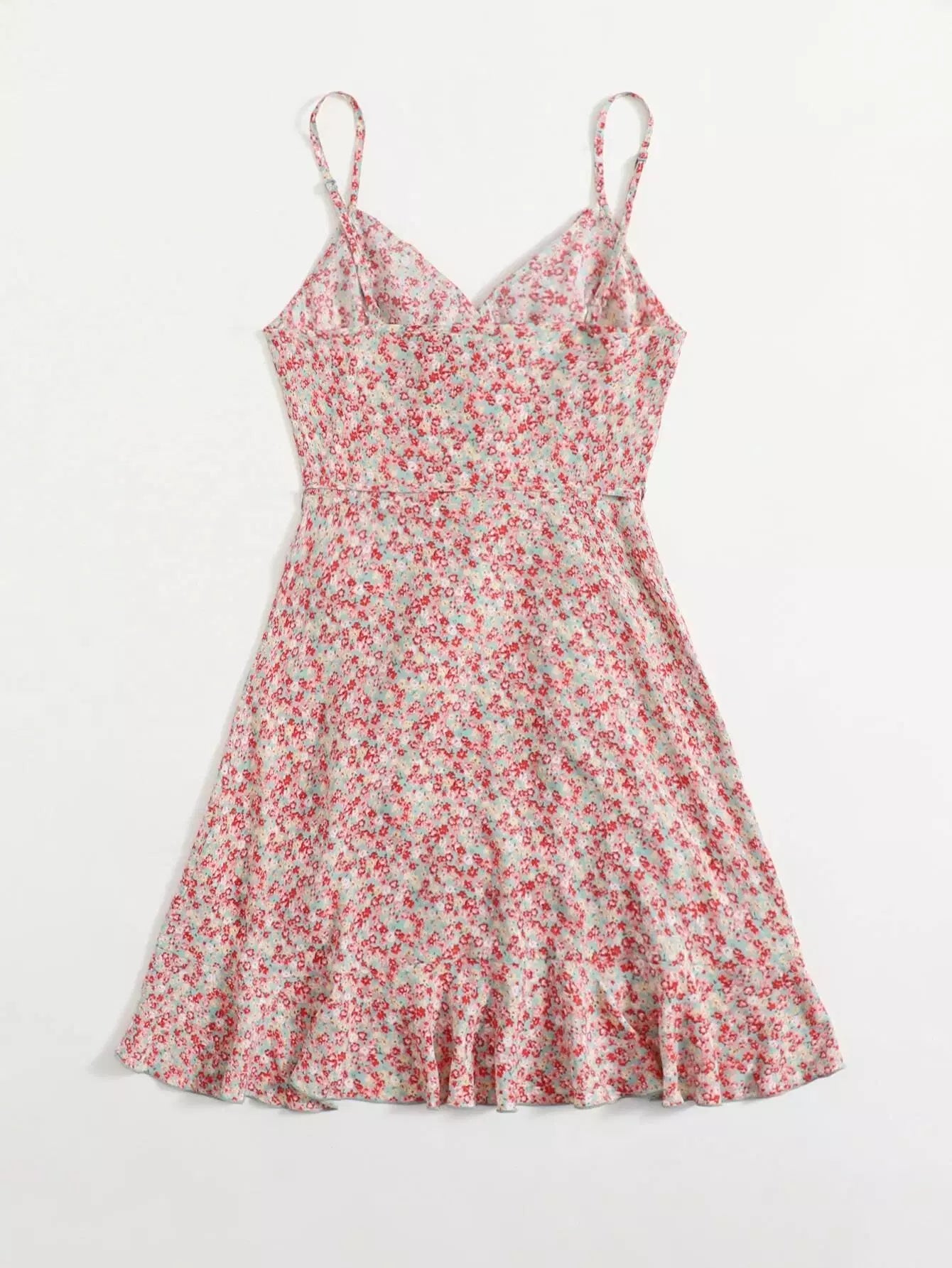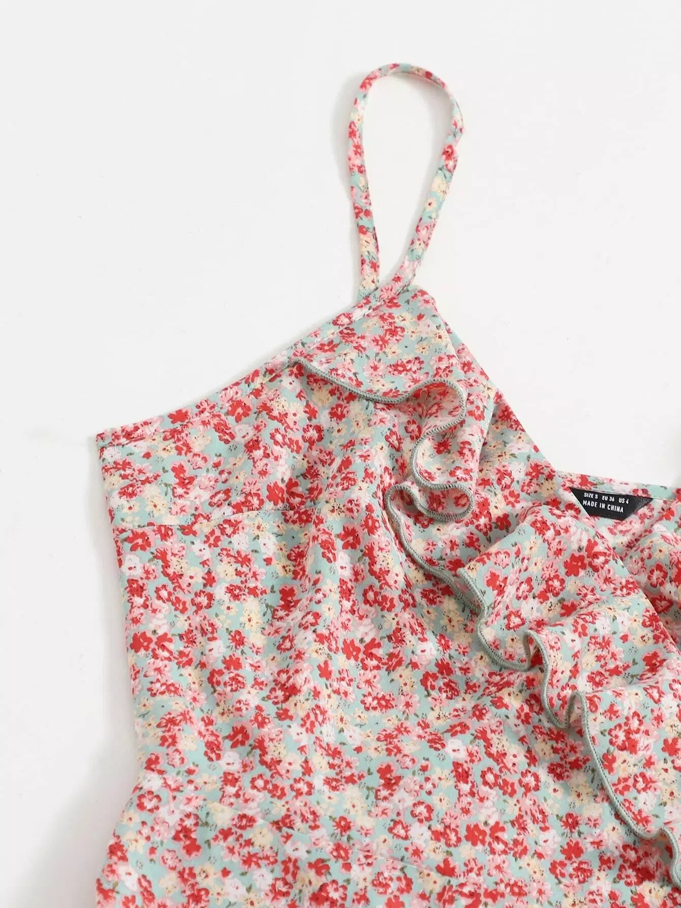 Ditsy Floral Print Tie Side Ruffle Trim Cami Dress