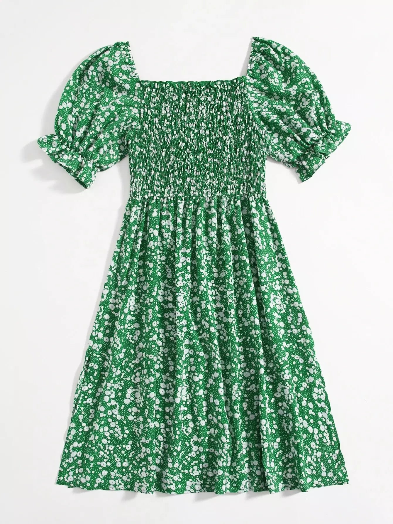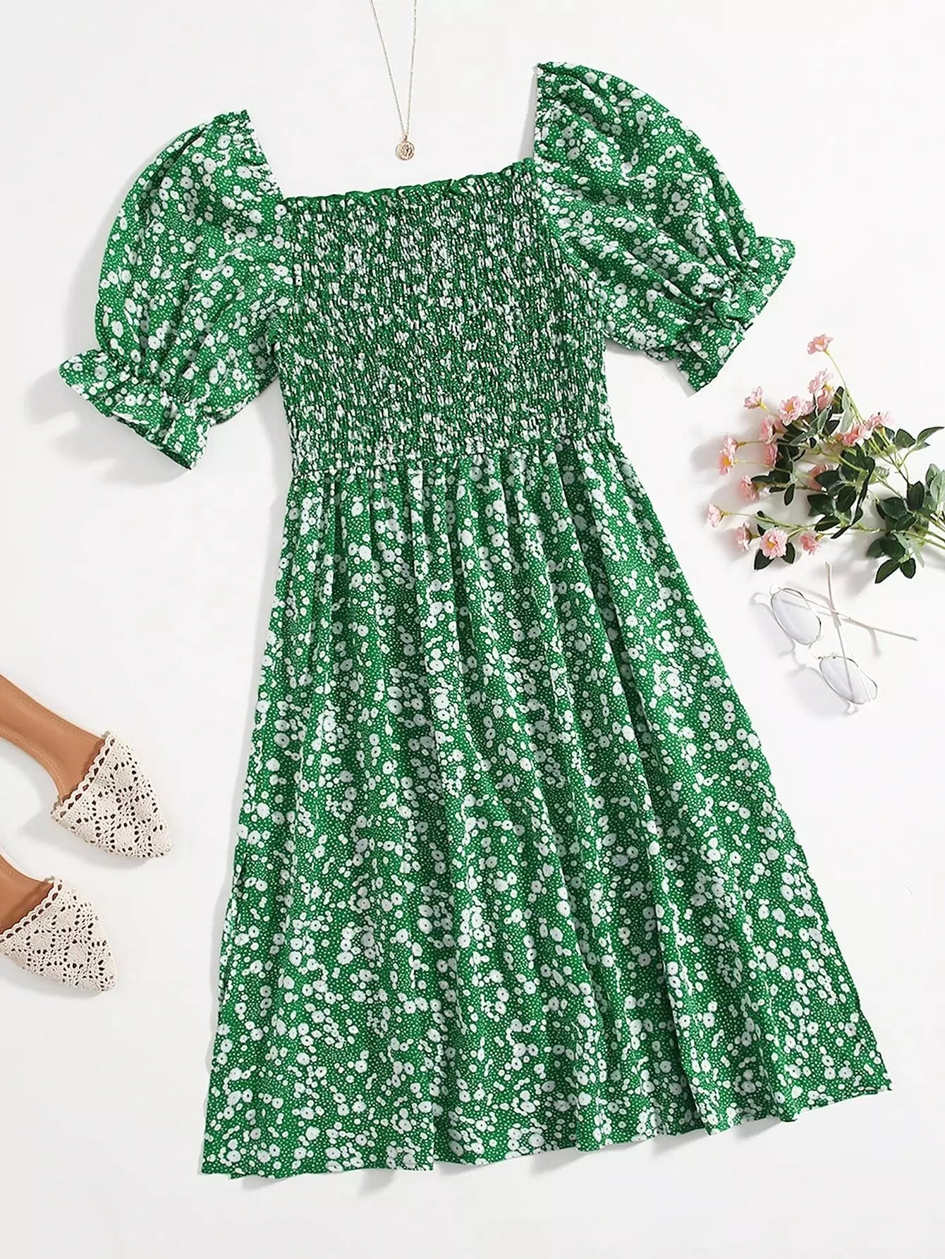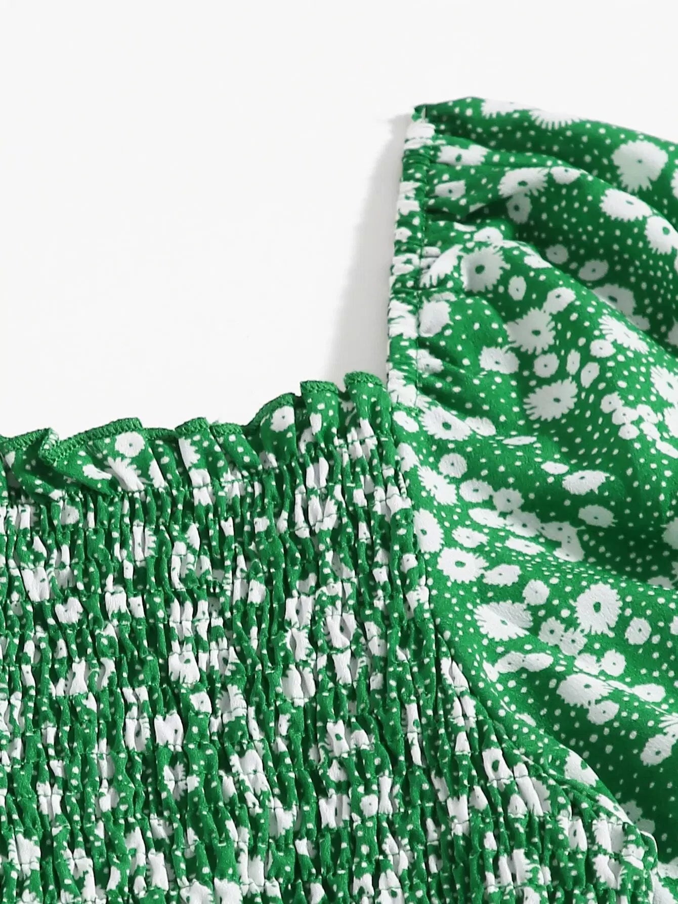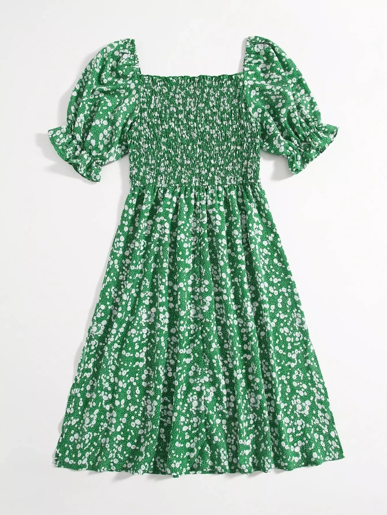 Ditsy Floral Shirred Puff Sleeve Flared Dress