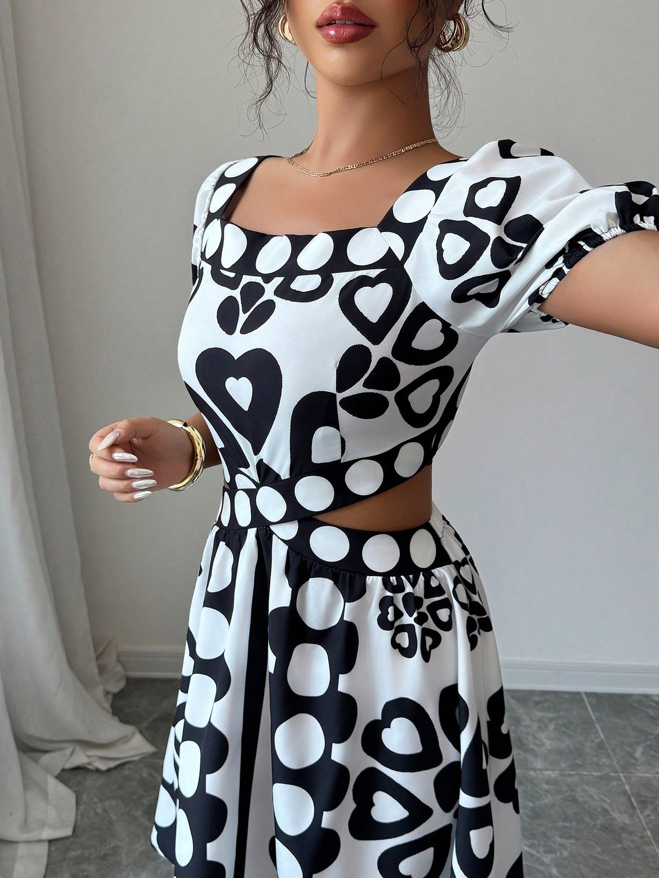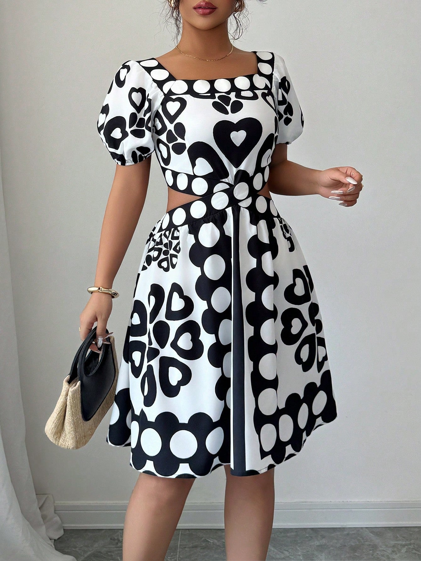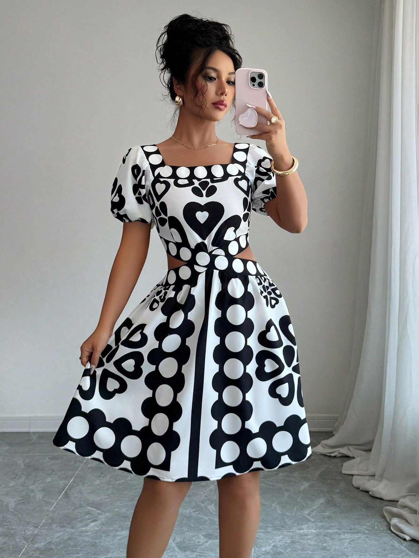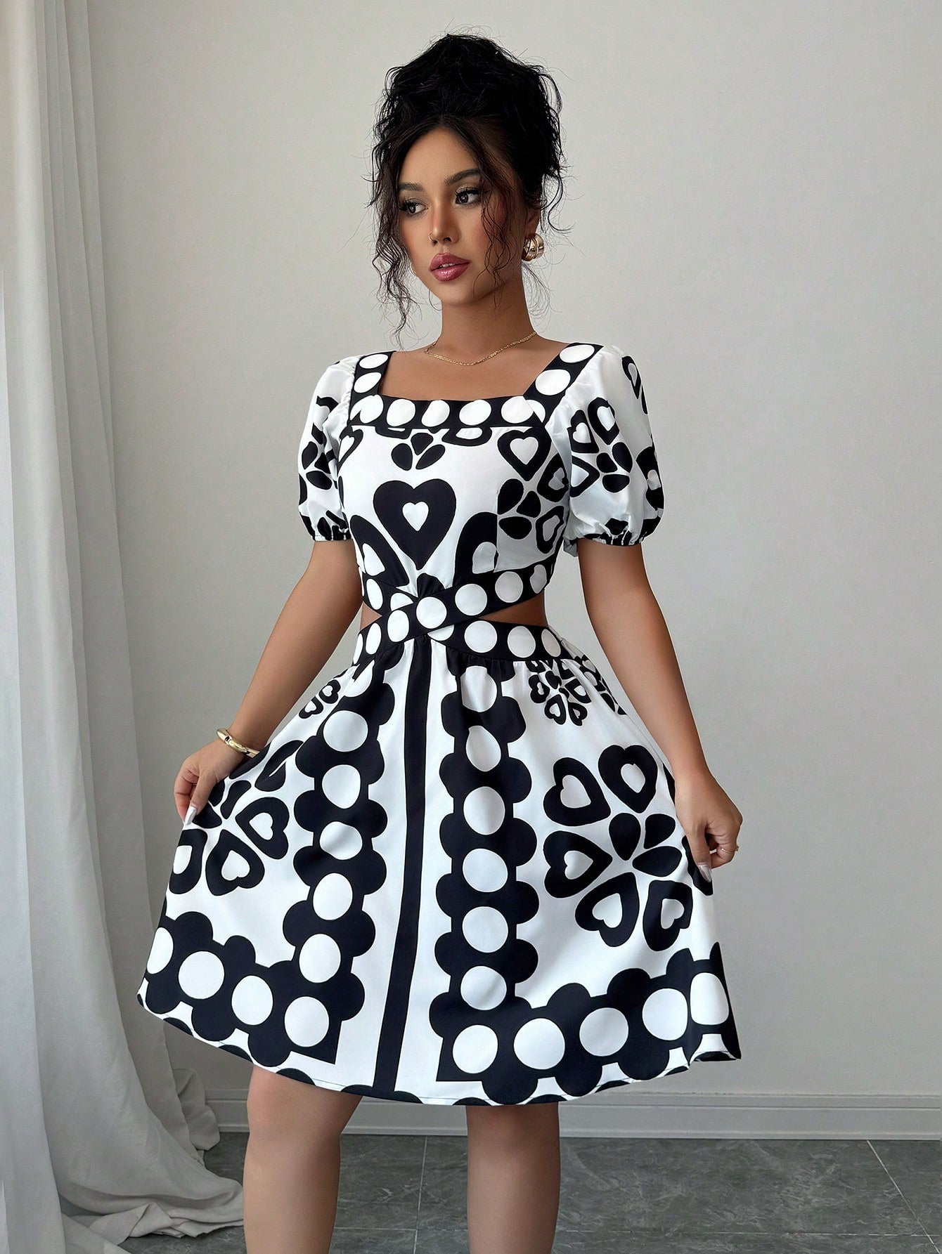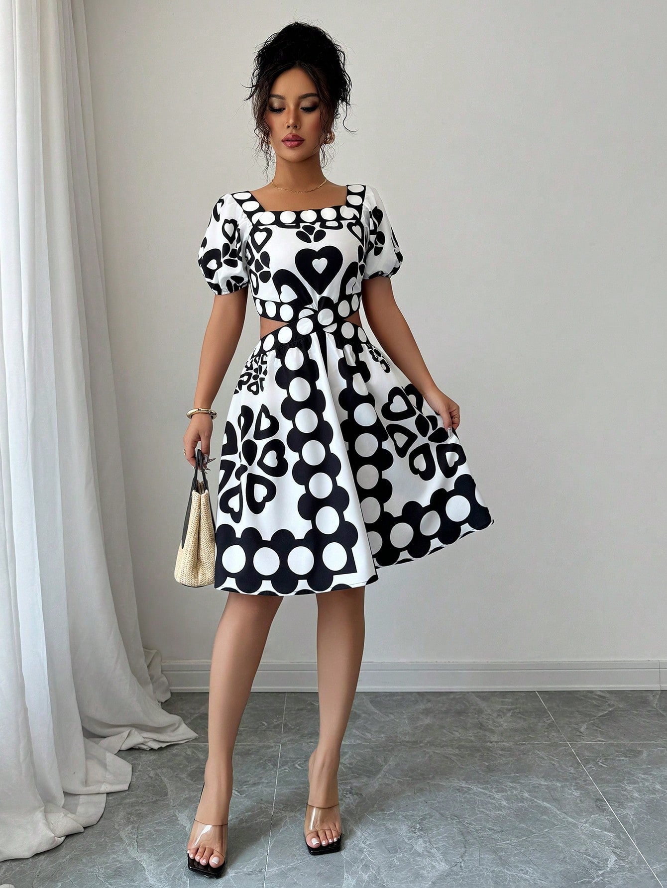 Elenzga Women's Elegant Floral Print Off Shoulder Puff Sleeve Dress