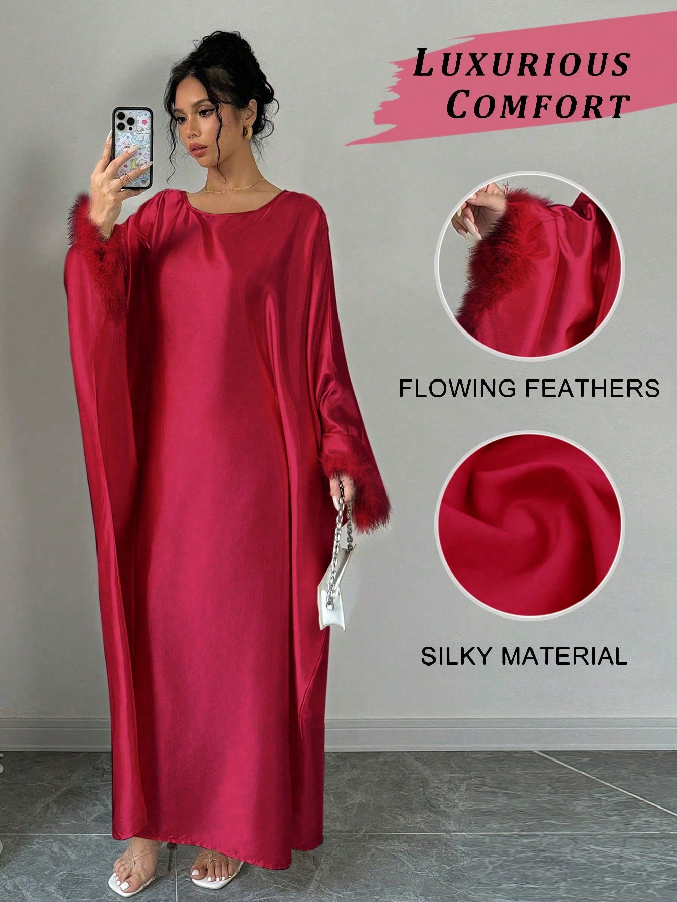 Elenzga Women's Round Neck Long Sleeve Loose Fashion Casual Robe Dress Maxi Satin Women Outfit