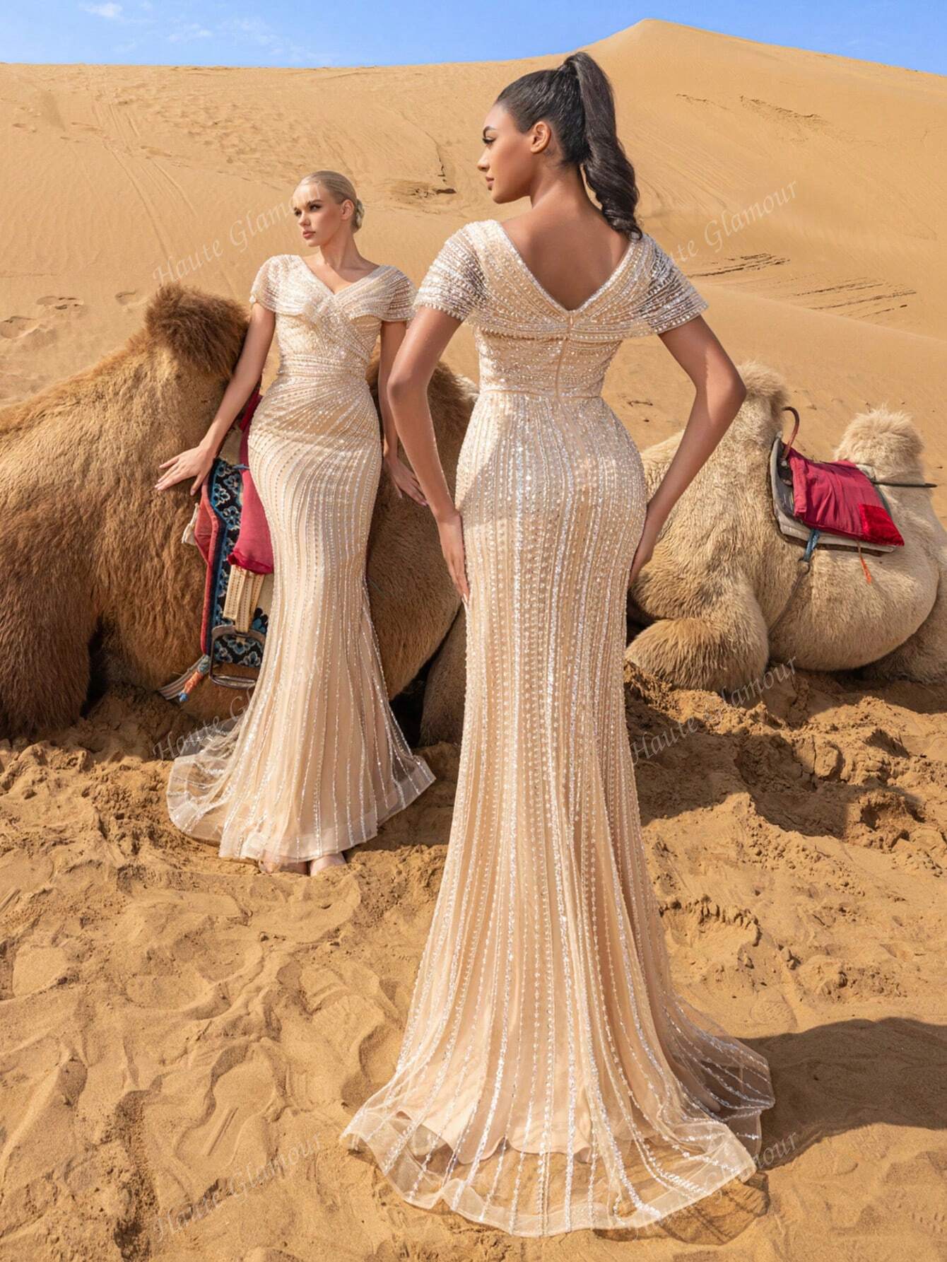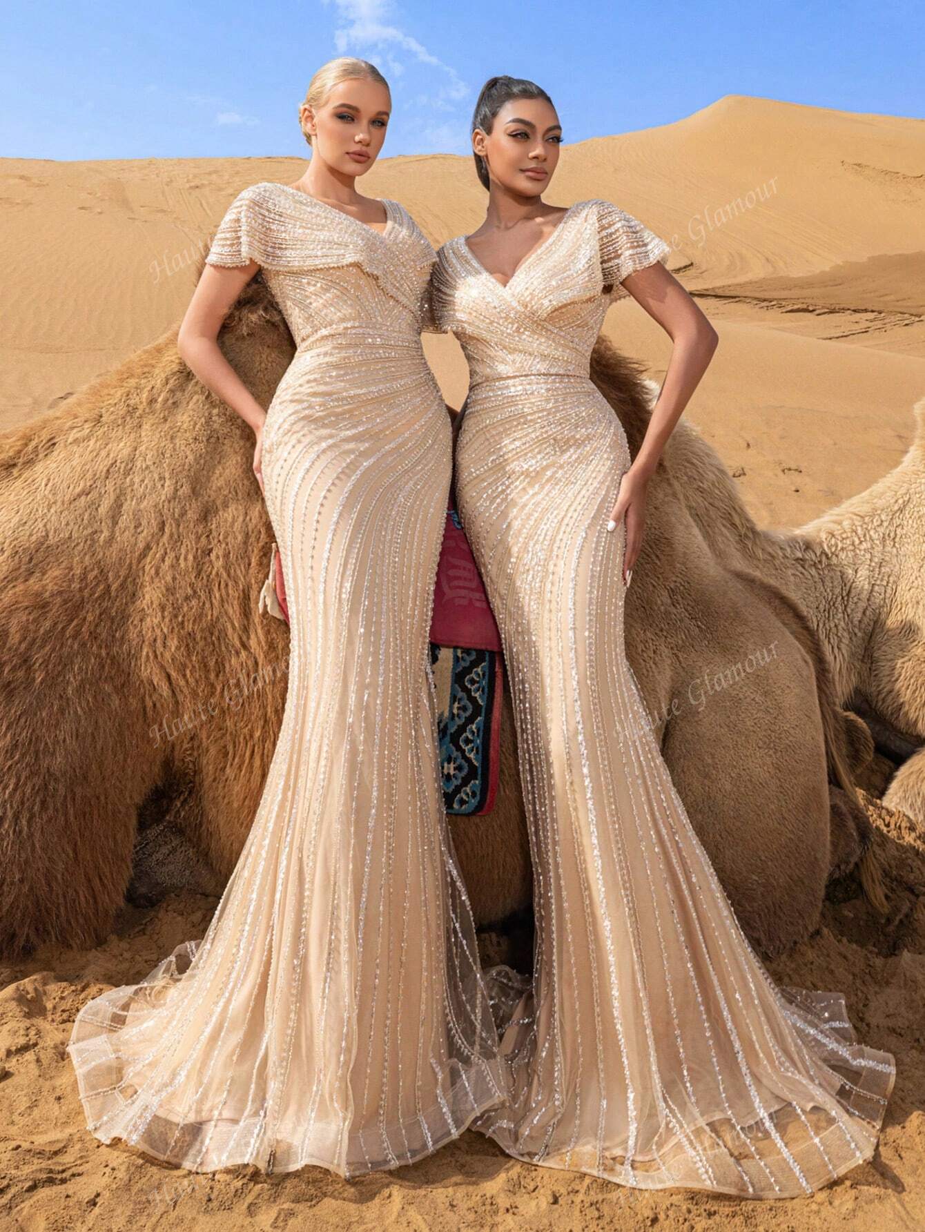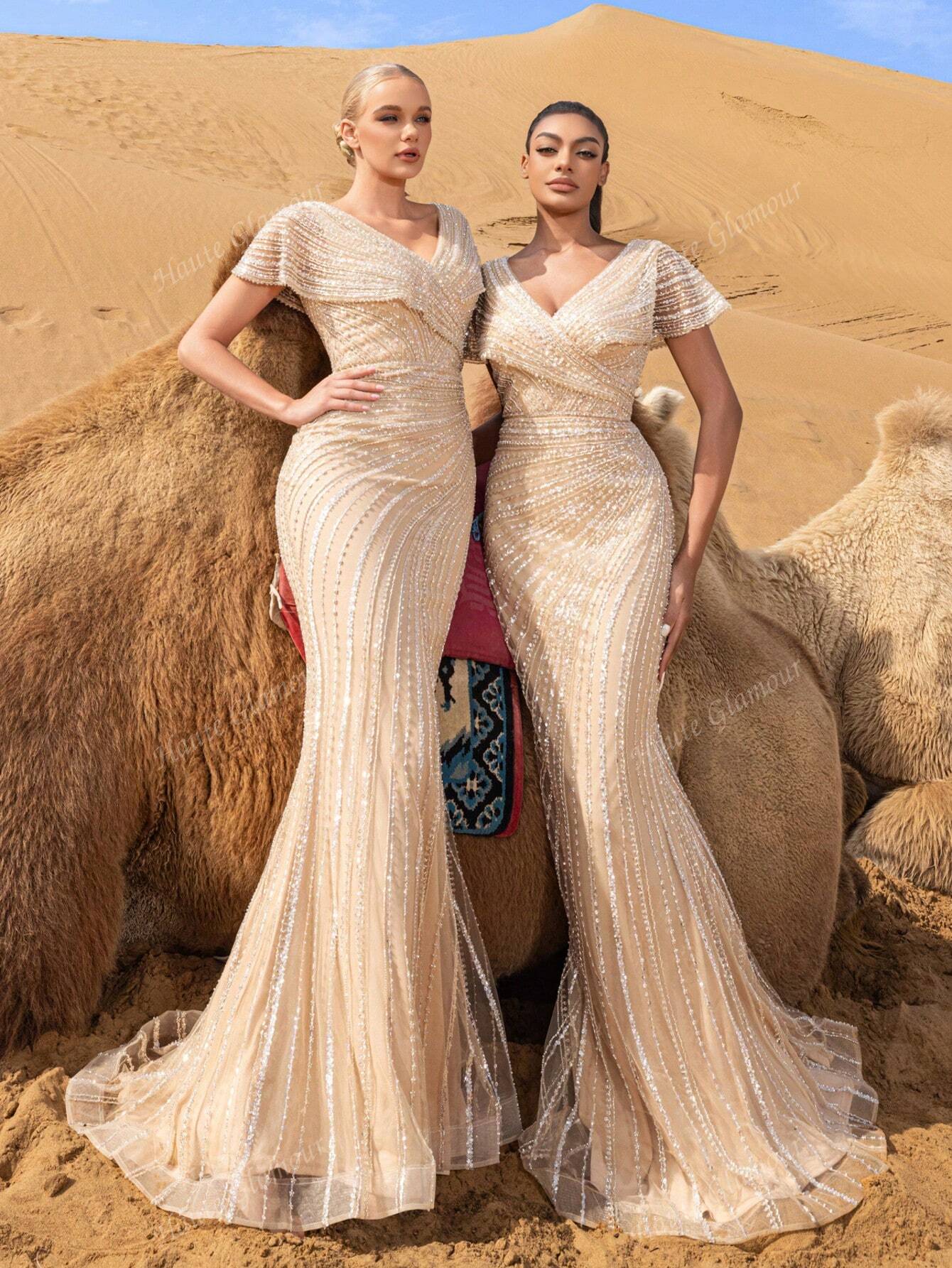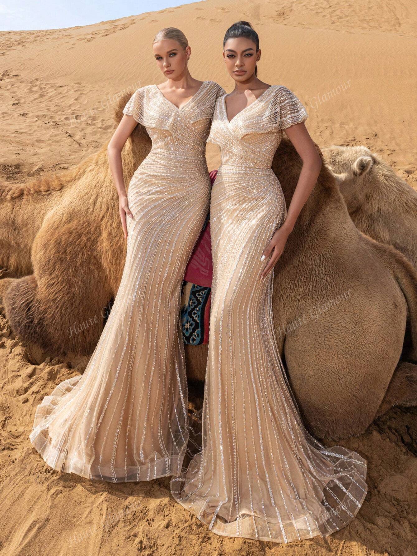 Faeriesty Haute Glamour Luxury Beaded V-Nck Mermaid Evening Gown With Sculpted Silhouette & Dramatic
