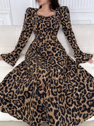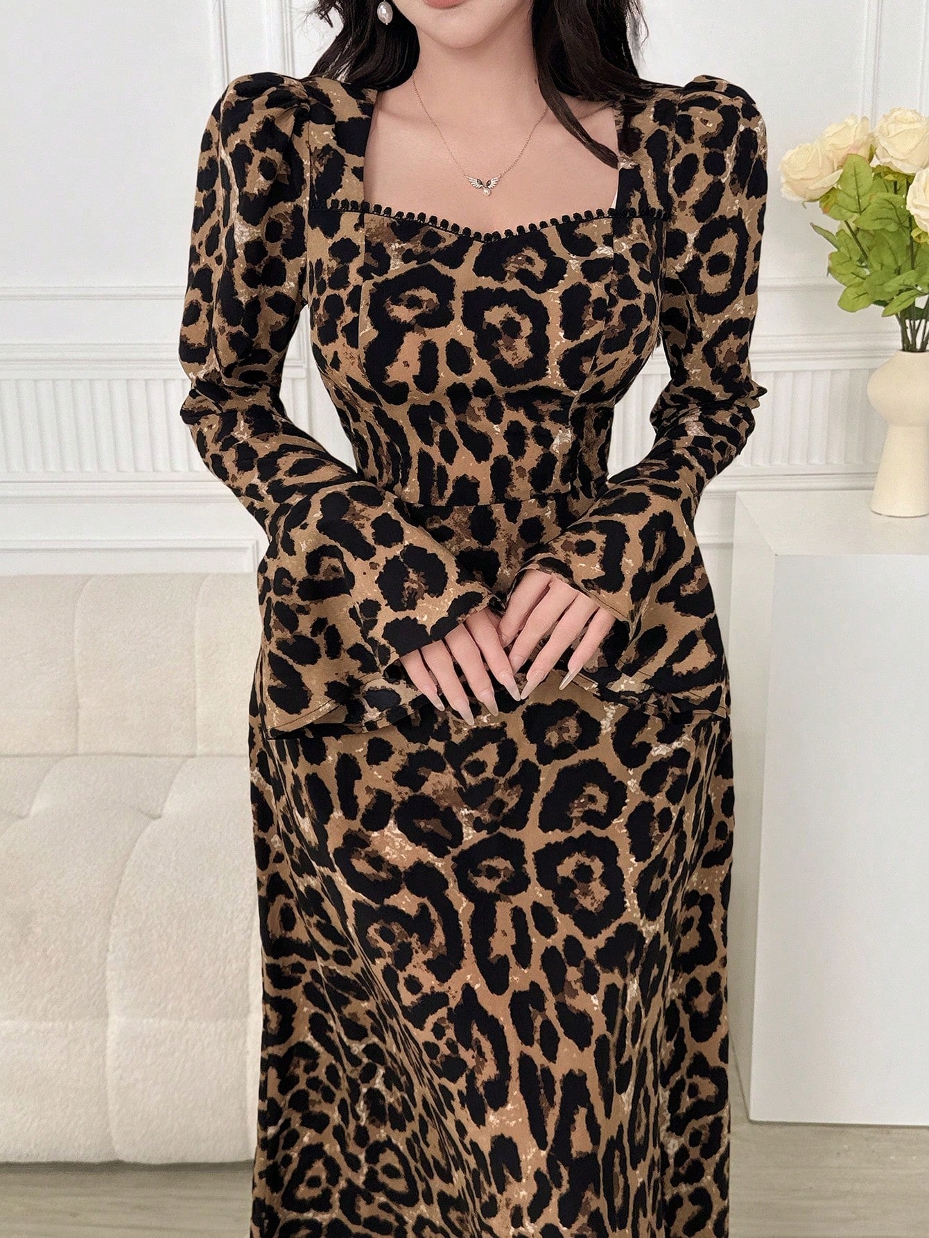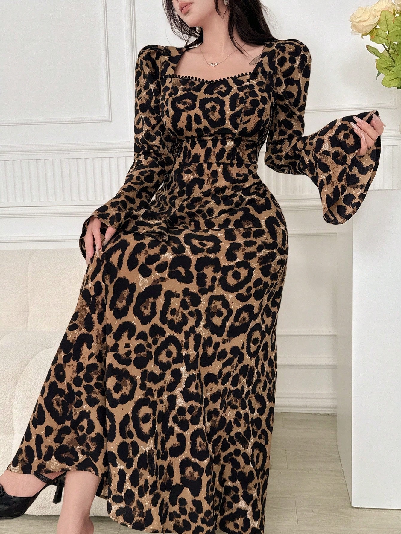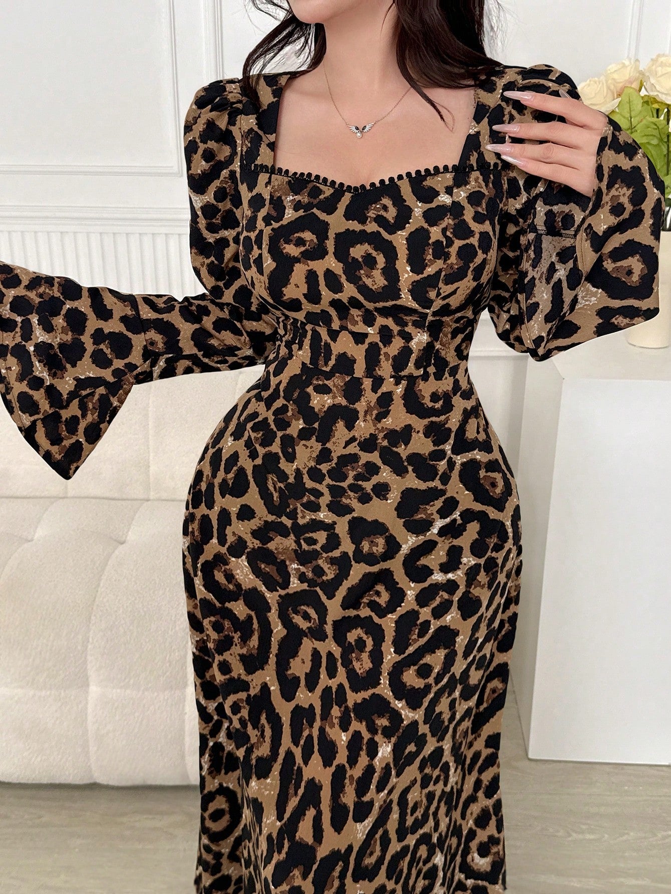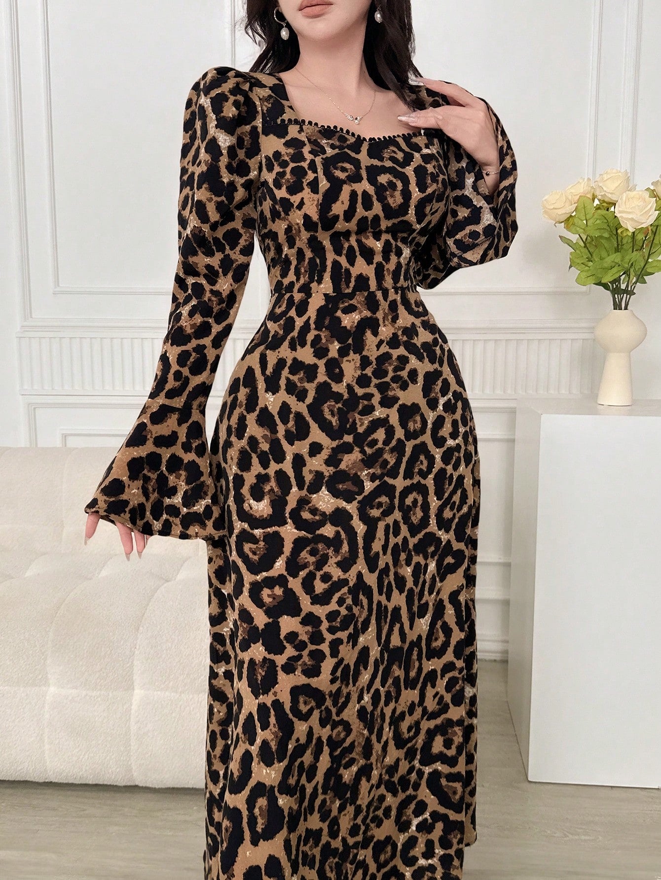 Feyla Women's Fashion Leopard Print Flare Sleeve Dress For Autumn Elegant Women Dresses Long Evening Dresses