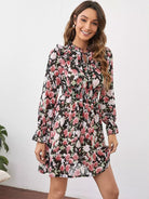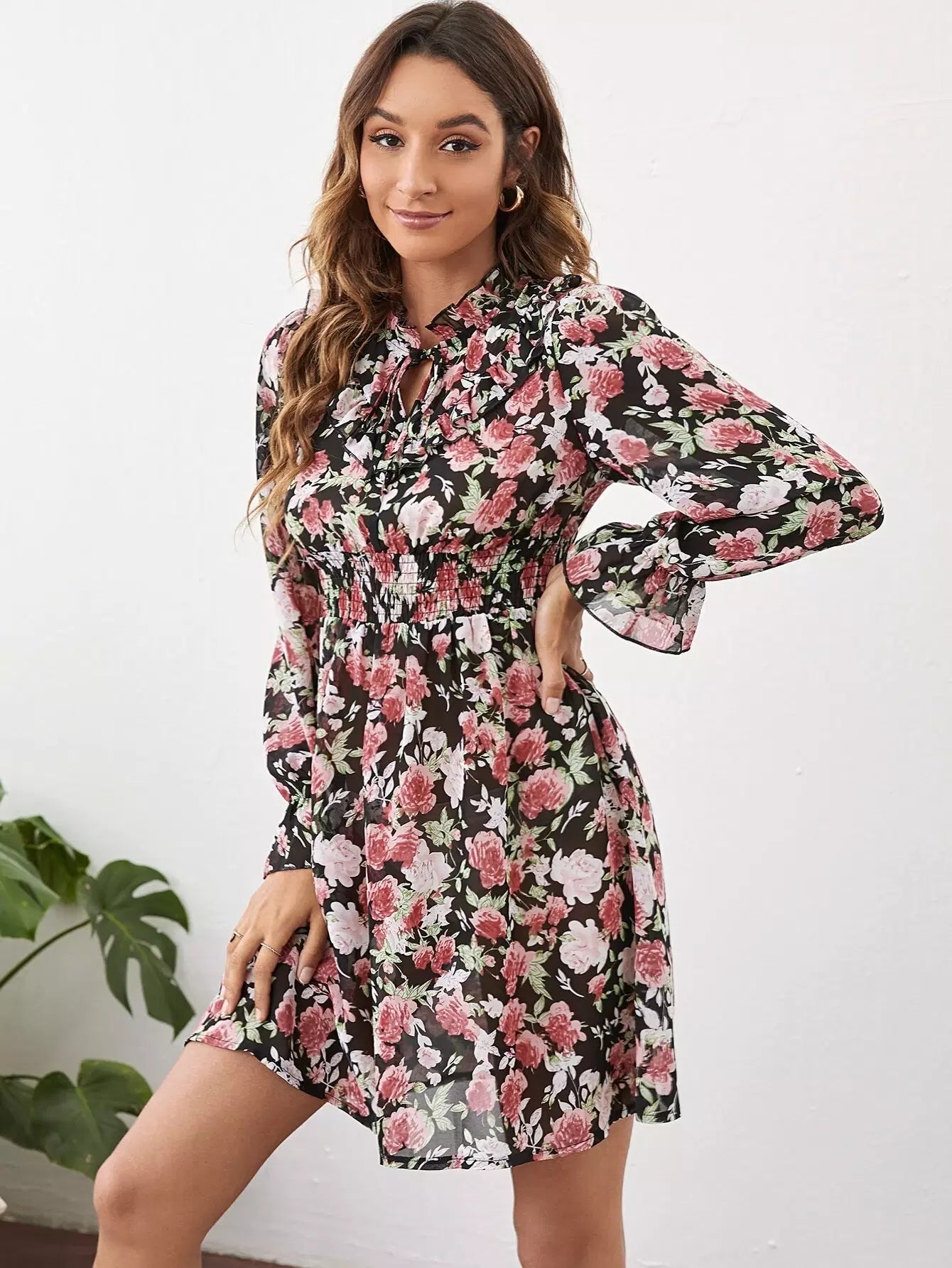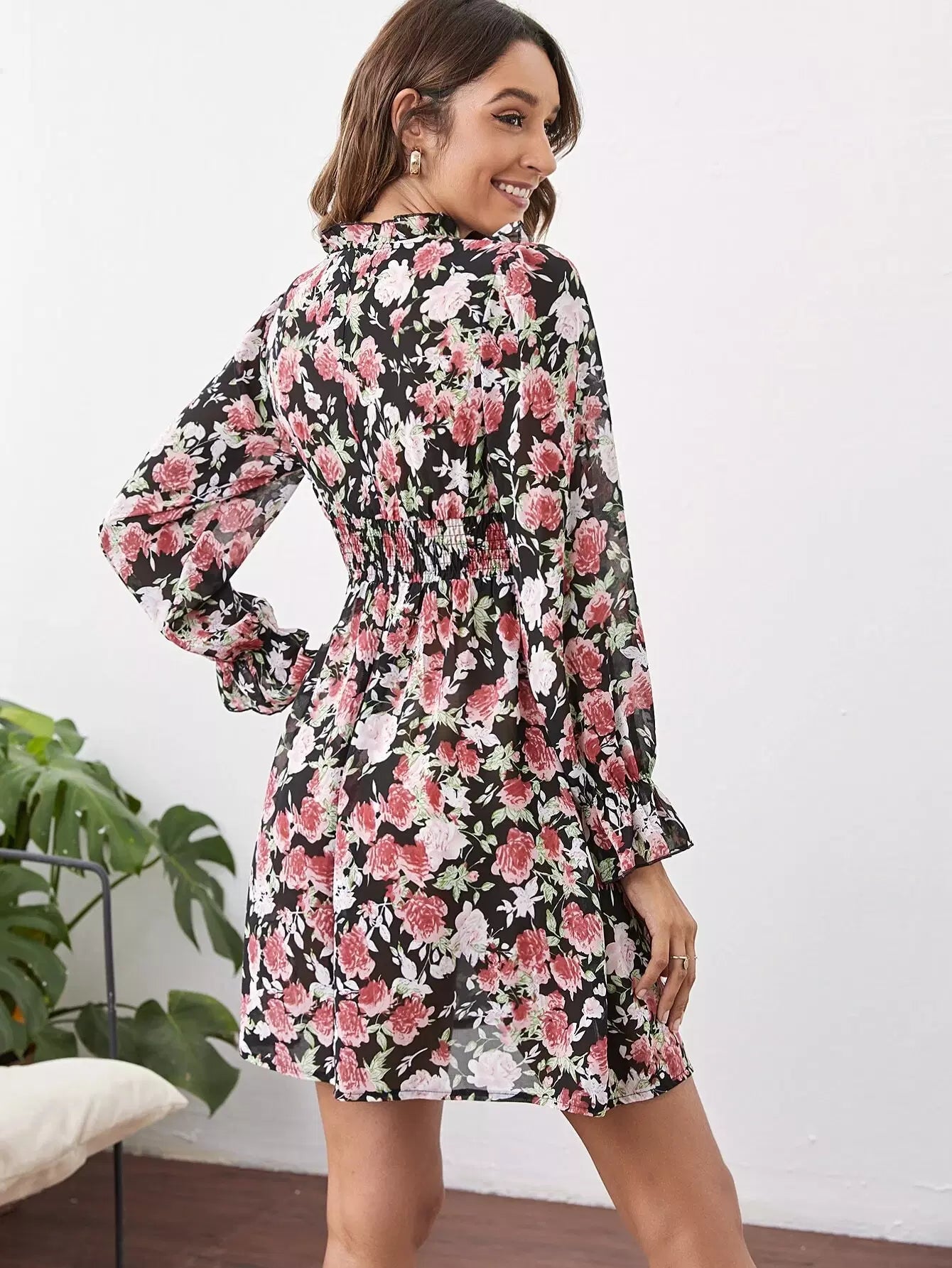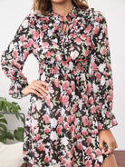 Floral Print Tie Neck Frill Trim Shirred Dress