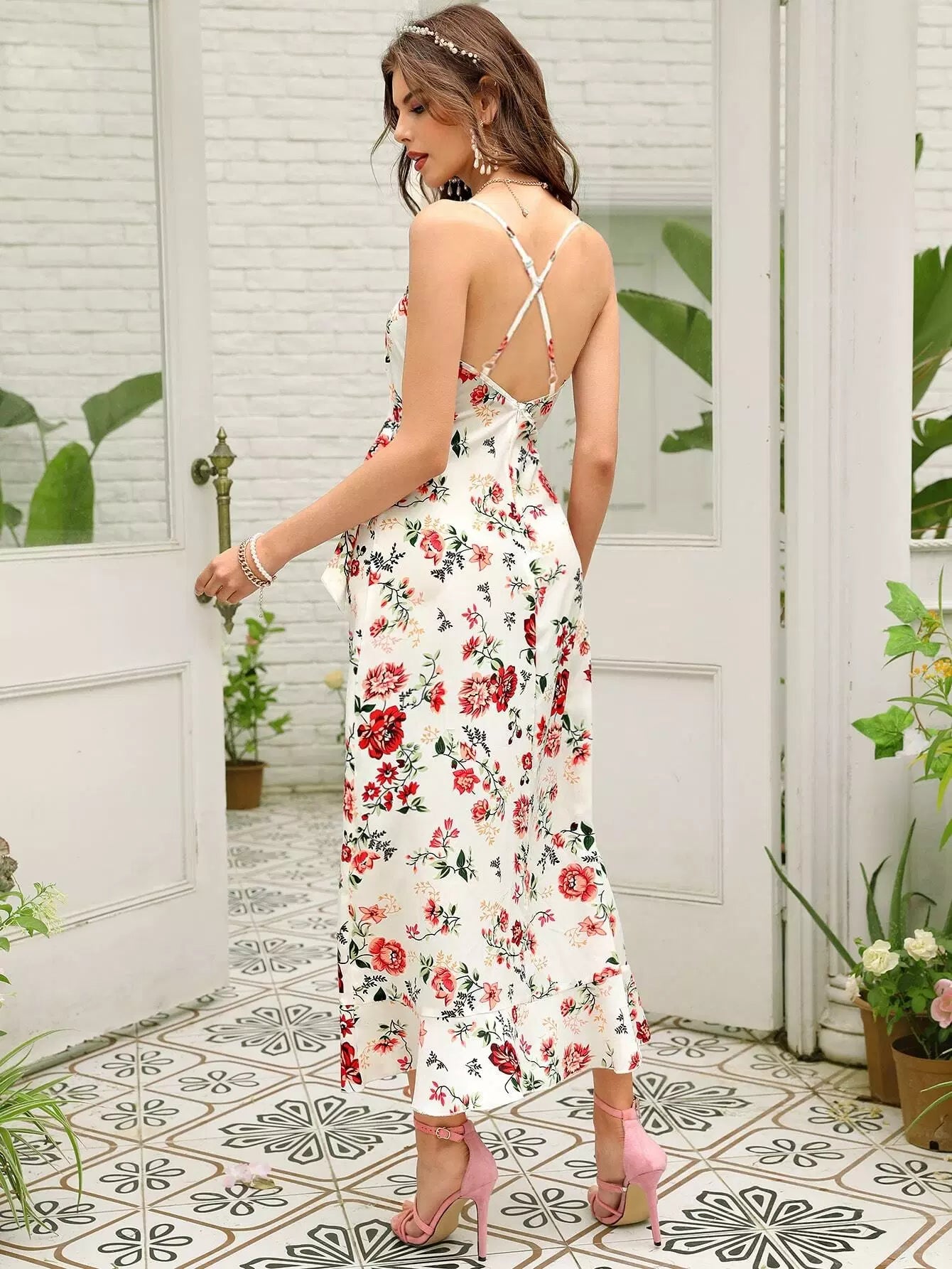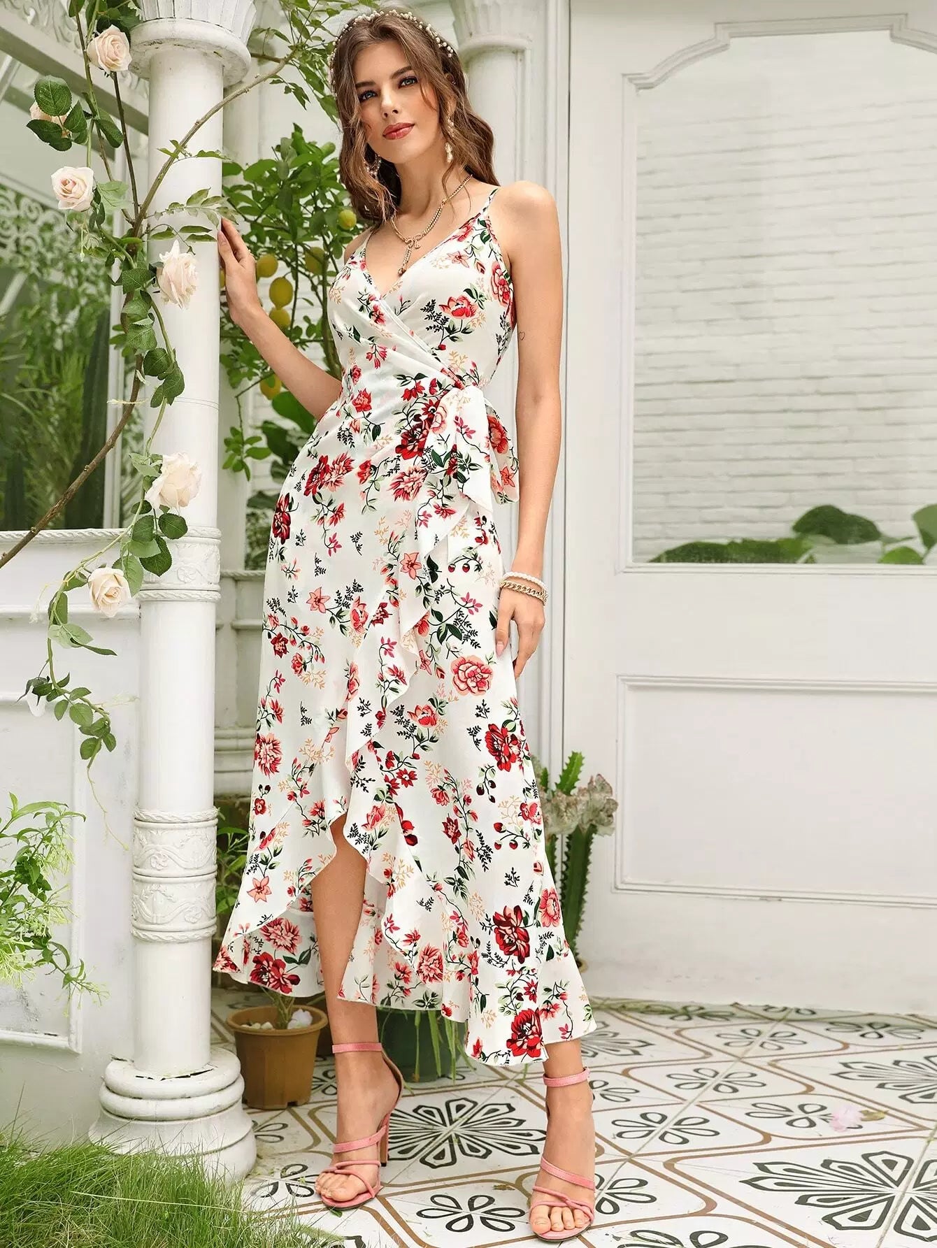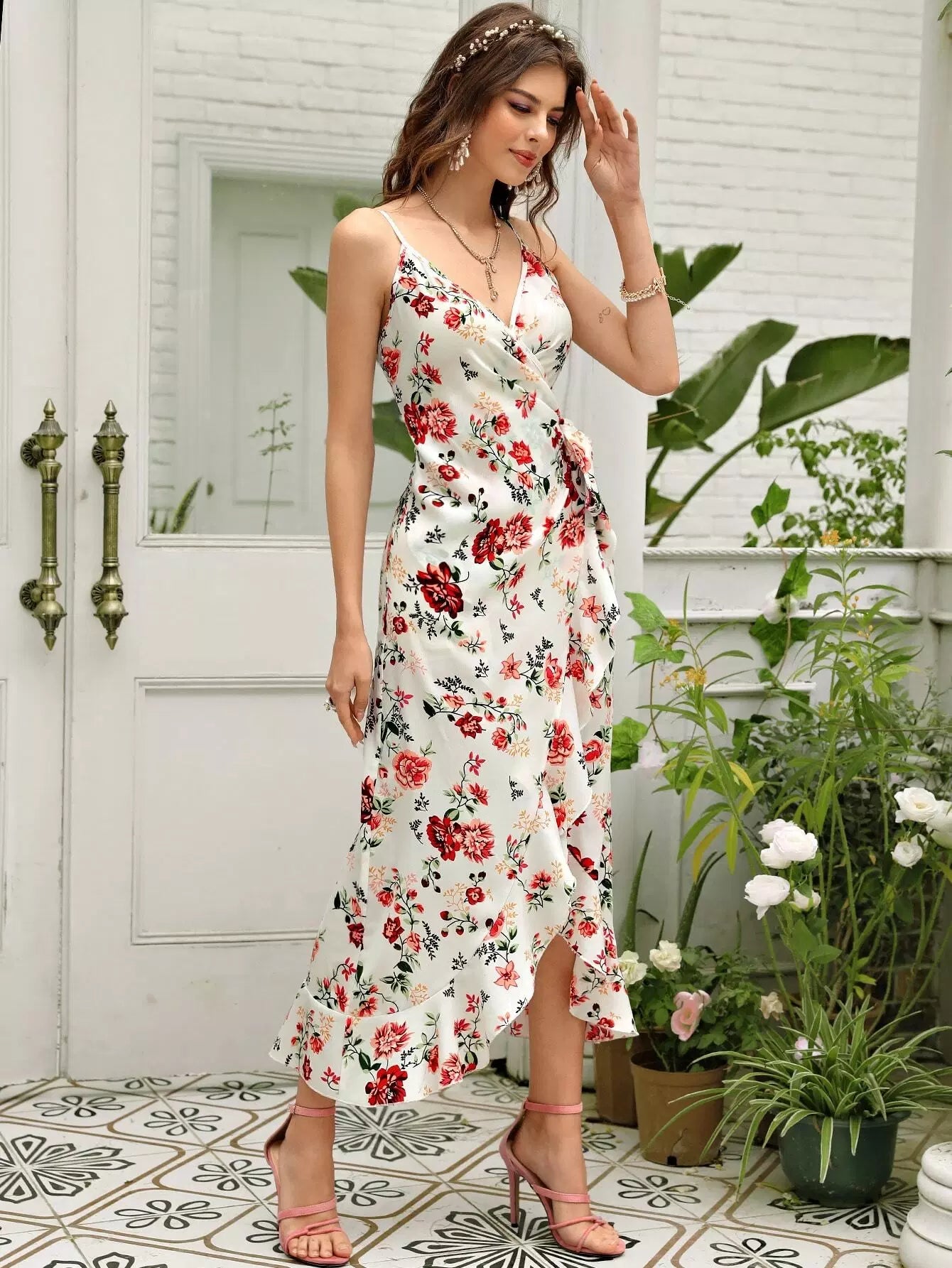 Floral Print Tie Side Asymmetrical Hem Wrap Cami Dress