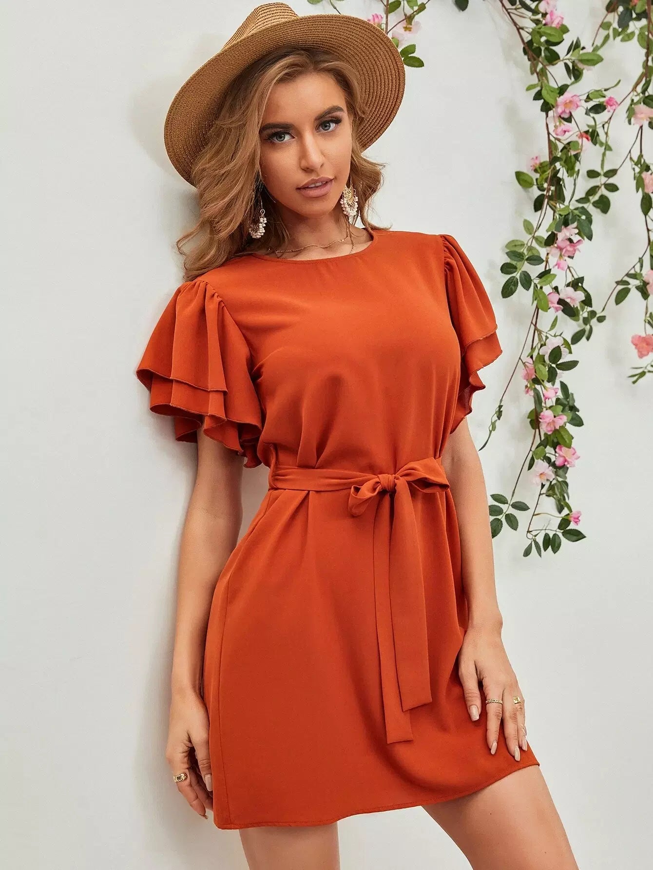 Flounce Sleeve Keyhole Back Dress Without Belt