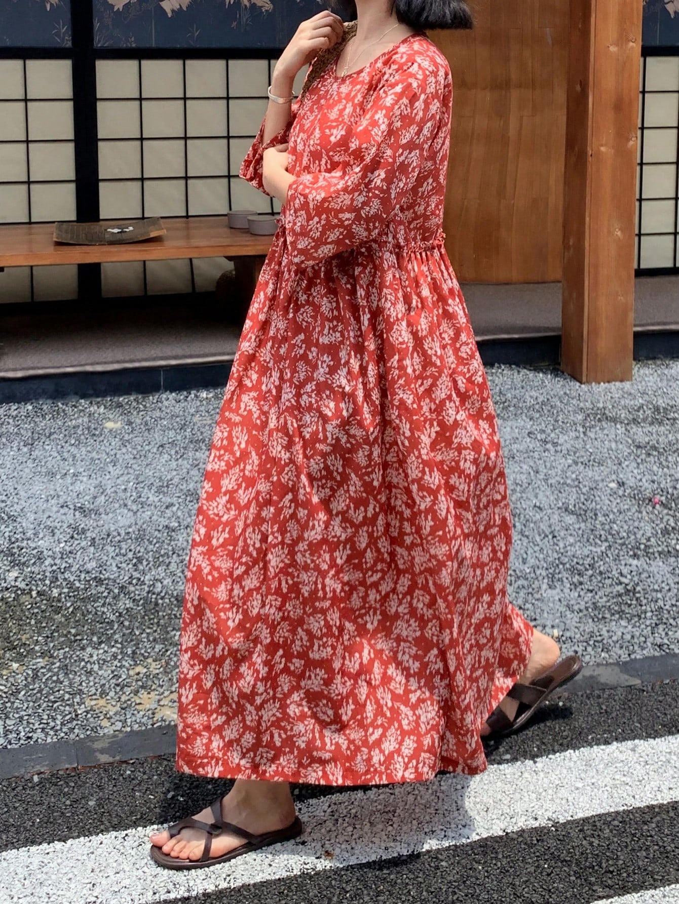FRIFUL Women Ditsy Floral Drawstring Waist Frill Trim Decor Dress, Holiday & Vacation Style