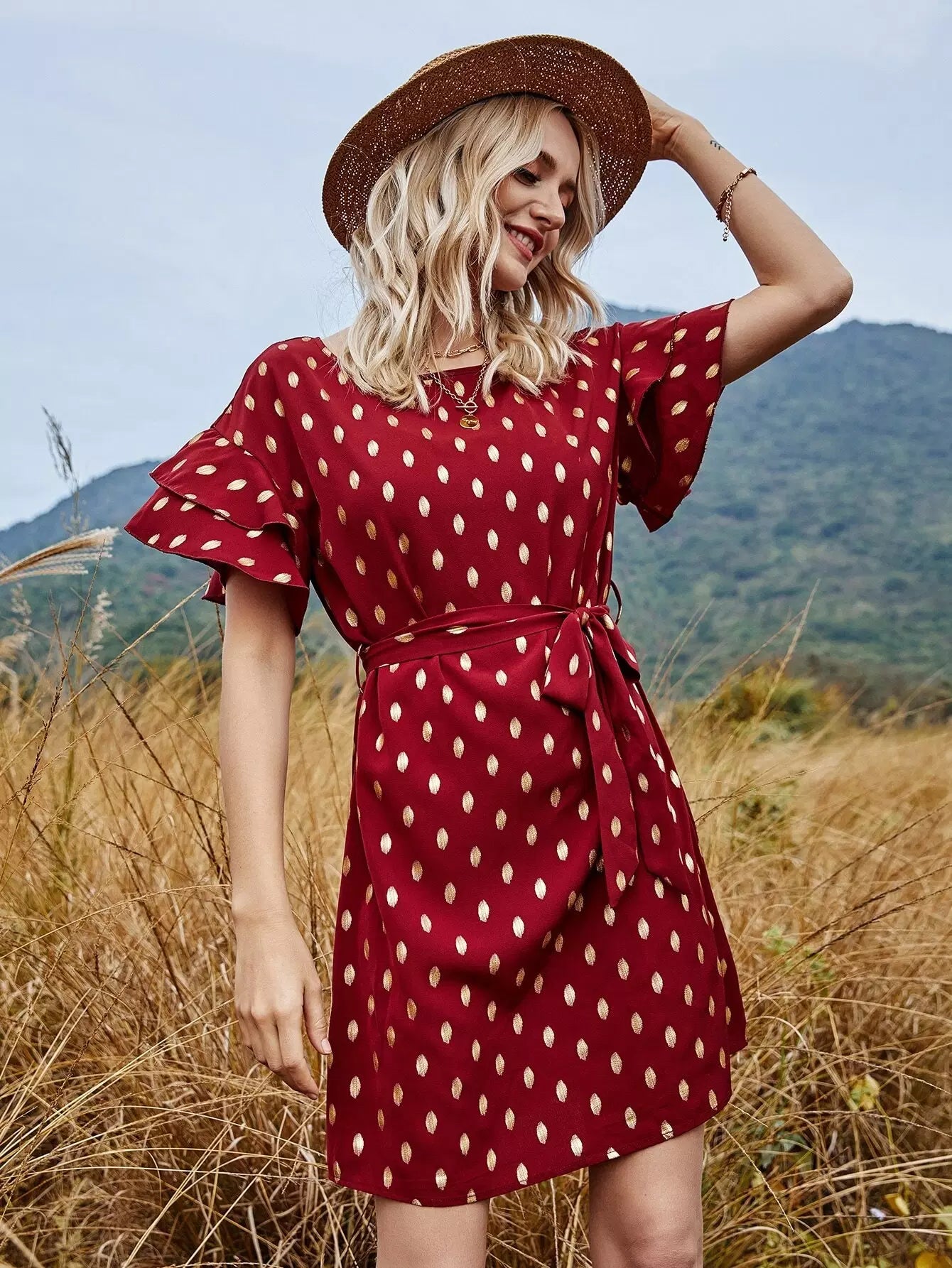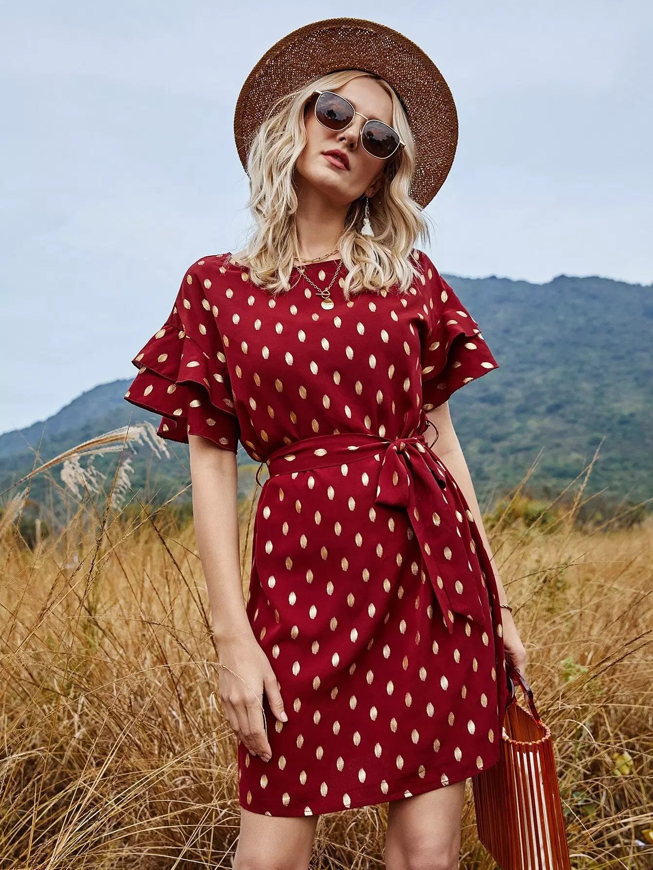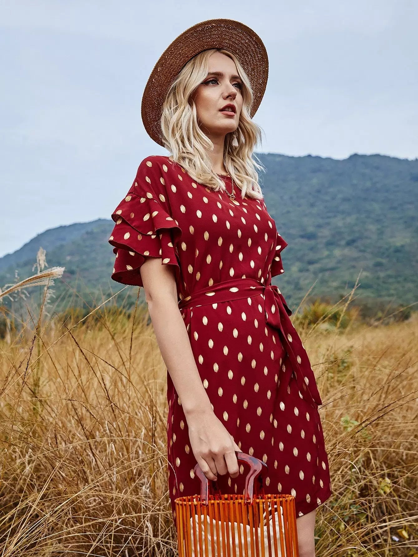 Women - Gilding Dot Layered Flounce Sleeve Belted Dress
