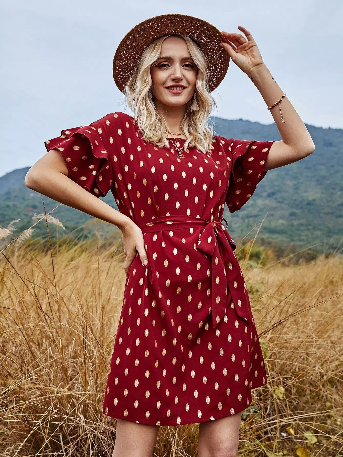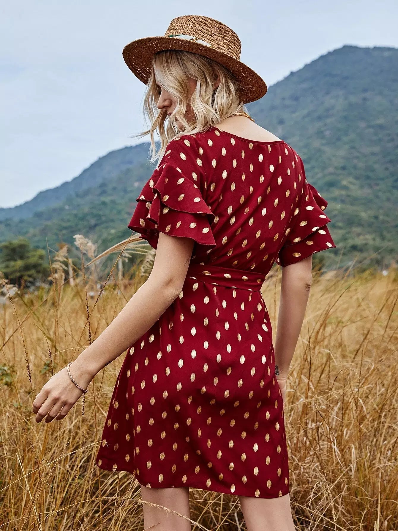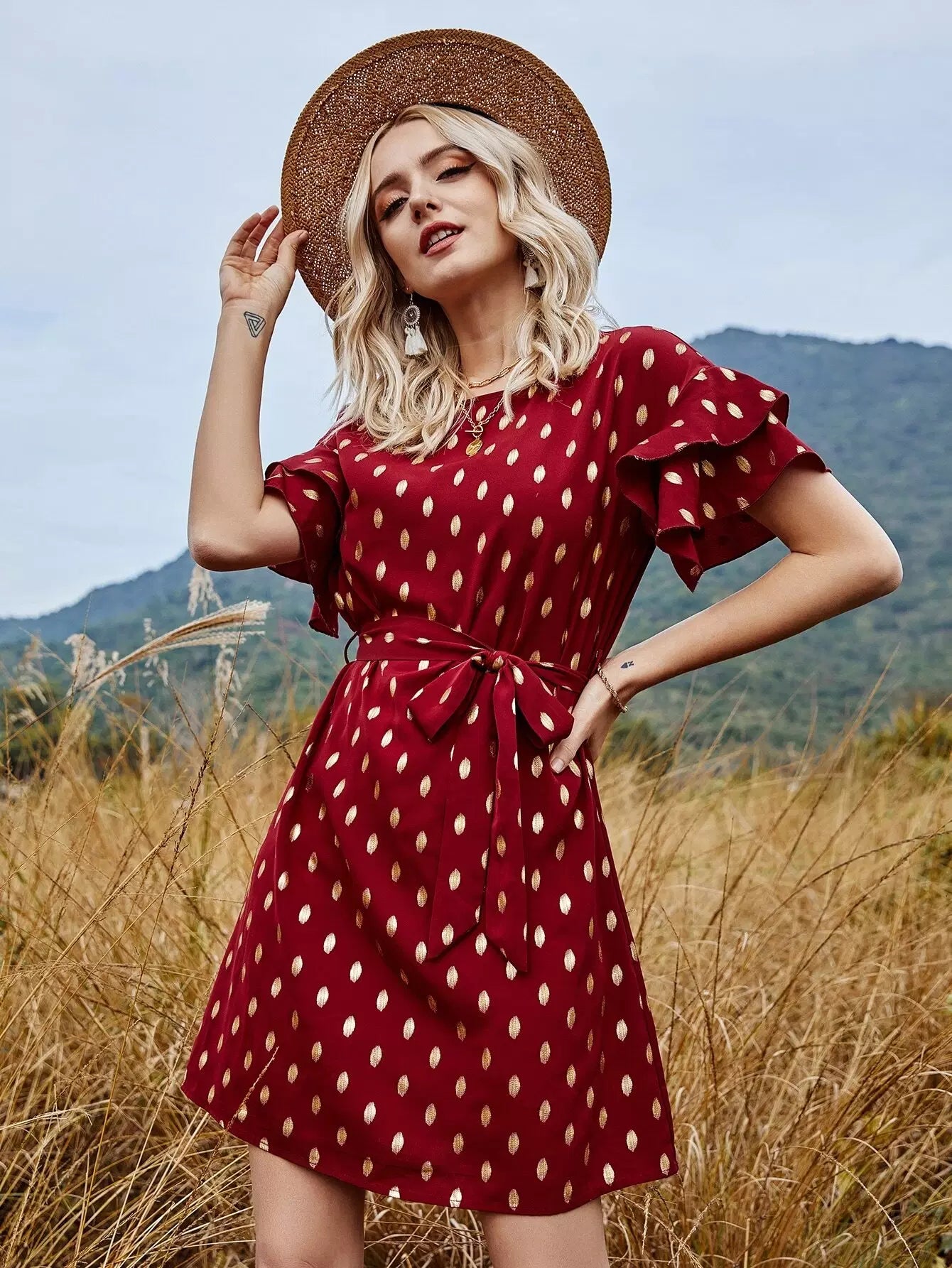 Women - Gilding Dot Layered Flounce Sleeve Belted Dress